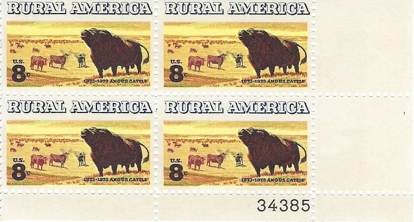 Rural America Angus Cattle Plate Block of 4 x 8 Cent US Postage Stamps, Scot 1504