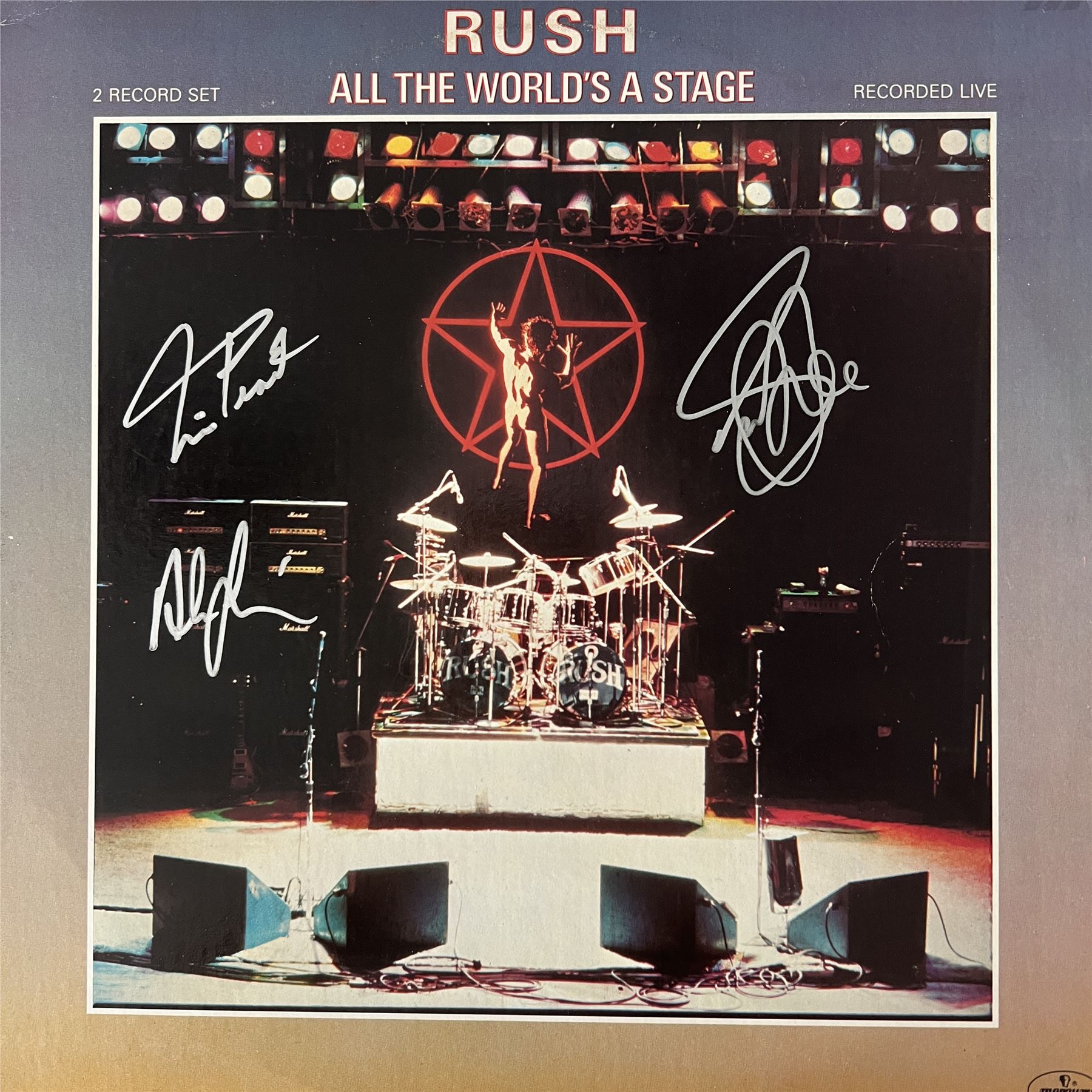 Rush All The World's A Stage signed album autographed by Alex Lifeson, Geddy Lee and Neil Peart. 12x12 inches vinyl included