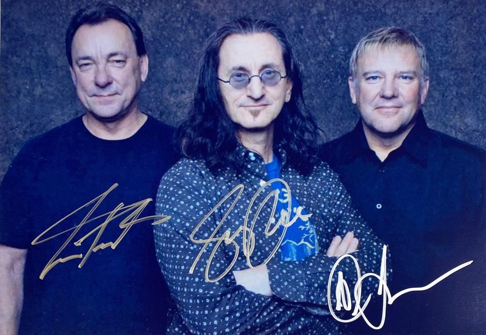 Rush band facsimile facsimile signed photo autographed by Neil Peart, Geddy Lee and Alex Lifeson. 8x10 inches. This item is a reprint of an original autograph