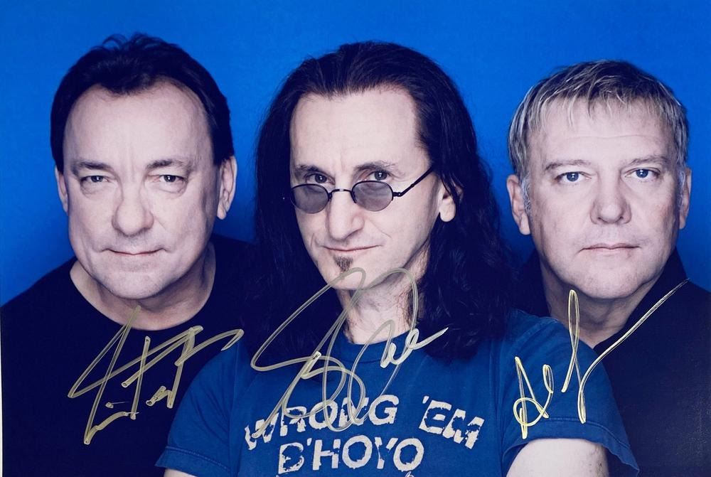 Rush band facsimile facsimile signed photo autographed by Neil Peart, Alex and Geddy Lee. 8x10 inches. This item is a reprint of an original autograph