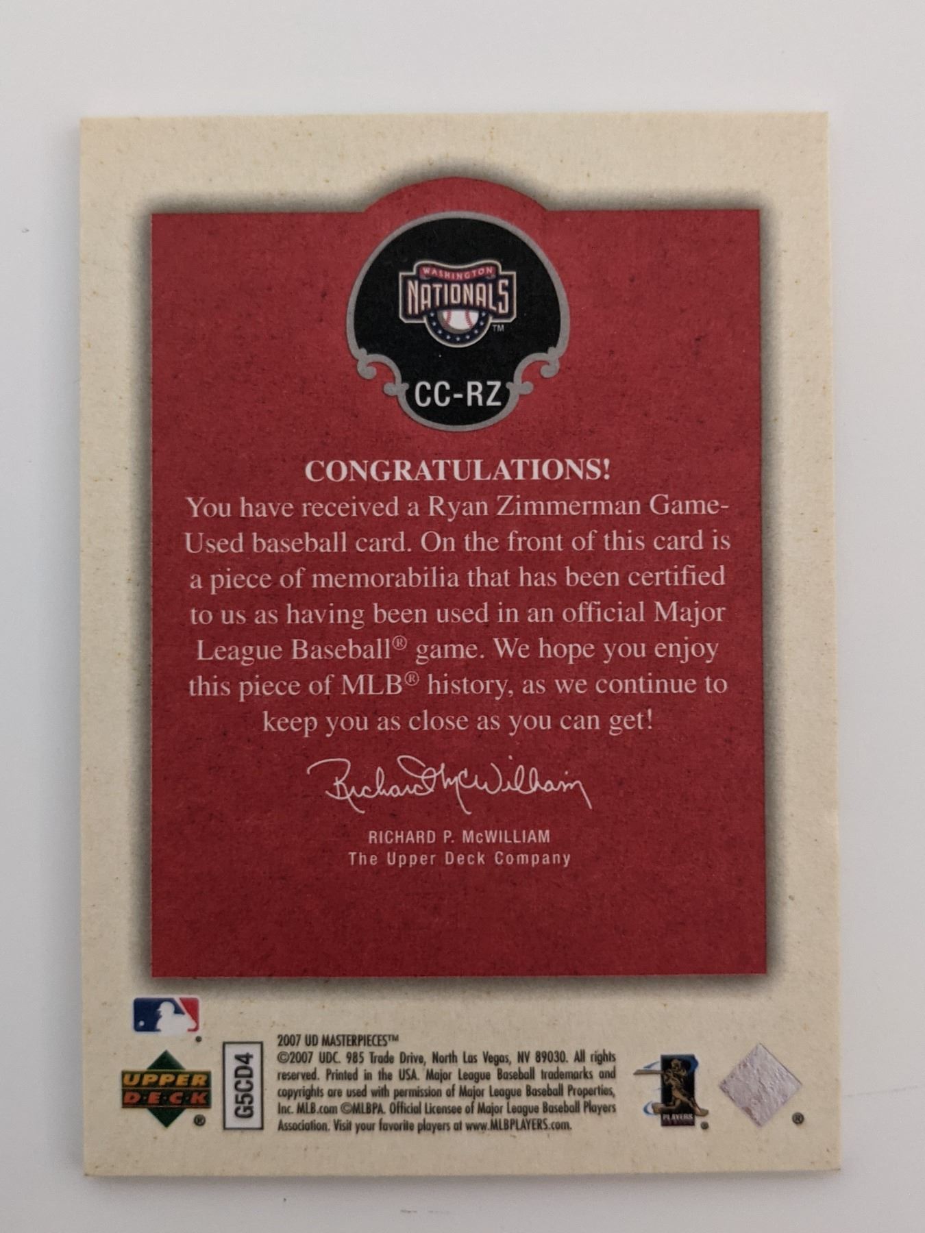 Ryan Zimmerman Baseball Trading Card with Game Used Jersey Swatch - Upper Deck UD Masterpieces #CC-RZ 2007