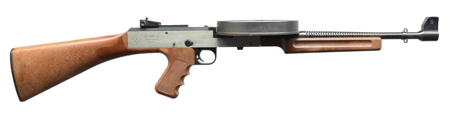 Cal. 22 LR. S# X024. Bbl. 16.5". Originally mfg. & imported from Austria, the earliest American 180 variants were classified as Dealer Samples due to the inability to import transferable machine guns after 1968. E&L mfg. started building a version in the United States & since they were domestic in mfg., these were fully transferable firearms. Research has indicated that approx. 24 examples were mfg. & registered by S&S Arms. It’s interesting to note that this particular gun bears the S# X024, possibly being the last firearm produced. The American 180 is an open bolt, select fire 22 LR buzz saw that feeds from a 176 rd., 3 tiered drum. The cyclic rate is often rumored to be in excess of 2000 RPM & a single burst in a full mag. is completed in only 7 seconds. The sound is as unique as its appearance, compared more to that of a chainsaw than a firearm because of the excessive cyclic rate. The bbl. is finned in a similar style to that of the legendary Thompson w/ a protected blade front sight & an adj. peep rear sight. The forend, pistol grip & shoulder stock are a brown plastic designed to imitate wood aesthetics. Pistol grip is checkered w/ finger grooves. Finish on all exposed metal parts w/ the exception of the natural finished aluminum receiver, is blued or black paint. Left side non reciprocating charging handle. Safety is located on the right side of the receiver. The selector is a cross slide pin. When pushed from left to right, full auto is selected & will continue to fire as long as trigger is held to the rear. When the pin is pushed in from the right, it is an open bolt semi auto action. The unique drum, w/ winding assembly is mounted on the top, above the chamber, forward of the trigger. The ejection port is below the firearm forward of the trigger. Receiver marked on left side w/ name of previous owner tastefully engraved just above ejection port. Right rear markings are "AMERICAN 180" over "X024". Right side receiver markings include "S&S" logo & "S&S ARMS CO."/ "ALBUQUERQUE, NM"/ "U.S.A.". Bbl. marked on top w/ 2 indistinguishable marks, "73" & "AMERICAN INTERNATIONAL CORP"/ "SLC. UTAH USA"/ "A001881". Top of bbl. just rear of front sight marked "MADE IN AUSTRIA". Removable rear stock locks w/ a single pushbutton to the rear of the receiver similar to that of a Thompson SMG. Sling swivels front & rear on left side. MAGS: 2-176 rd. drums w/ 1 winder. UNATTACHED ACCESSORIES: 1 early Aimpoint original red dot sight. Function can’t be confirmed as an old battery appears to be lodged in the carriage. 1 Weaver 63B mount. Original Styrofoam packaging. CONDITION: original finish enjoys full coverage on exposed metal surfaces. No major visible flaws of any type. The only evidence of any use is a minute amount of powder fouling in the feed area. Plastic furniture exhibits only light handling marks, however the rear portion of the shoulder stock leans more towards a matte finish. Fire control mechanism appears to function correctly when cycled by hand, though a proper modern cleaning may be in order. Both drums appear to have seen little use & both rotate freely. NATIONAL FIREARMS ACT SMG REQUIRING BATF TRANSFER BEFORE TAKING POSSESSION. FULLY TRANSFERABLE. (03-1486/JZ). MODERN CLASS III. $6,000-9,000.