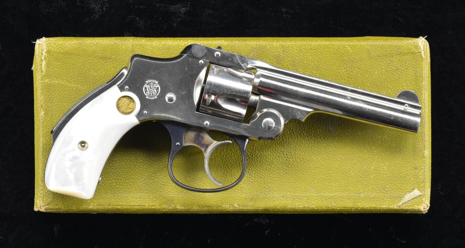 Cal. 32 S&W. S# 142537. Bbl. 3 1/2" w/ pinned half moon blade sight plus notch in T shaped latch. Mfg. 1902-1909; 78,500 units. Nickel plated w/ pearl grips having gold S&W medallions. Case colored trigger plus blued trigger guard & bbl. latch. UNATTACHED ACCESSORIES: very good original box w/ 'PEARL' on bottom plus "APR" (both faint). Caution paper about inferior non factory pearl grips. Bottle style bore brush. Proper "NEW DEPARTURE" label; no S# markings. CONDITION: Appears unfired w/ near excellent bore & grips. Cyl. has some very small points of finish loss. PROVENANCE: Estate Collection of Kenneth Horn (Grandson of JC Higgins). (22-473/NW). CURIO. $600-900.