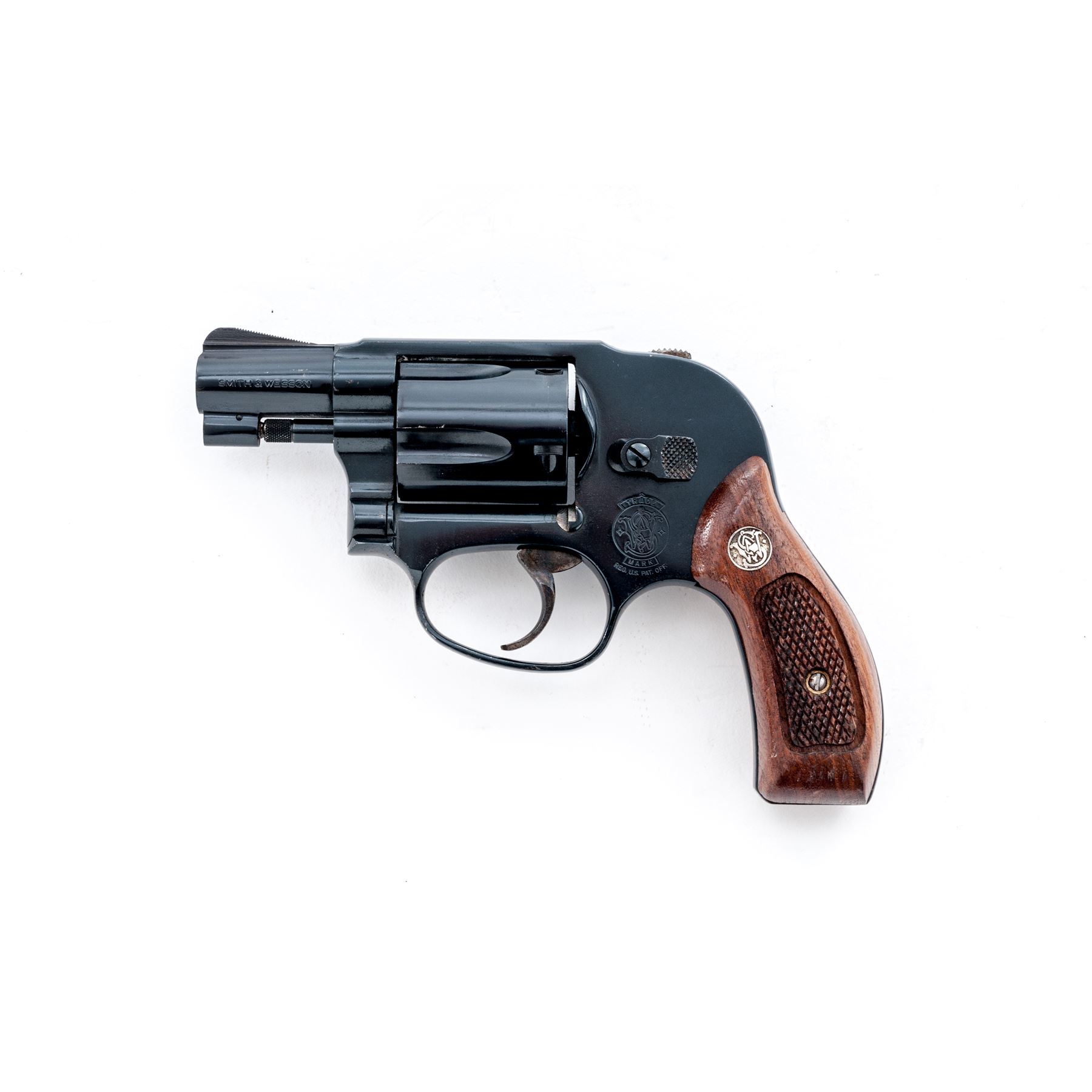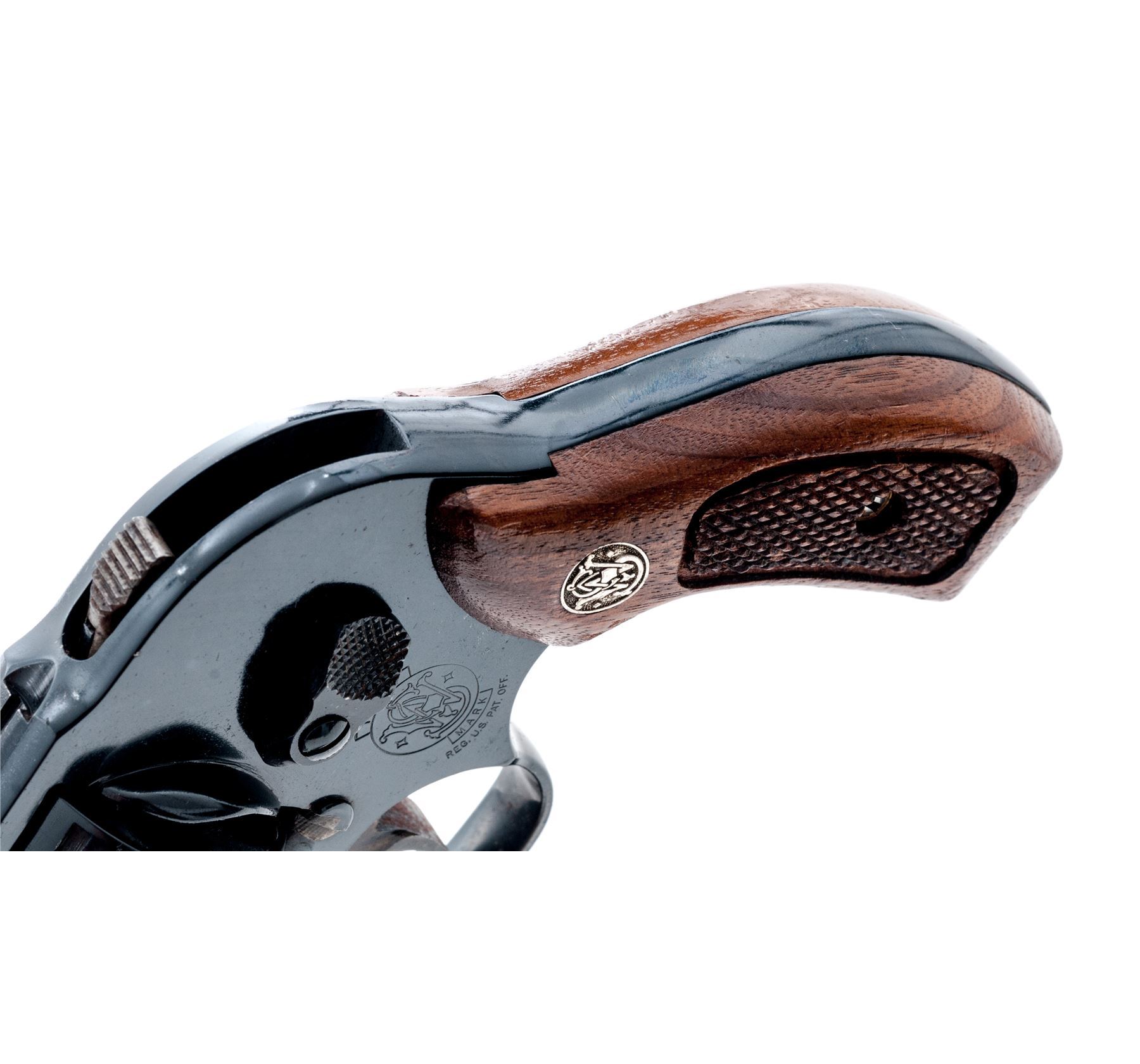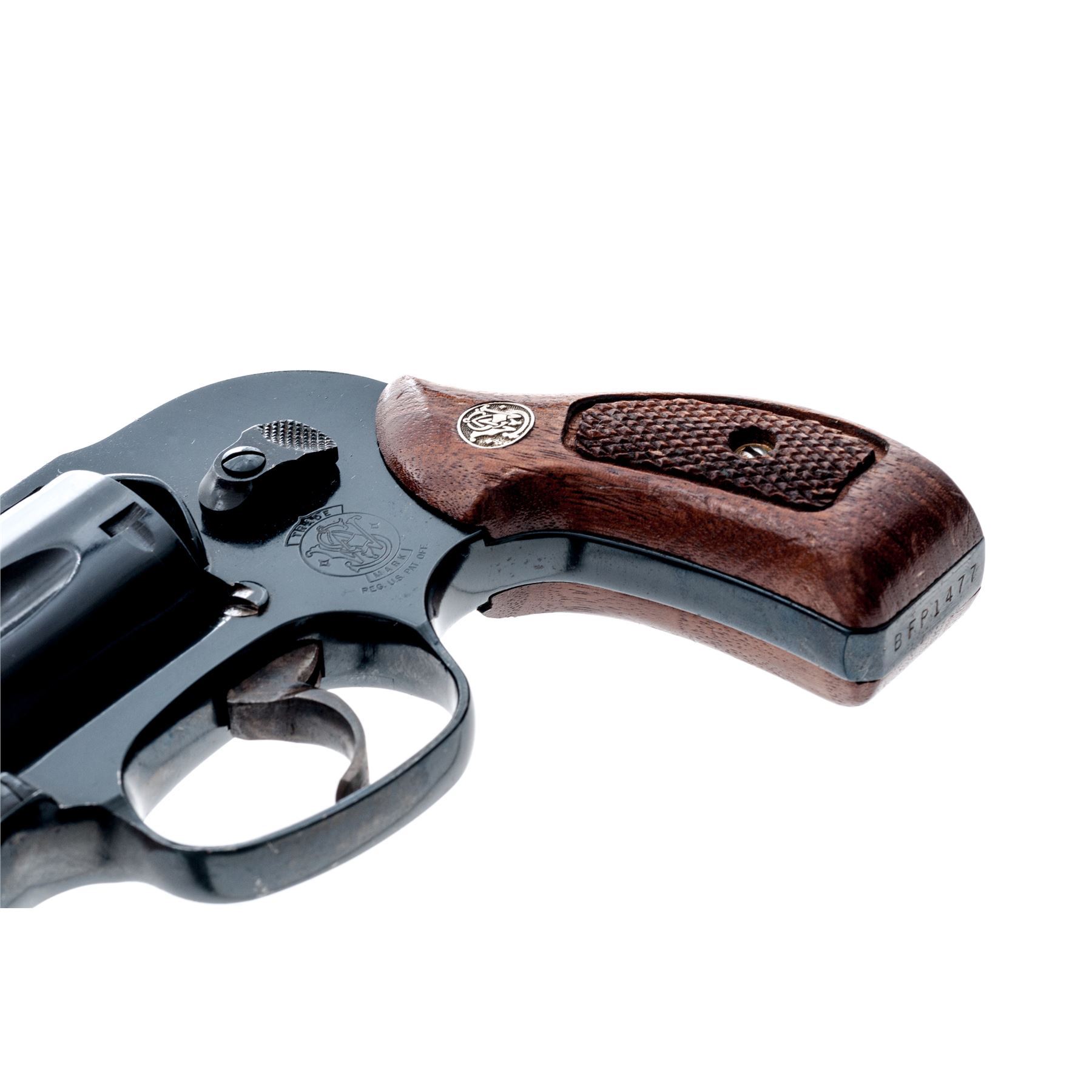 Smith & Wesson Model 40-1 Centennial Double Action Revolver, #BFP1477, .38 Spec. cal., 1-7/8'' barrel, blue finish, factory checkered walnut grips with S&W medallions, smooth color case hardened trigger, shrouded hammer. Condition is good retaining approx. 93%-95% original blue, metal with general small surface nicks and scratches; sides of the grip frame underneath the grips are rusted and would improve with a good cleaning. All of the factory lettering is clear, screw head slots are straight. Grips retain most of their original finish with small impressions and other moderate handling wear. Crisp action, excellent bore. Est.: $250-$400. (Modern/PPT)