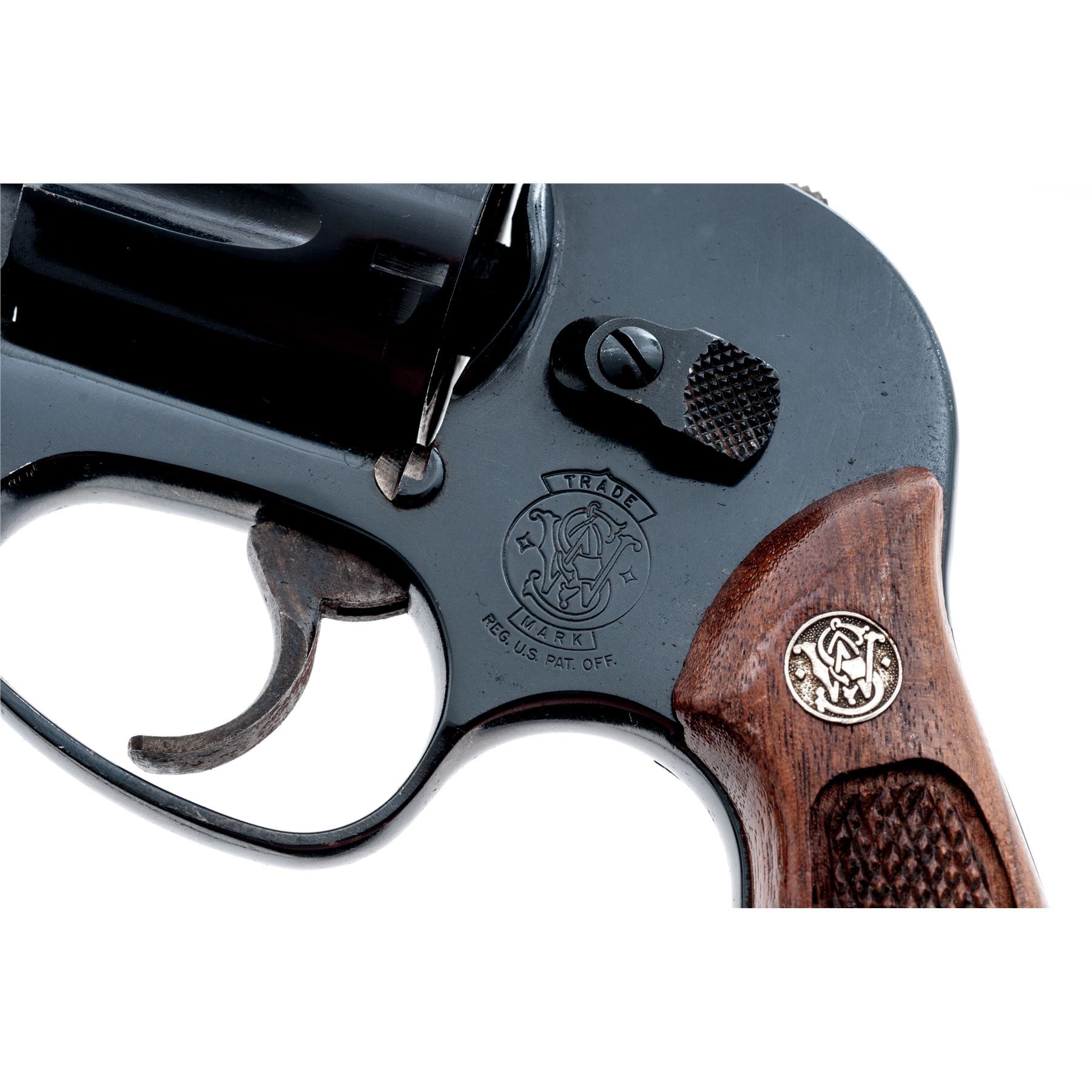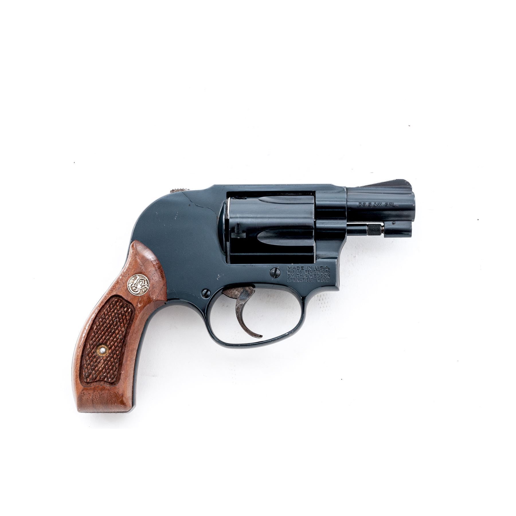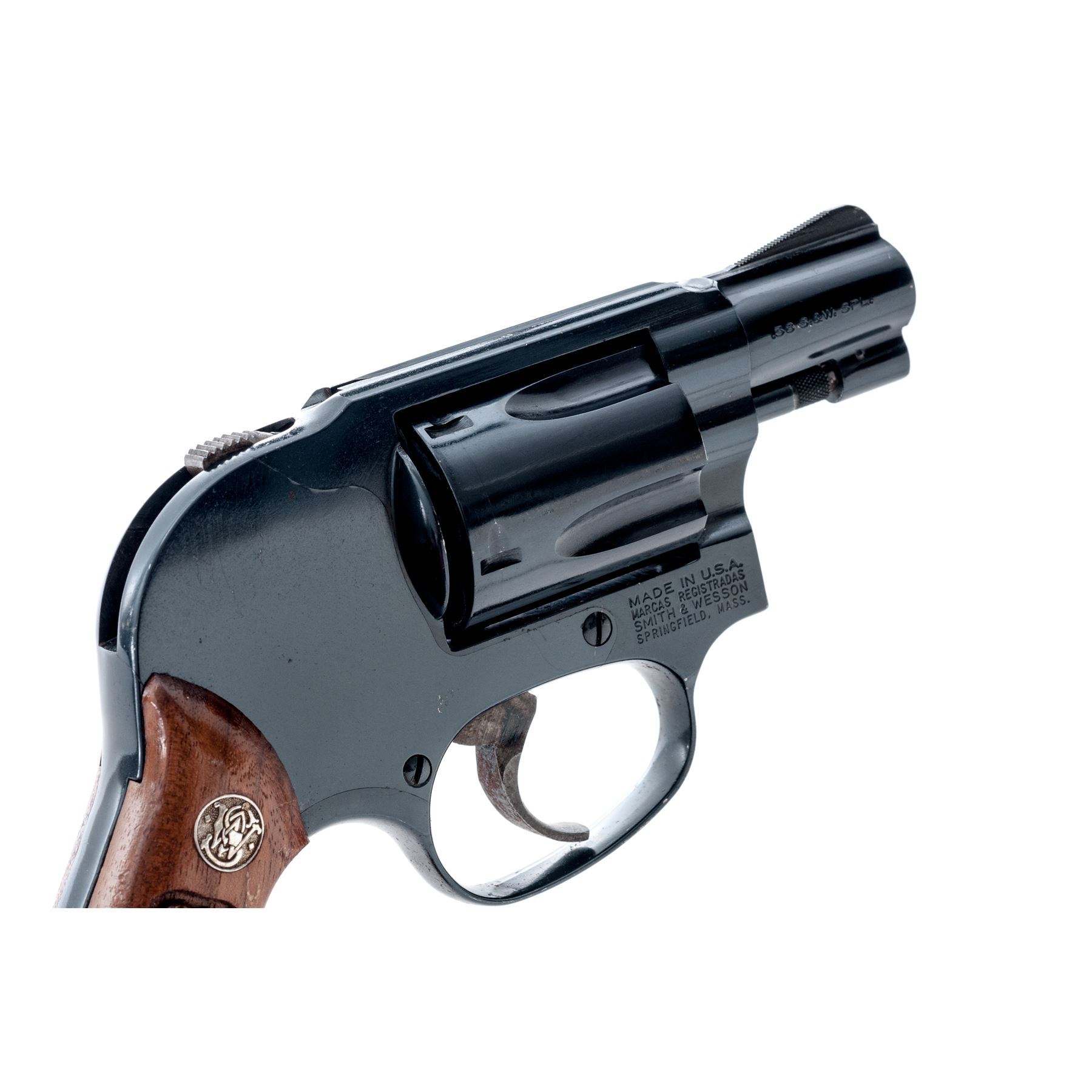 Smith & Wesson Model 40-1 Centennial Double Action Revolver, #BFP1477, .38 Spec. cal., 1-7/8'' barrel, blue finish, factory checkered walnut grips with S&W medallions, smooth color case hardened trigger, shrouded hammer. Condition is good retaining approx. 93%-95% original blue, metal with general small surface nicks and scratches; sides of the grip frame underneath the grips are rusted and would improve with a good cleaning. All of the factory lettering is clear, screw head slots are straight. Grips retain most of their original finish with small impressions and other moderate handling wear. Crisp action, excellent bore. Est.: $250-$400. (Modern/PPT)