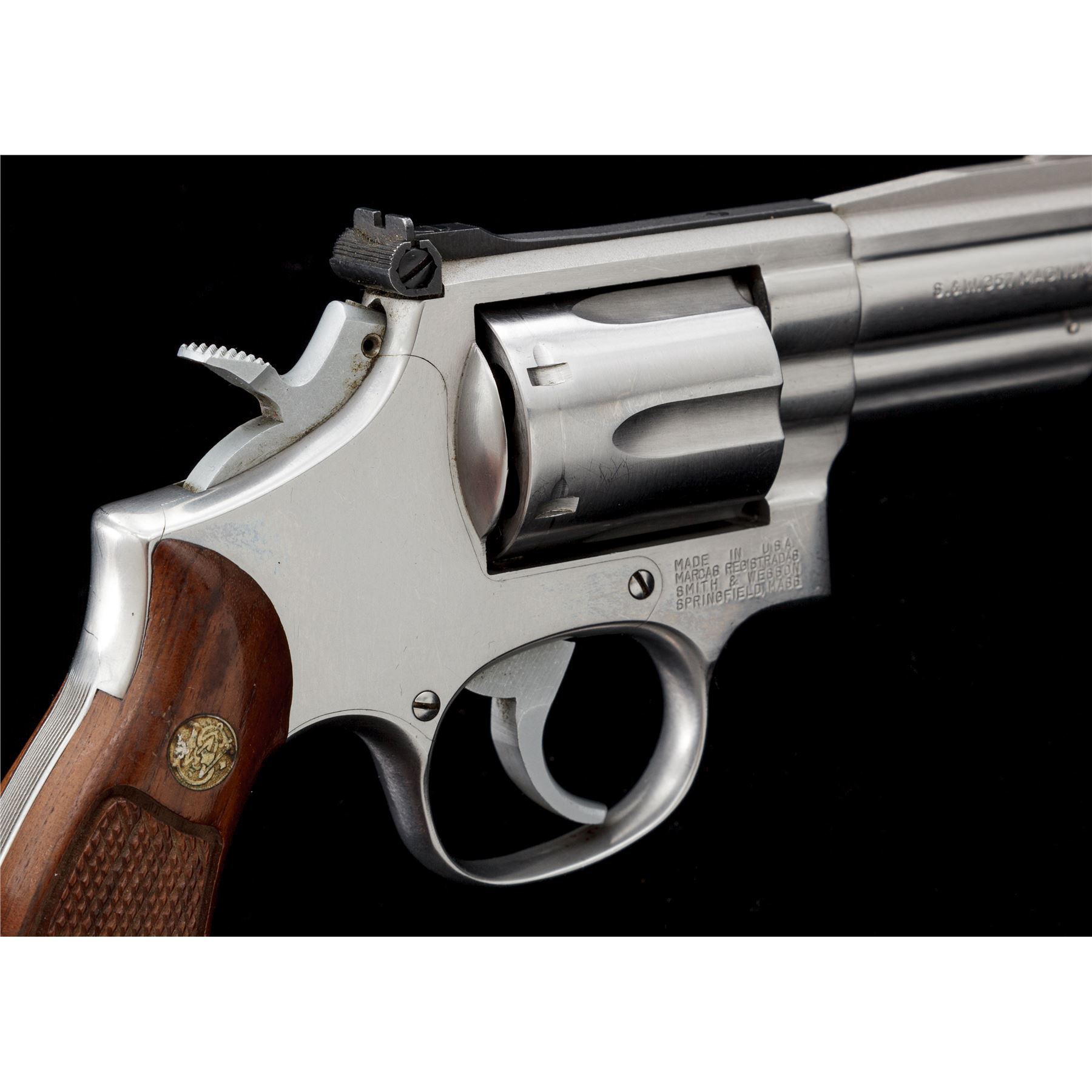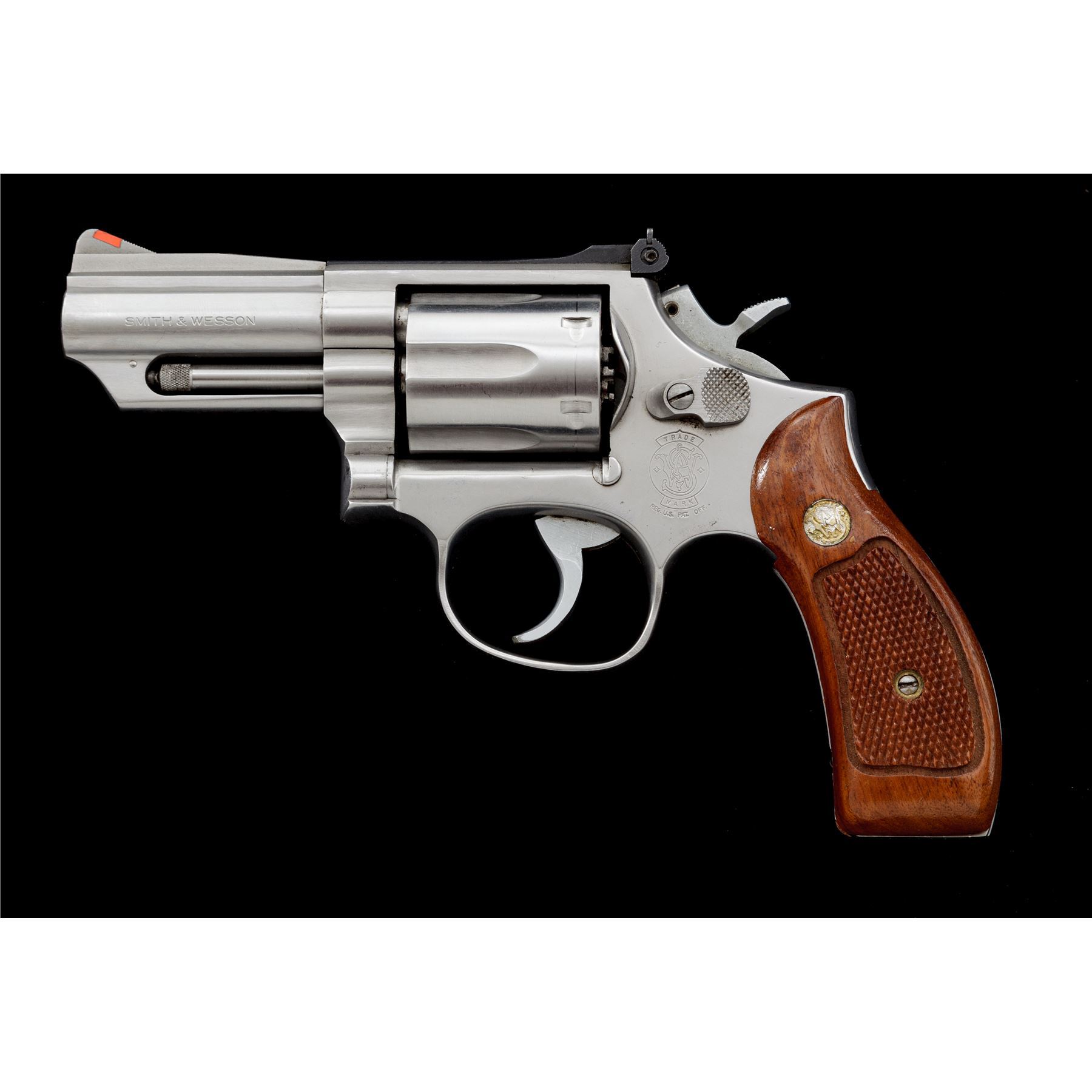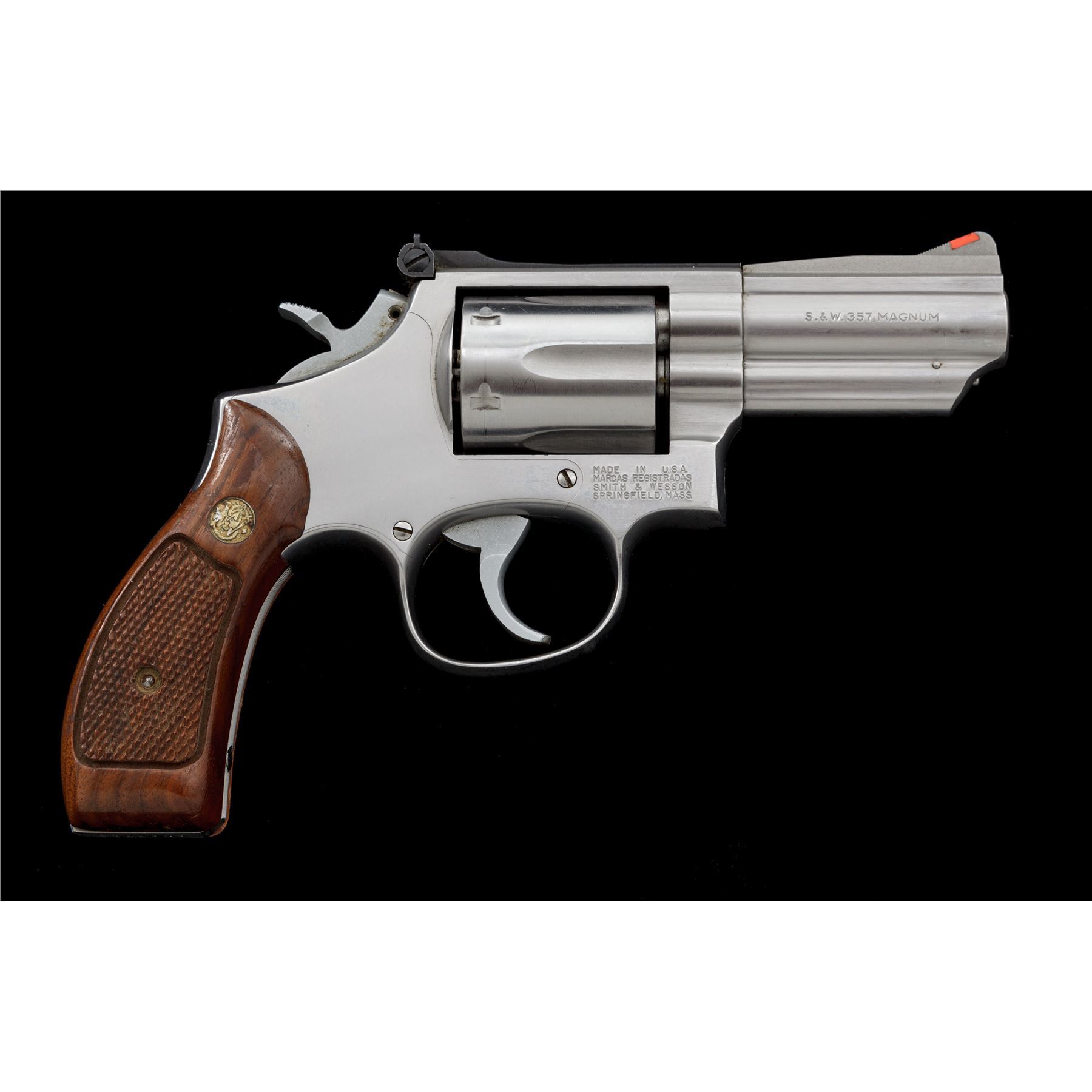 Smith & Wesson Model 66-2 Combat Magnum Revolver, with scarce 3'' barrel, double action, #ANA7713, .357 mag. cal., satin stainless steel, factory checkered round butt walnut grips with S&W medallions, red ramp front sight, micrometer click adjustable rear sight, non-counterbored cylinder stamped ''F'' on the face, smooth trigger, checkered semi-target hammer. Revolver rates as fine overall and shows signs of moderate range use. Metal with general slight micro-scratching and intermittent rub marks, most noticeable around the muzzle. Factory lettering is crisp. Left grip with a small spot of thinning towards the upper edge and otherwise both with only slight handling marks; checkering is clean and sharp. Excellent smooth action, cylinder face and inside the frame are clean, bright bore. Est.: $700-$900. (Modern/PPT)