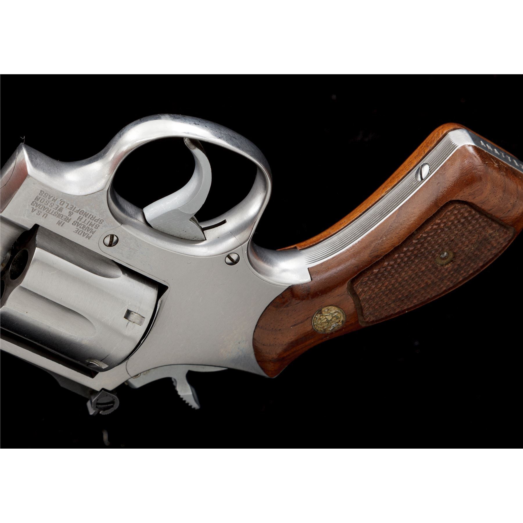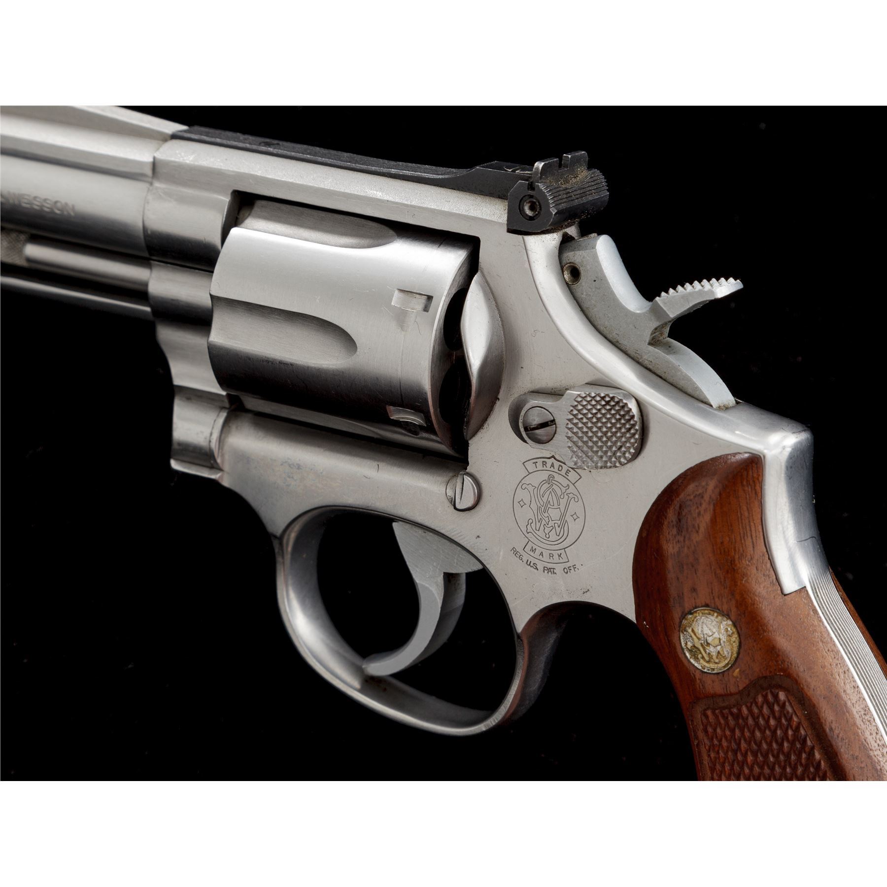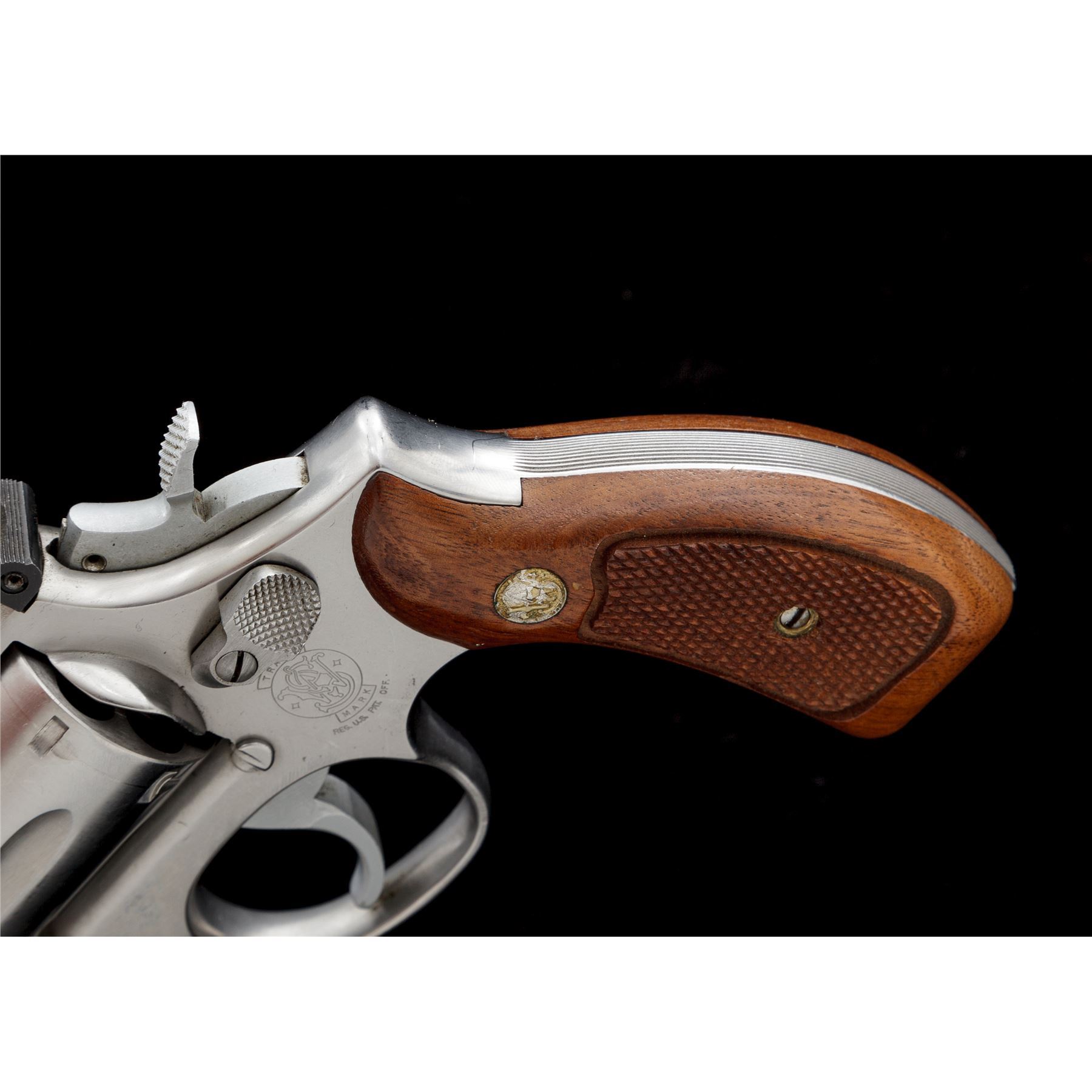 Smith & Wesson Model 66-2 Combat Magnum Revolver, with scarce 3'' barrel, double action, #ANA7713, .357 mag. cal., satin stainless steel, factory checkered round butt walnut grips with S&W medallions, red ramp front sight, micrometer click adjustable rear sight, non-counterbored cylinder stamped ''F'' on the face, smooth trigger, checkered semi-target hammer. Revolver rates as fine overall and shows signs of moderate range use. Metal with general slight micro-scratching and intermittent rub marks, most noticeable around the muzzle. Factory lettering is crisp. Left grip with a small spot of thinning towards the upper edge and otherwise both with only slight handling marks; checkering is clean and sharp. Excellent smooth action, cylinder face and inside the frame are clean, bright bore. Est.: $700-$900. (Modern/PPT)