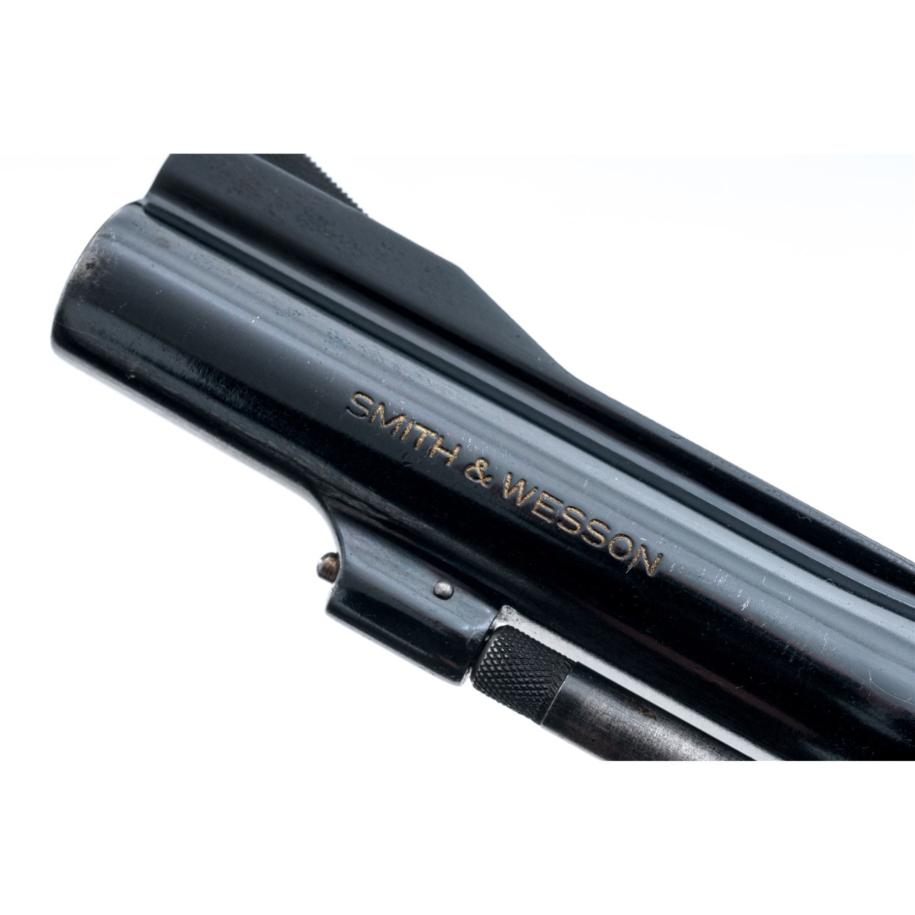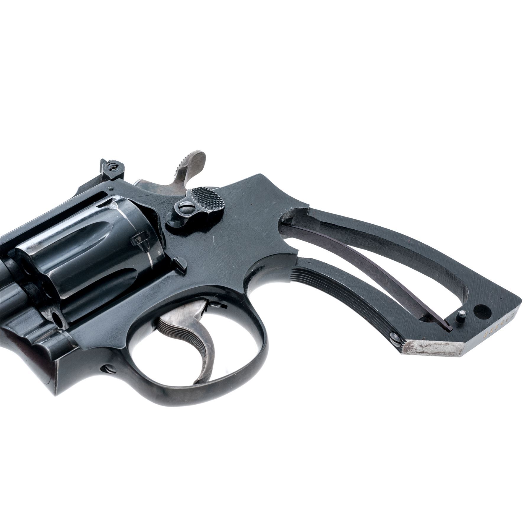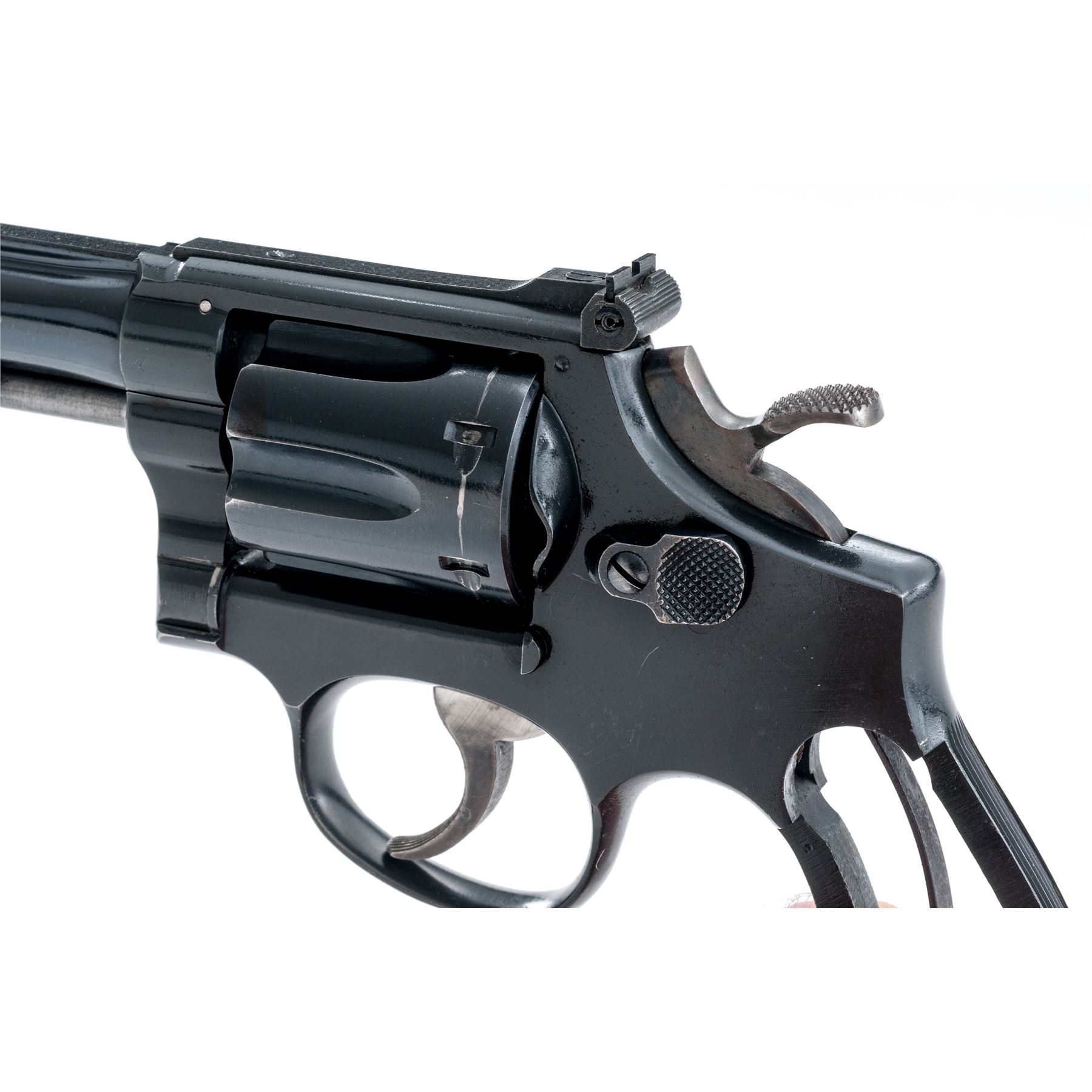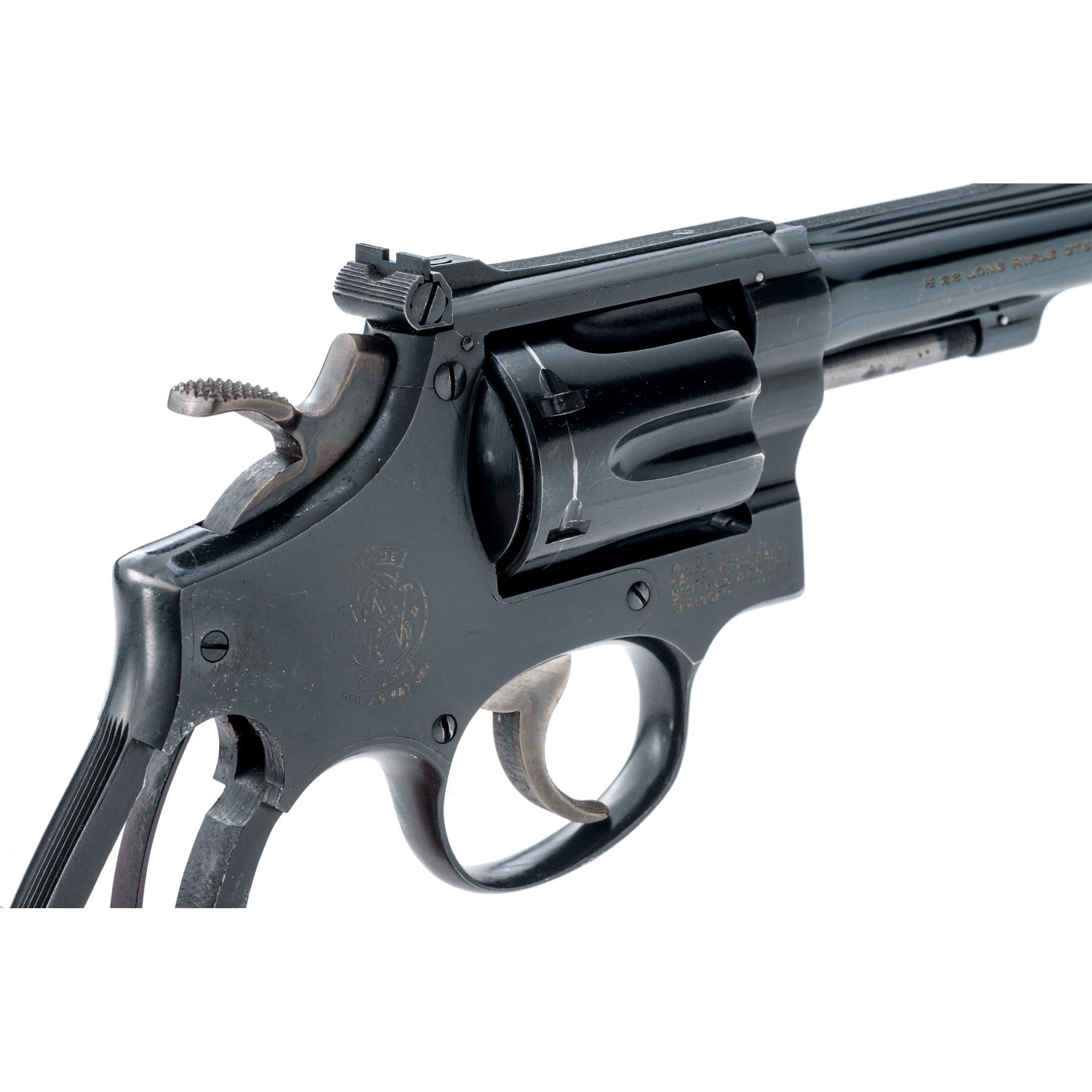 Smith & Wesson Pre-Model 18 Double Action Revolver, #215463, .22 LR cal., 4'' barrel, blue finish, factory adjustable rear sight, aftermarket thumbrest checkered hardwood grips. Condition is very good, with forward portion of grip frame modified with angle cut to accept aftermarket grips. Approx. 92% original blue is retained. Grips show minor flattening to checks and points of wear-thru to varnish near butt. Good action, bright bore. Est.: $450-$650. (C&R)