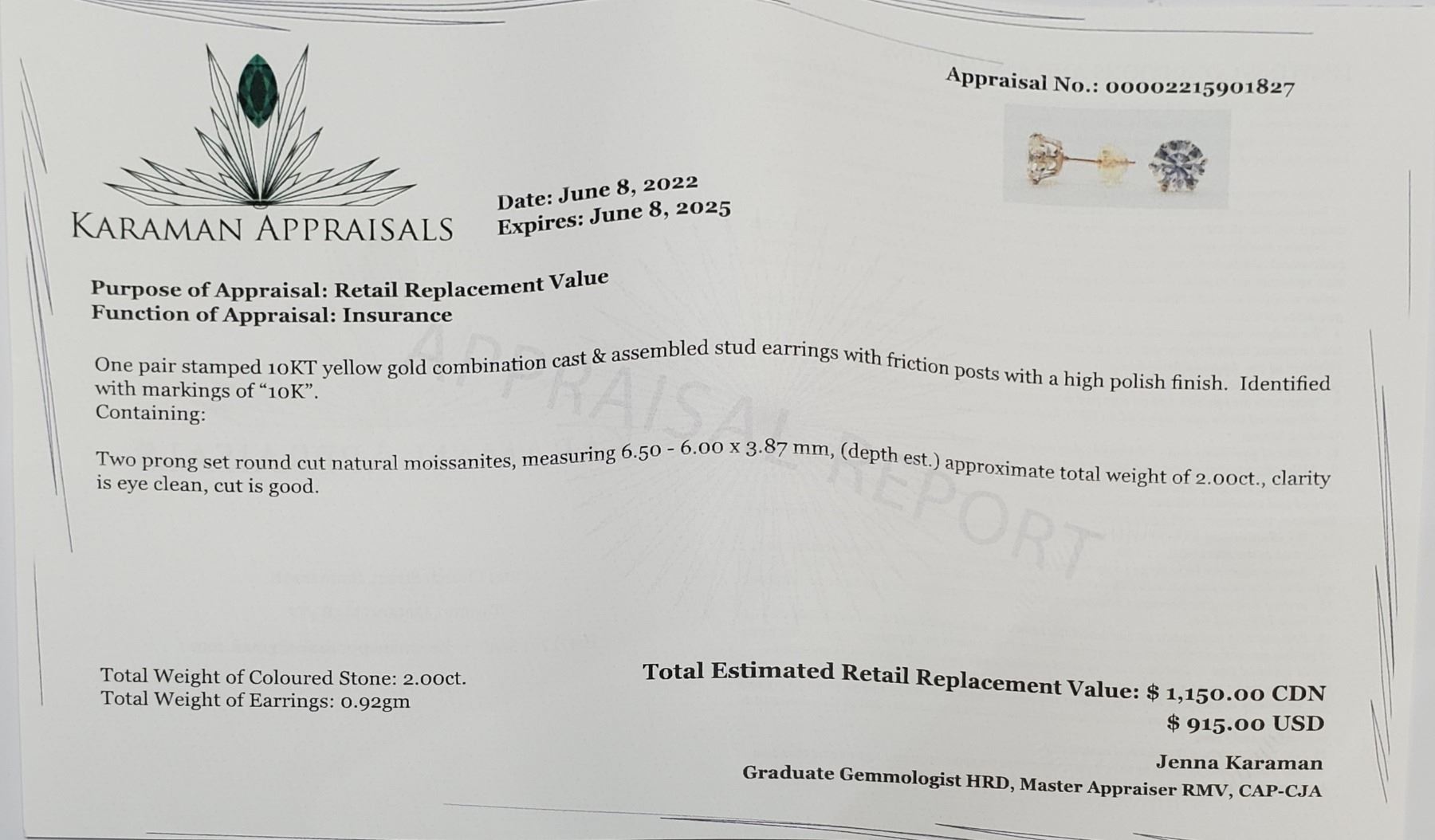 10K YELLOW GOLD MOISSANITE(2CT) EARRINGS WEIGHT 0.92G, MADE IN CANADA, APPRAISED RETAIL $1150 **ALL ITEMS MUST BE REMOVED BY 5PM SATURDAY, NOVEMBER 26TH, 2022. ALL REMAINING ITEMS WILL BE SUBJECT TO A $6.00 PER DAY STORAGE CHARGE. ANY ITEMS REMAINING AFTER MONDAY, DECEMBER 5, 2022 WILL BE CONSIDERED FORFEITED. NO REFUNDS WILL BE ISSUED FOR FORFEITED ITEMS. TO SCHEDULE A PICK UP APPOINTMENT CLICK HERE