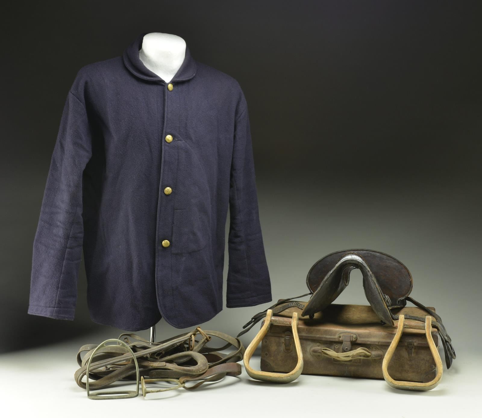 3) Dark blue coat w/ US Army buttons similar to Model 1858. Unsigned by user or maker. CONDITION: Good overall condition w/ tight stitching. (02-16857/MD). $200-400.