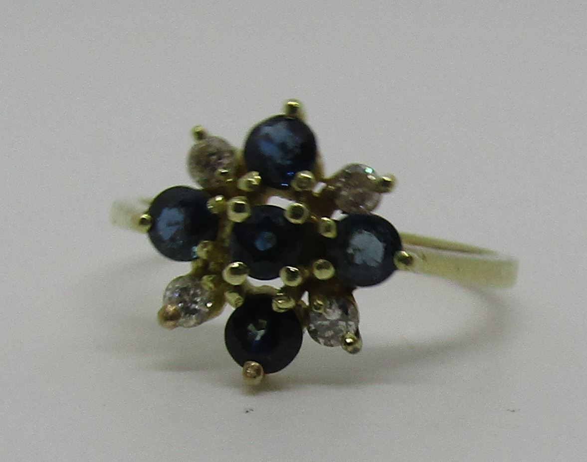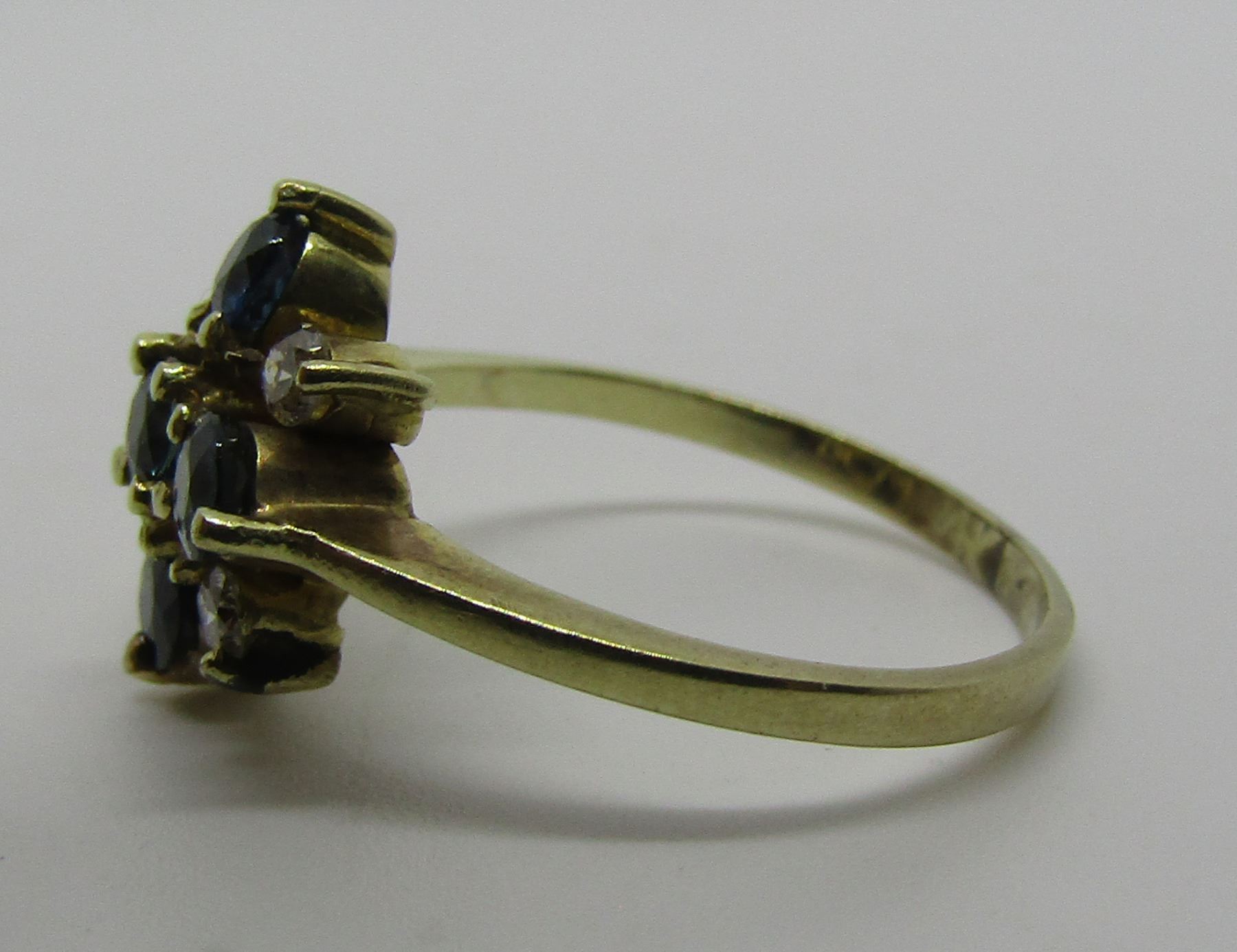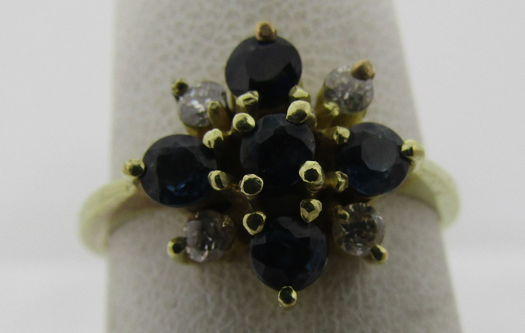 GENUINE 5 SAPPHIRES AND 4 DIAMOND RING. MARKED "K14 " YELLOW GOLD, WEIGHS 2 GRAMS. 11.5 MM WIDE. SIZE 6. EXCELLENT CONDITION VINTAGE ESTATE. USA SHIPPING $5