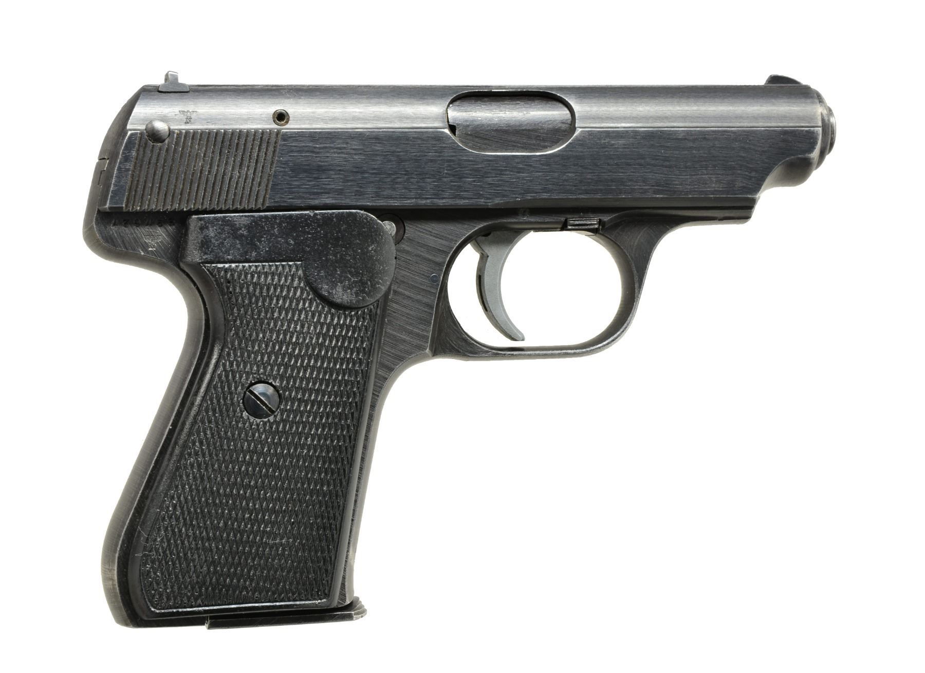 Cal. 7.65mm (32 ACP). S# 439463. Bbl. 3 1/4". Mfg. 1938-1945; type 4 variation made later in the war w/ expedient features of no slide legend, milled unpolished finish & zinc trigger. Left side of slide has cal. marking as does steel base of mag. Matching # slide w/ thumb safety; cocker / decocker on frame. Checkered black plastic grips w/ SS logo on left. Eagle 37 on left front of trigger guard plus eagle N on right rear of slide & frame. MAGS: 1 good late production factory 8 rd. w/ raised metal guide on right side. CONDITION: very good overall appearance w/ scattered high point wear & sm. rub spot on grips by SS logo. Very good plus bore. (21-1709/NW). CURIO. $600-900.