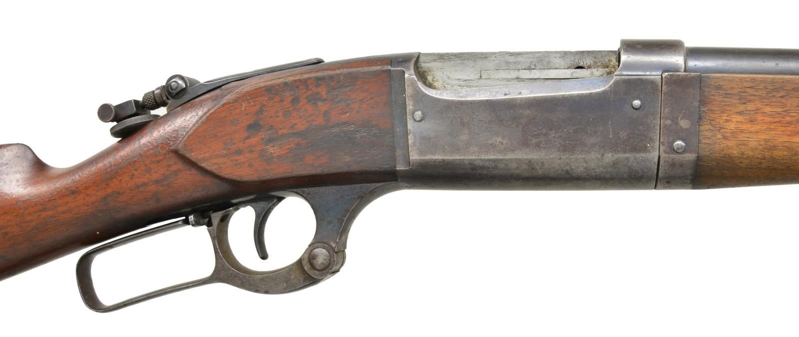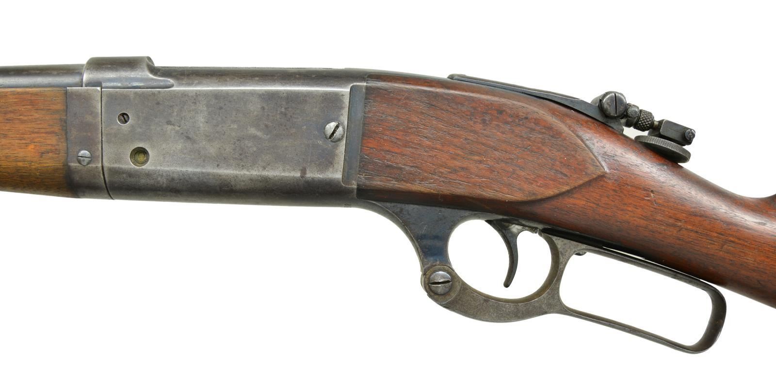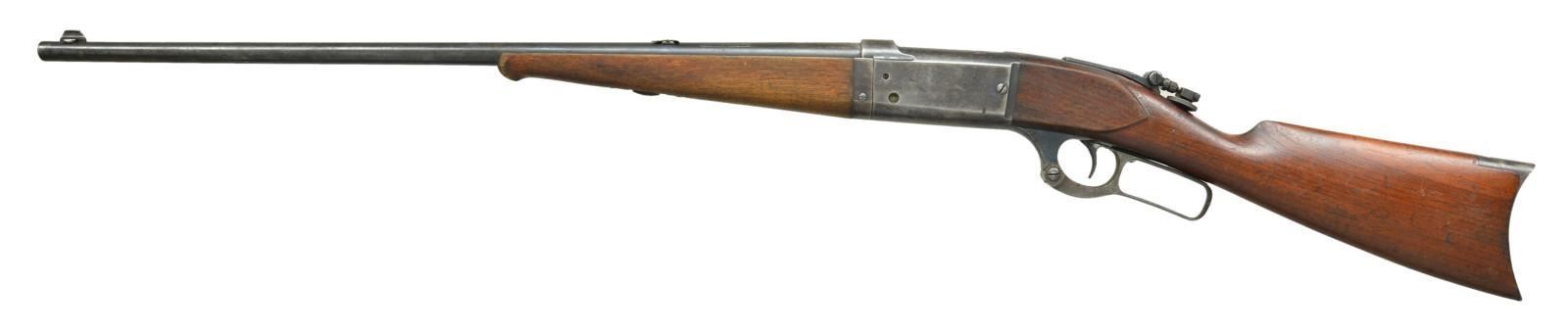 Cal. 303 Savage. S# 73.458. Bbl. 26" tapered rnd. Lyman No. 4 ivory bead hunting front sight w/ 2 folding leaf rear sight & combination tang sight. Action features rotary mag. w/ left side viewing window, case colored lever & bent tab safety. Schnabel tipped walnut forearm & straight grip perch belly walnut stock w/ crescent steel buttplate. Mfg. 1909, the first year of takedown production. CONDITION: 30% dull blue fading to gray showing light corrosion. Lever retains traces of case colors in protected areas. Wood has worn finish w/ numerous dents, scratches & marks. Stock has a sm. crack right of top tang. Sound action. Lightly worn bore. PROVENANCE: Estate Collection of Jack Verret Sr. (22-806/DS). CURIO. $500-700.