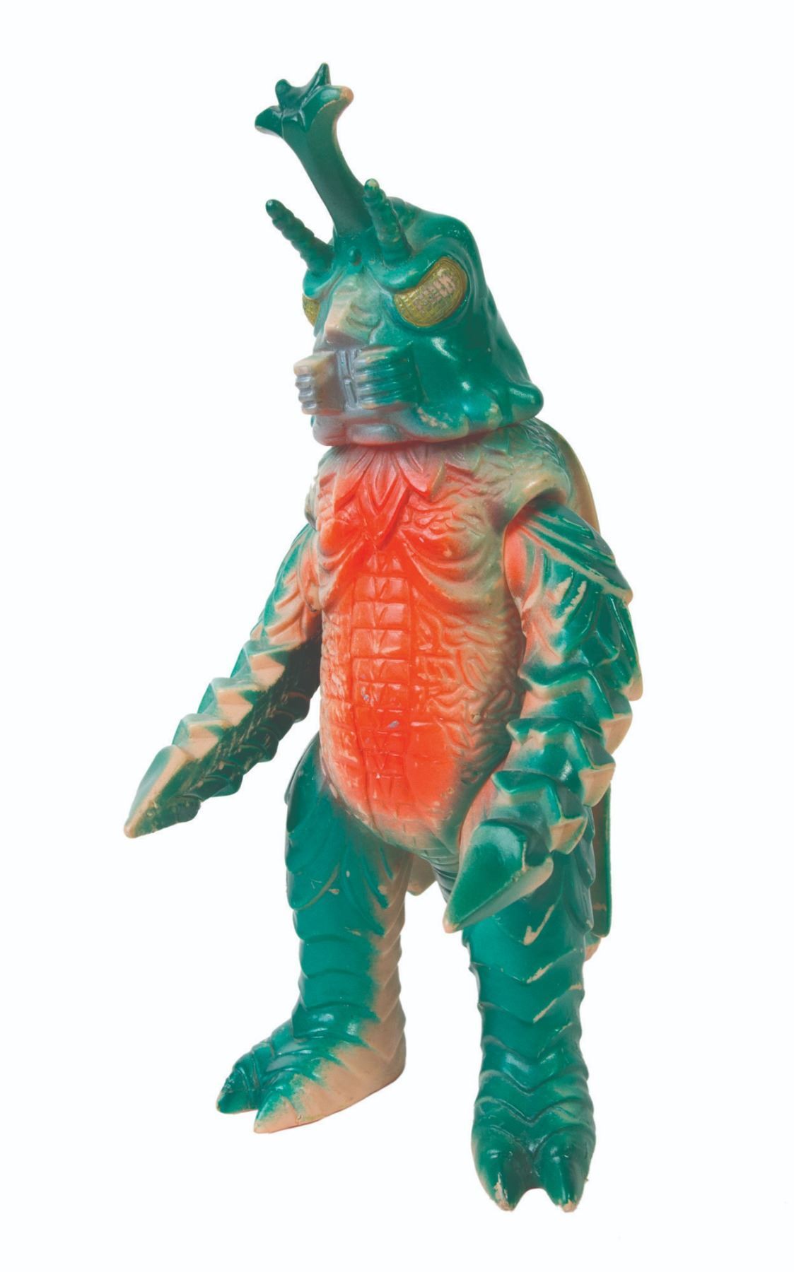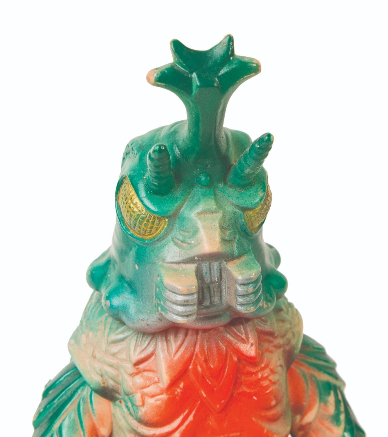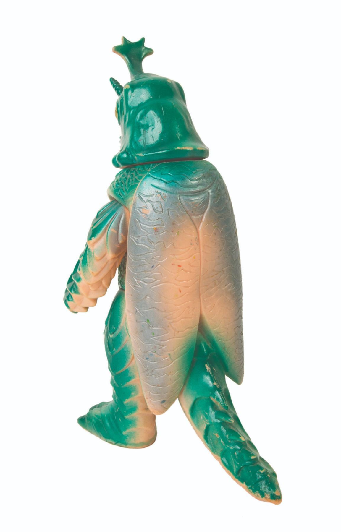 1970. Bullmark Vinyl Figure (Green)- This is the scarce first issue of Megalon, noted by the ‘undamaged’ horn. Subsequent to this first release, the mold was damaged in production and later issues of the figure feature an irrugularity in the star top of the horn. One of the most highly sought Godzilla vinyl figures by collectors. . 8. 5” tall. VG+.