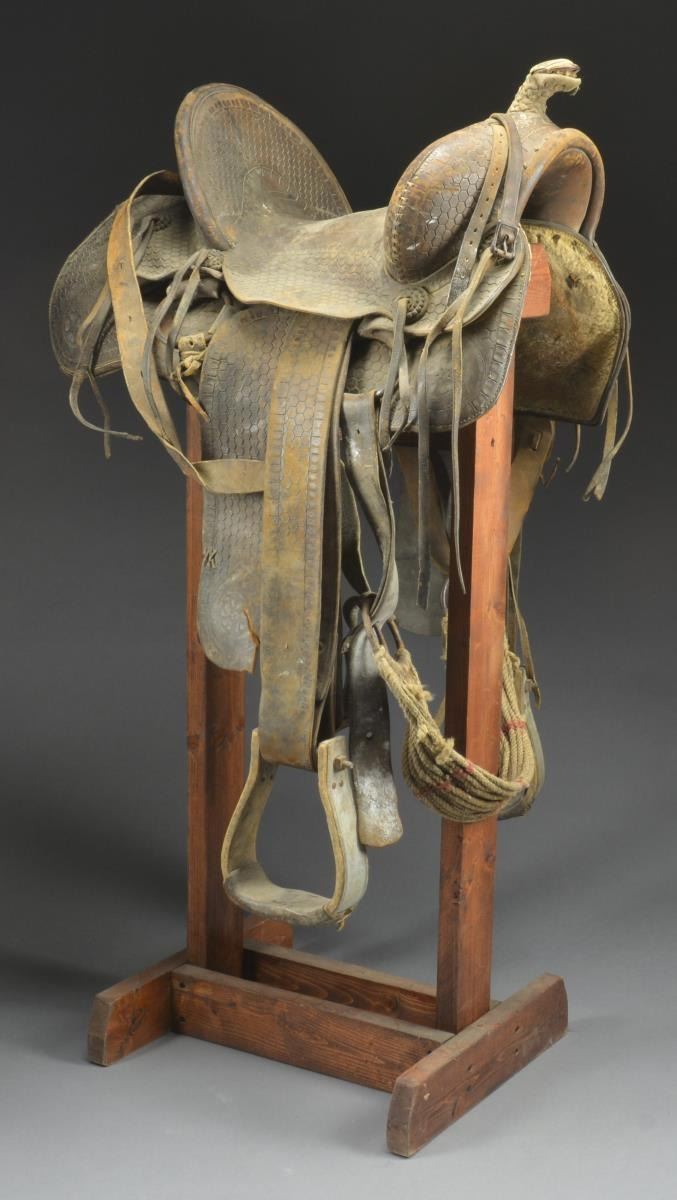 SADDLE. High quality handmade saddle by J.J. Stipek of Glendive, MT. Mr. Stipek came to Glendive in 1897 & established a reputation for the best handmade saddles to be had in that area. Mr. Stipek was a public spirited man who promoted Eastern Montana & was the founder in 1910 of the new town of Stipek. Saddle is marked on back of cantle "F.J. STIPEK WIBAUX MONT." Saddle has wooden stirrups reinforced by sheet metal & leather footpads. CONDITION: saddle is in well used "as found" condition w/ wear, detached straps, curling & buckling of leather parts. Cinch strap is detached. Notable tear in right fender. (02-15833/RW). $300-400.