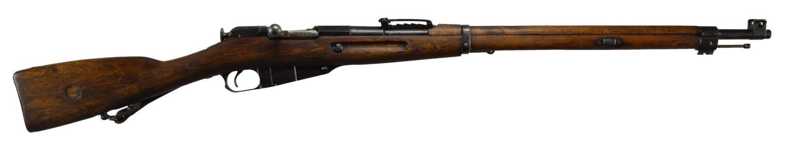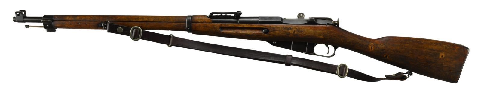 RIFLE. Cal. 7.62x54R. S# 0438. After Finland's independence in 1917 & recognition in 1919, the Army procured many small arms, including a considerable amount of Russian 1891 Three Line Mosin-Nagant rifles. Tikka & VKT were tasked w/ reconfiguring them to the Model 27 variation. Approx. 3,000 mfg. 1927-1934 (S# range 0001 to 3000). CAI imported 27" bbl. w/ protected blade front sight & ladder rear sight up to 3,000m. Bbl. shank w/ 1932 date. Rifle is configured w/ recycled hex receiver, mag. assembly, bolt (numbered to match), hardwood stock set & buttplate. Stock has earlier front band w/ bayonet lug, inletting for information disk (missing), & filled wood inlet for rear sling slot. Correct period SKT 32 marked leather sling on front swivel (in front sling slot), & toeline mounted sling swivel. CONDITION: good overall as arsenal refinished w/ marks & wear. Blue fading to gray/brown w/ edge wear & prior pitting evident on mag. assembly. Buttstock has 7" x 1.5" wood split w/ previous repair along w/ sm. cracks throughout. Good bore w/ strong rifling. (22-526/MD). CURIO. $600-900.
