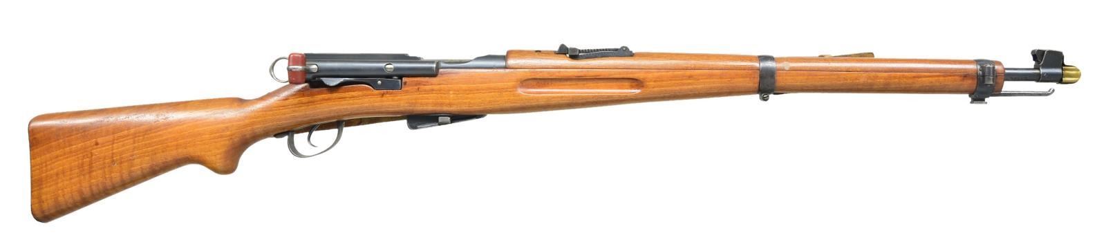 Cal. 7.5 Swiss. S# 53874. 23" Bbl. is fitted with tangent curve rear and square blade front sights. Straight pull action with front mounted locking lugs at front of bolt shroud. Straight pull action has lightening cuts. Receiver ring is stamped with Swiss proofs. Left side is stamped with serial number and "P" public domain mark. Nicely fiddle figured walnut stock is fitted with leather sling. Equipped with front sight protector. MAGS: 1. CONDITION: fine. All numbers match including magazine. Metal retains over 70% original blue. Stock with most of its oil finish has some minor marks. Bright shiny bore. Mechanically fine. PROVENANCE: from the estate collections of Charles P. Obremski. (22-1292/MGM). CURIO. $400-800.