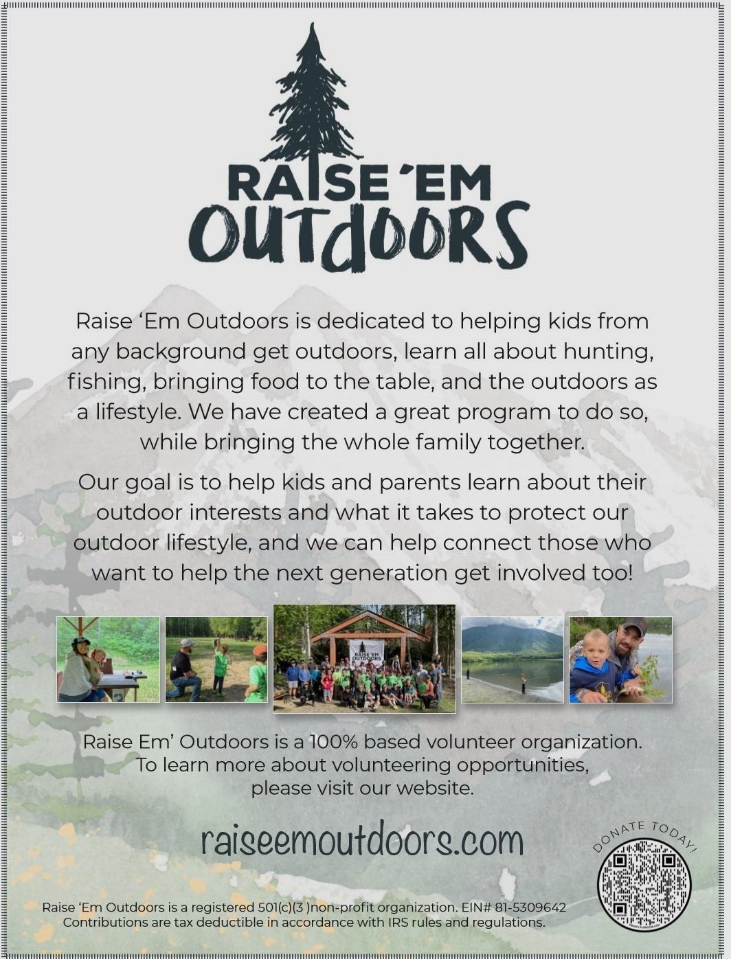 Raise ‘Em Outdoors is dedicated to helping kids from any background get outdoors, learn all about hunting, fishing, bringing food to the table and the Outdoors Lifestyle. Their goal is to help kids and parents learn about and find a new passion in the Outdoors!