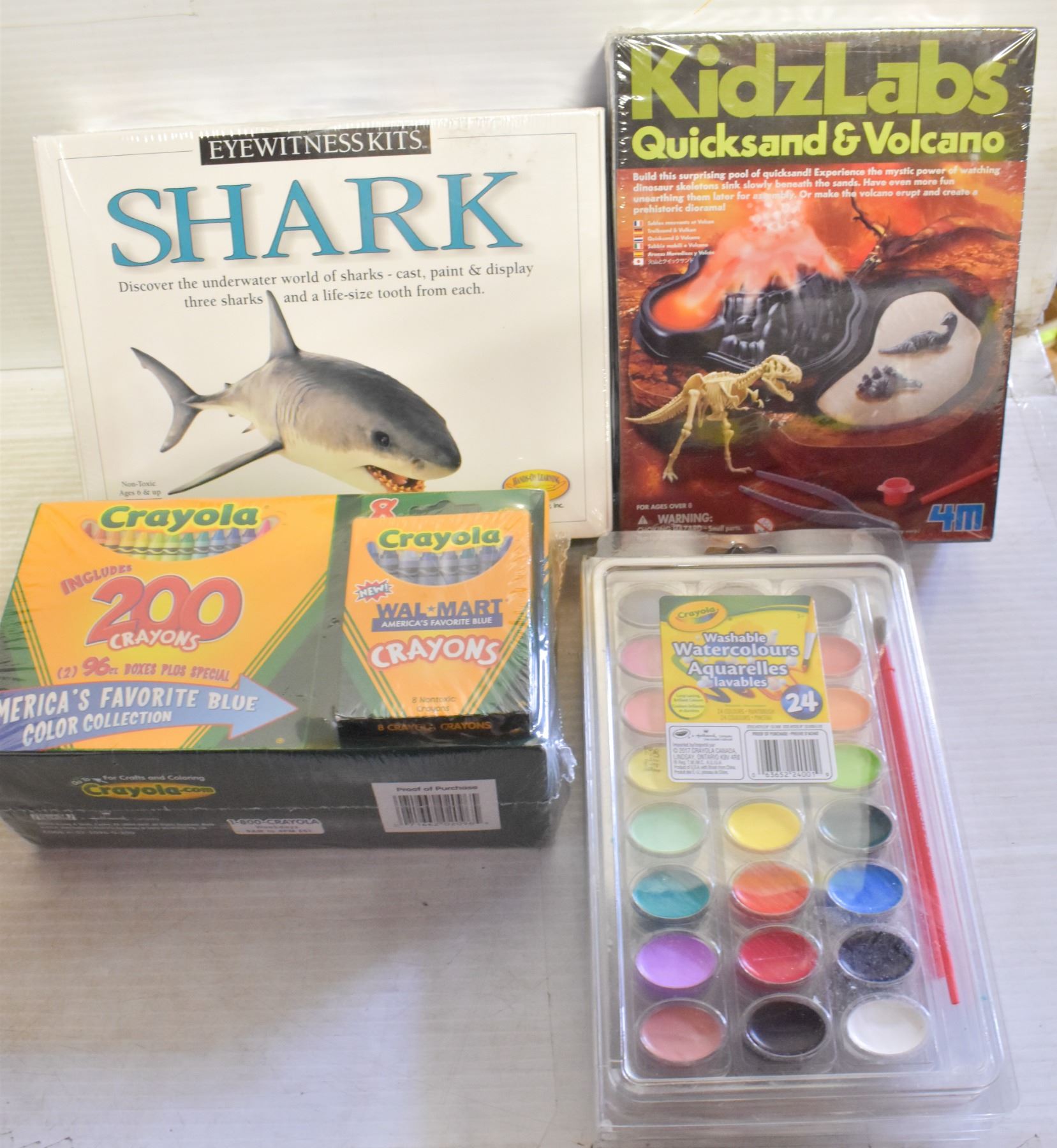 FAVORITE BLUE COLLECTION, WASHABLE WATER COLORS 4 PACKS OF 24, EYEWITNESS PERFECT CAST SHARK CASTING KIT, 4M KIDZLABS QUICK SAND AND VOLCANO KIT