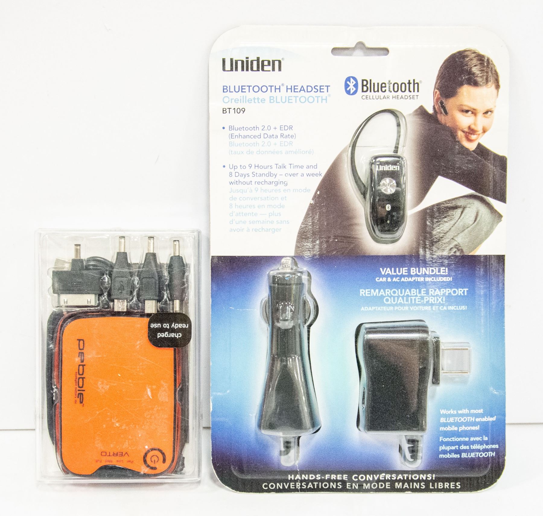 HEADSET WITH CAR & AC ADAPTER #BT109, VERTO PEBBLE 3700AH PORTABLE CHARGER (ORANGE) #VPP-201-CO