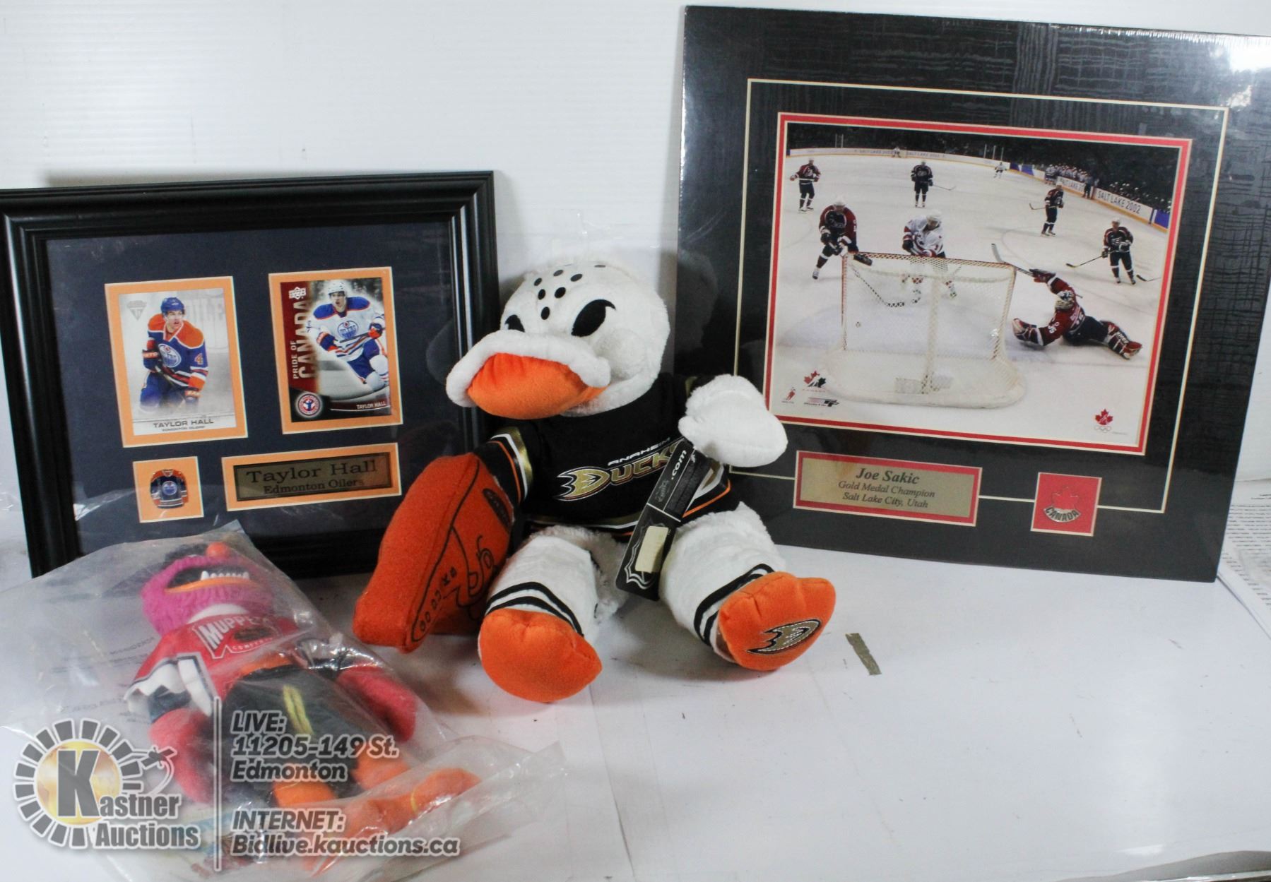PORTRAIT WITH PIN FRAMED W/FRAMED TAYLOR HALL OILERS & SEALED 2 PLUSH ANAHEIM DUCKS & NHL 1995 MACDONALDS MUPPETS