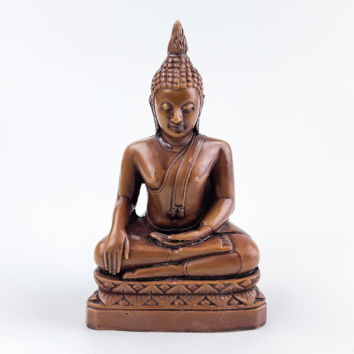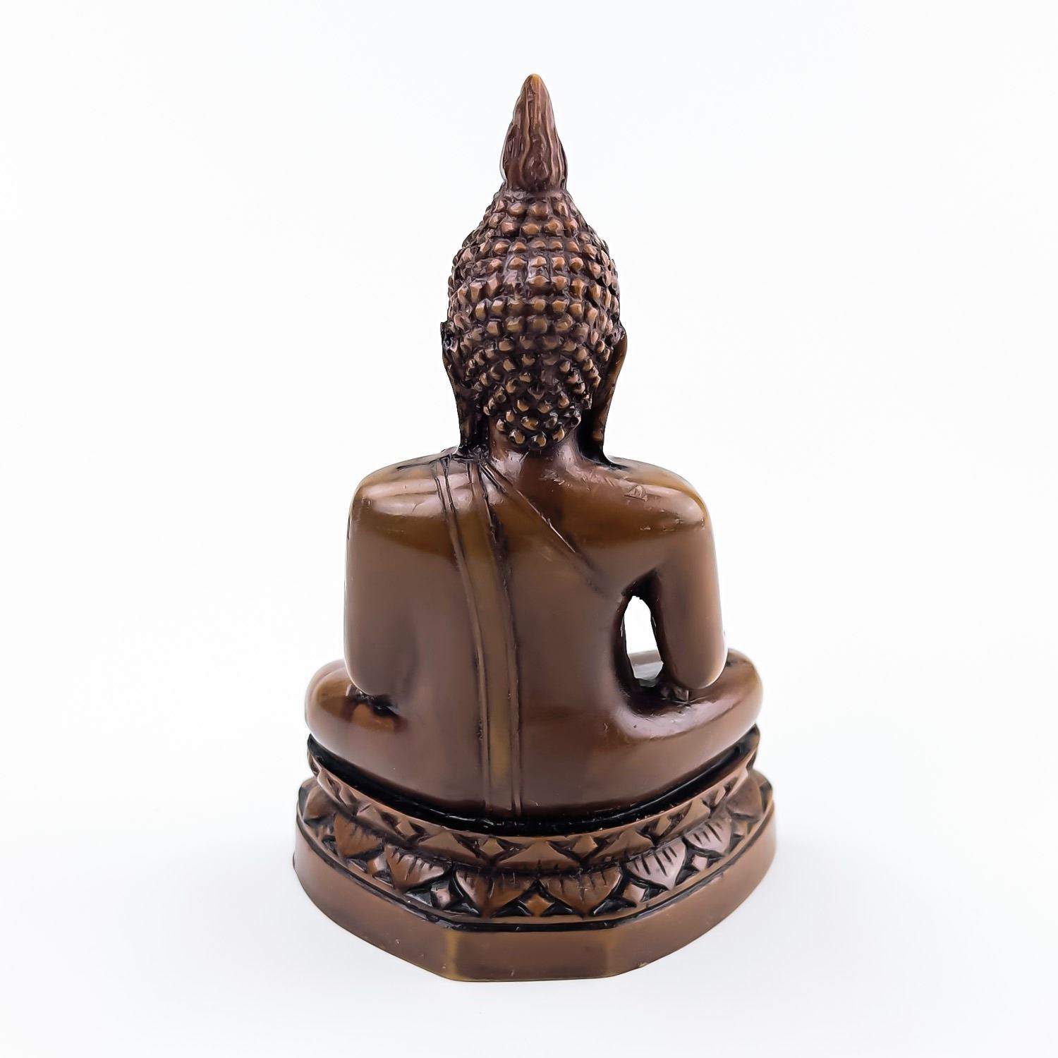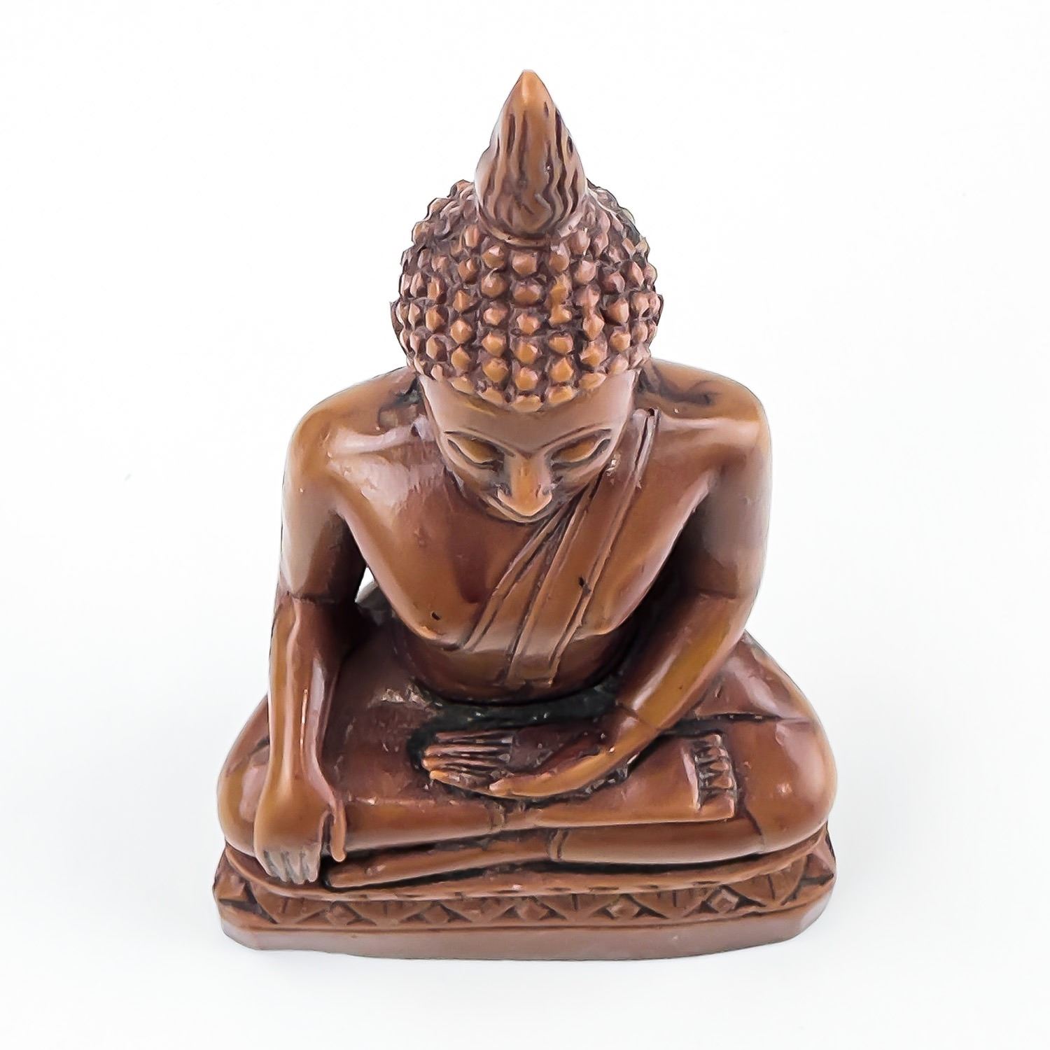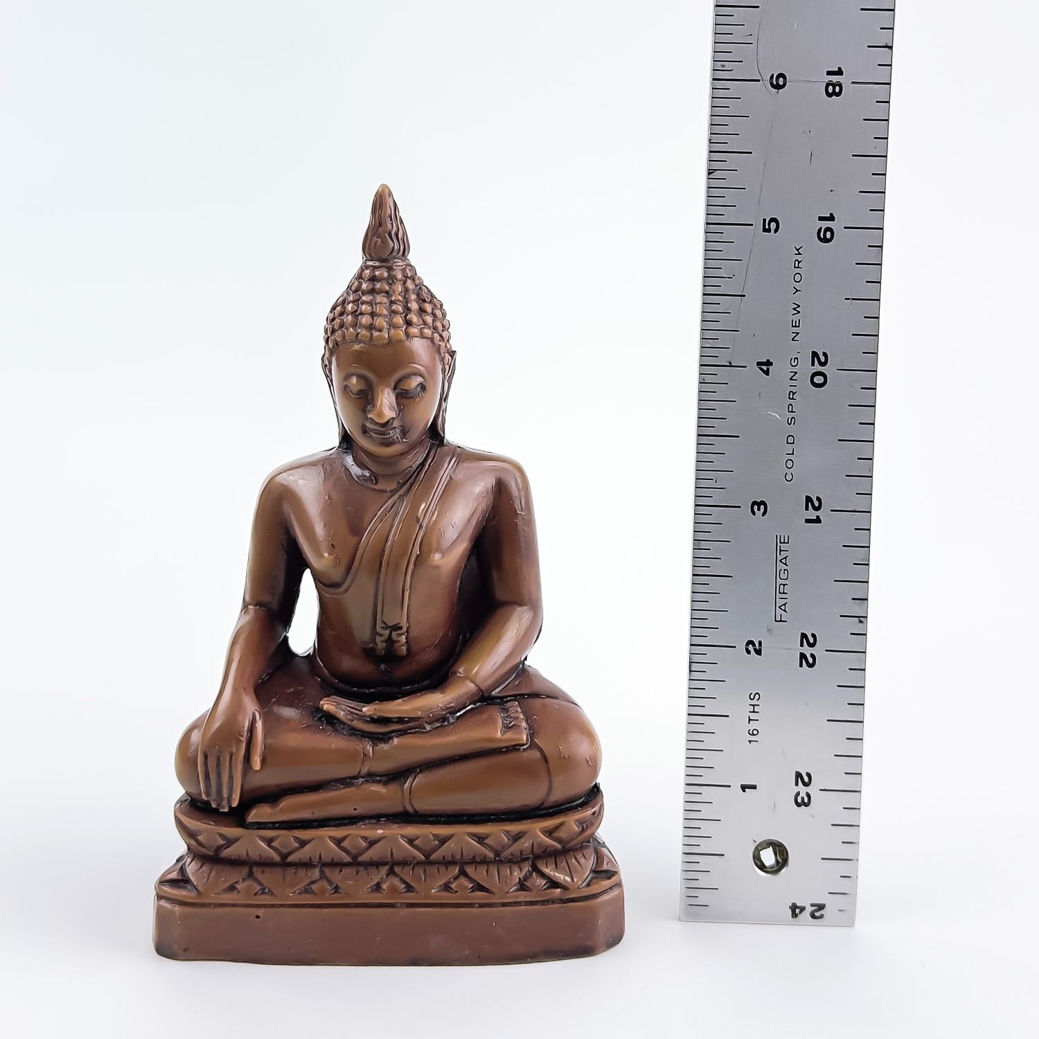 #8416 - SMALL SEATED BUDDHA RESIN SCULPTURE IN MEDITATING POSE. NO CRACKS, CHIPS OR REPAIRS. MEASURES 5.25” (13.25 CM) TALL BY 3.375” (8.5 CM) WIDE AND 2” (5 CM) DEEP.
