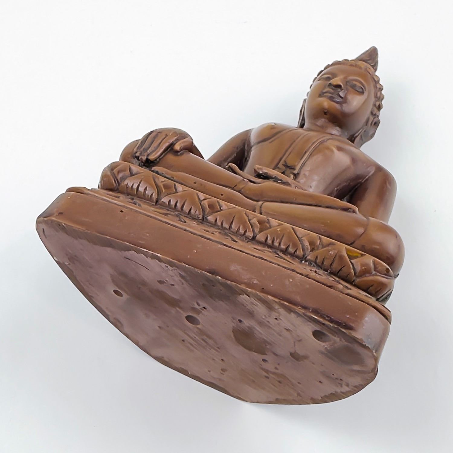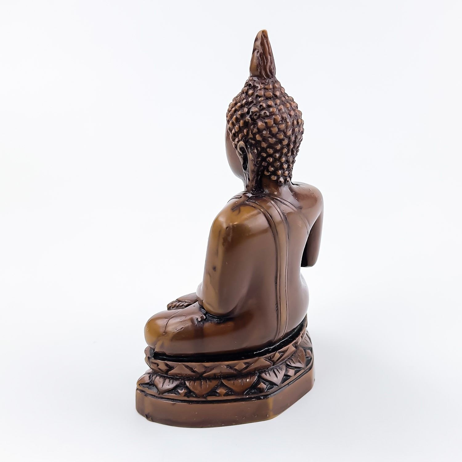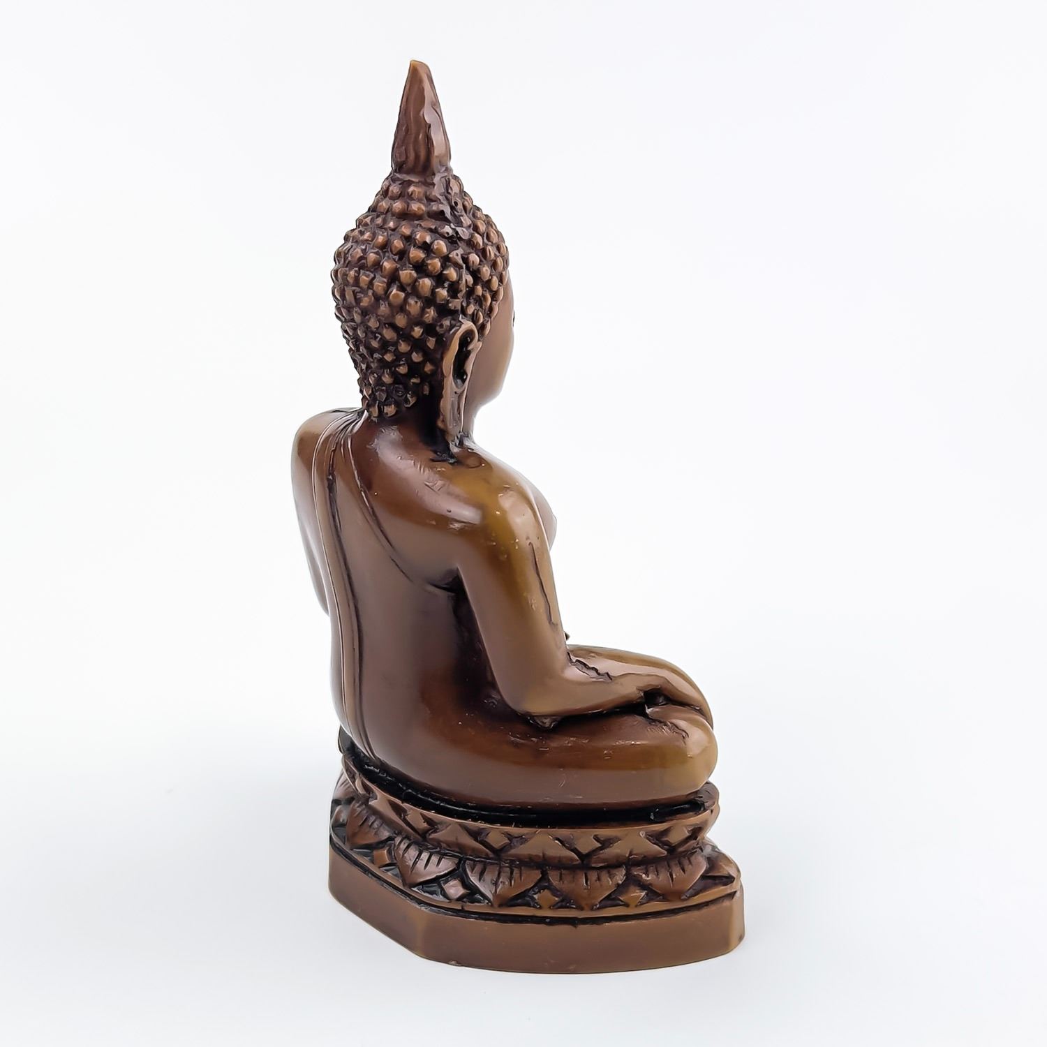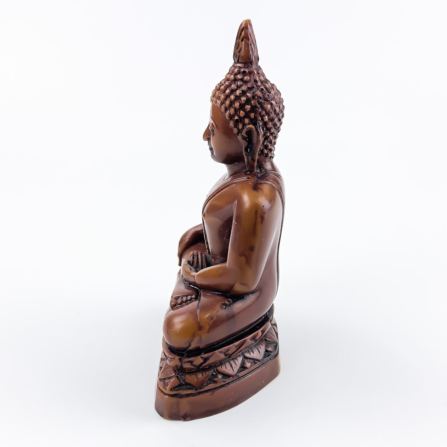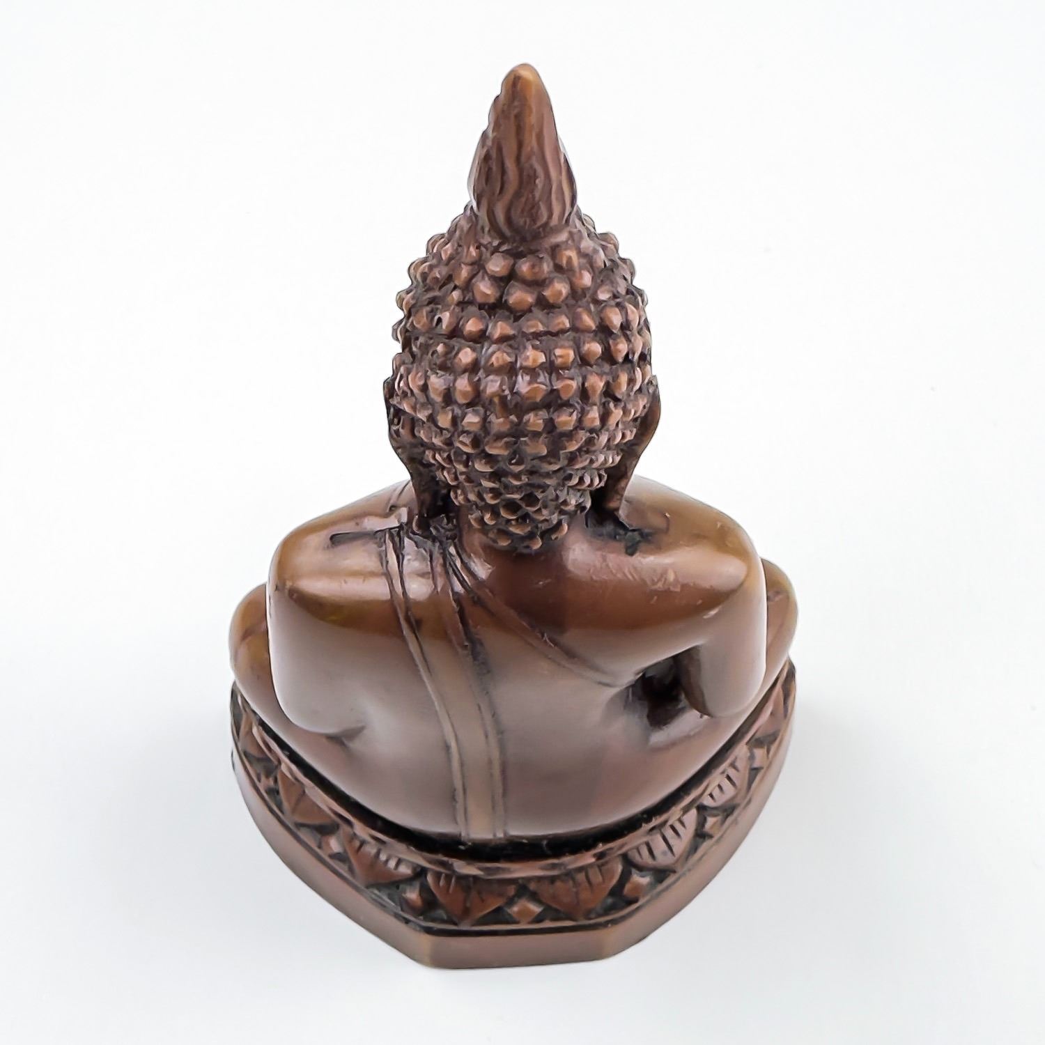 #8416 - SMALL SEATED BUDDHA RESIN SCULPTURE IN MEDITATING POSE. NO CRACKS, CHIPS OR REPAIRS. MEASURES 5.25” (13.25 CM) TALL BY 3.375” (8.5 CM) WIDE AND 2” (5 CM) DEEP.