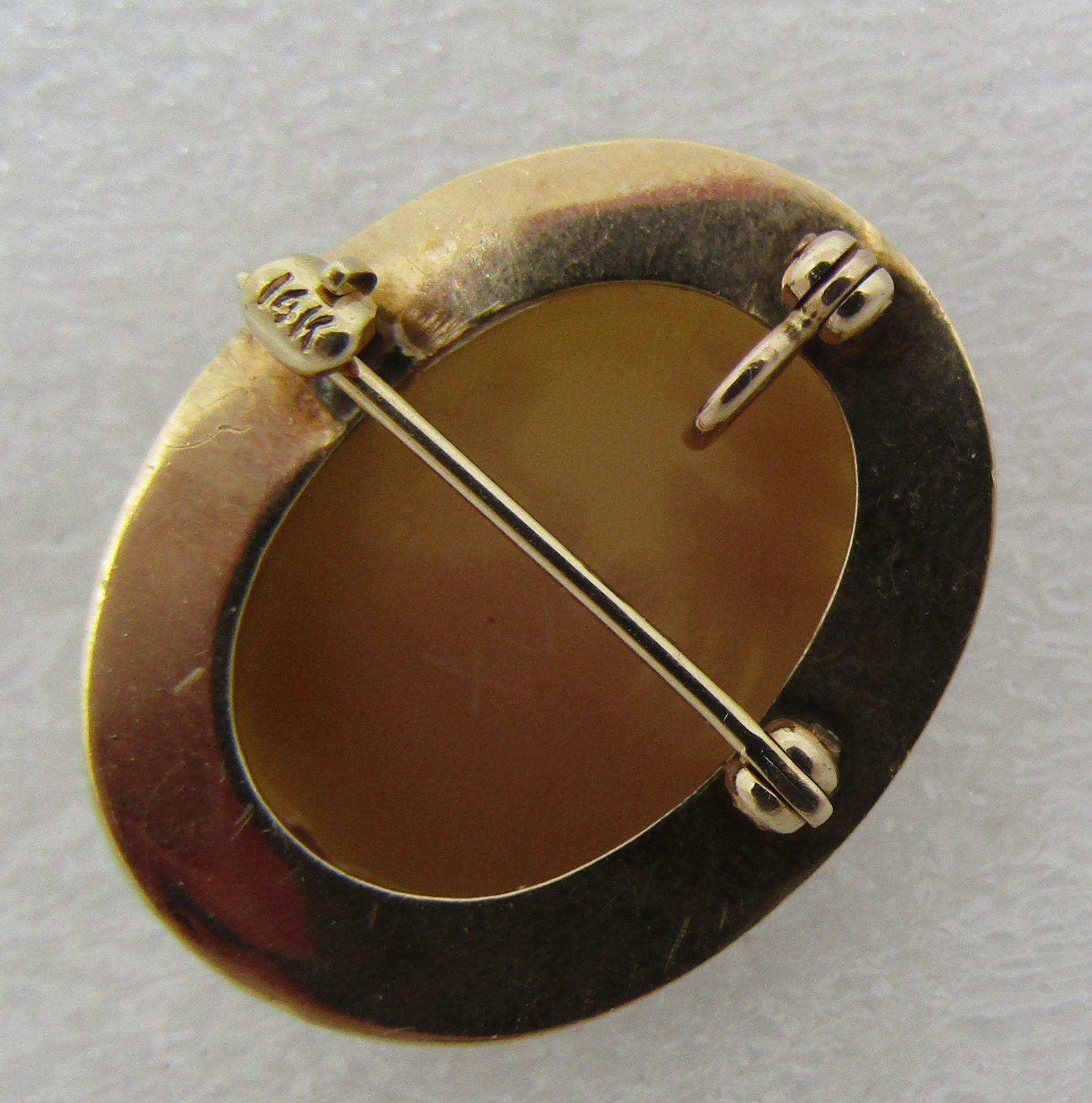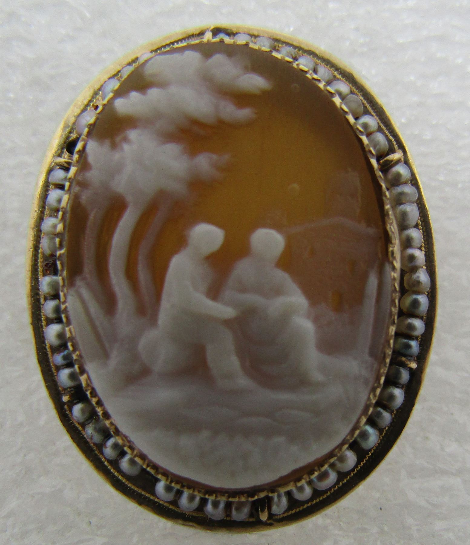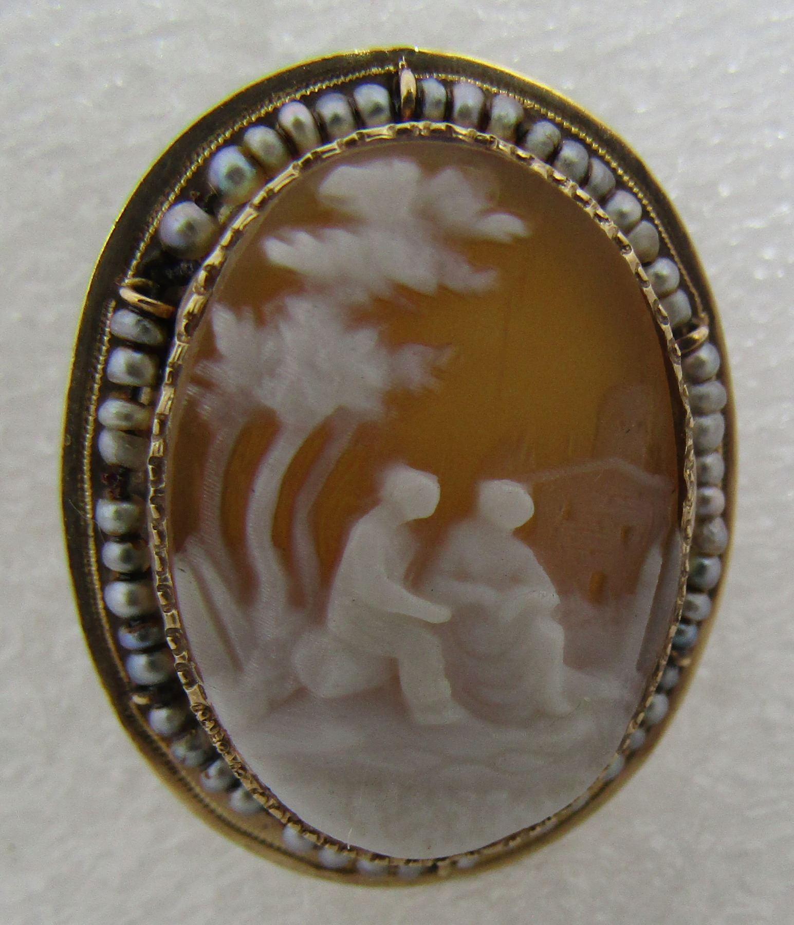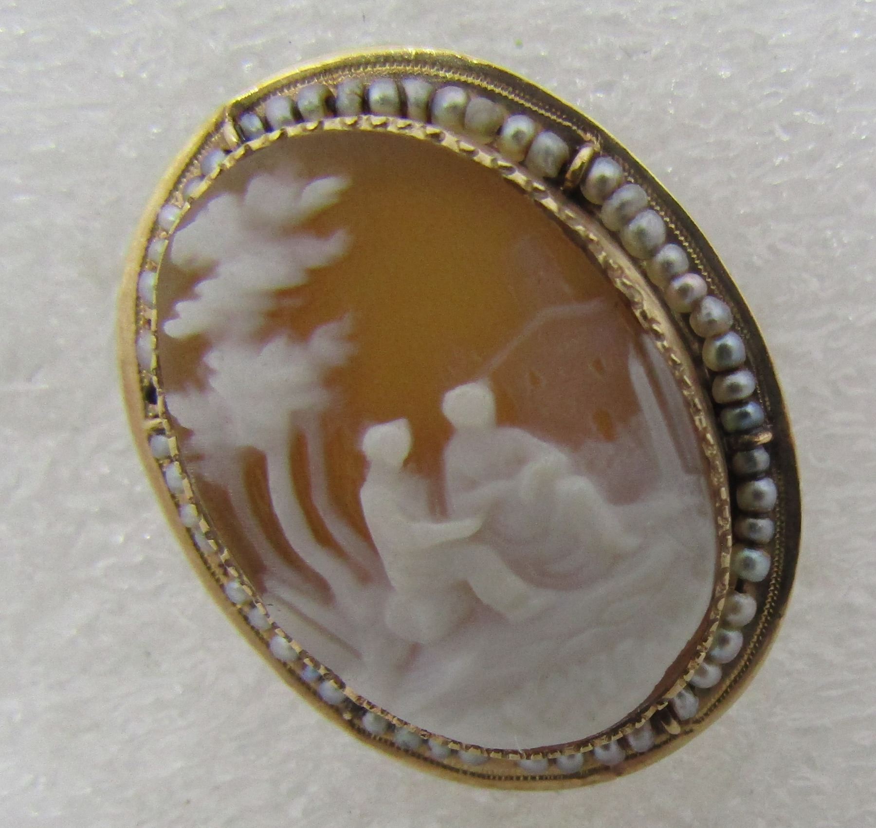 WOW ANTIQUE PEARLS & CAMEO, WITH SWIVEL LOOP FOR NECKLACE. 100 YEAR OLD VINTAGE ESTATE MARKED "14K". 20MM WIDE BY 25MM LONG. 14KT YELLOW . WEIGHS 3.6GRAMS. EXCELLENT USED CONDITION, PIN WORKS FINE. USA SHIPPING $5.