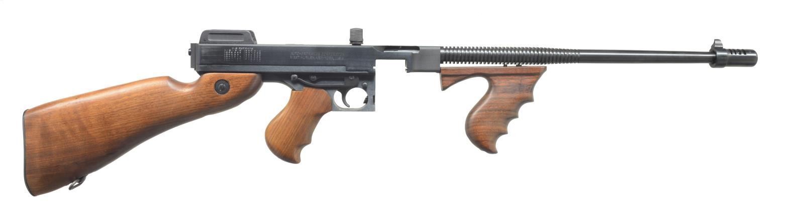 ORDNANCE. Cal. 45 ACP. S# 1191. Bbl. 18" over flash hider. The classic Chicago type writer look & feel w/ out all of the cumbersome paperwork. Finned bbl. w/ traditional compensator emblemized w/ Thompson bullet logo & blade style front sight. Rear sight elevation adj. peep to 600 yds. A combination of matte & satin finish bluing on all exposed metal surfaces. Vertical pistol grip & foregrip. Hardwood shoulder stock w/ trap door. Safety on left side. Markings include: “MODEL OF 1927 A1 / NO. 1191 / THOMPSON SEMI-AUTOMATIC CARBINE / CALIBER. 45 AUTOMATIC CARTRIDGES” on left side of receiver, US patent block & “AUTO-ORDNANCE CORPORATION / WEST HURLEY, NEW YORK U.S.A.” on right side. CONDITION: finish on all exposed metal surfaces are free of any major blemishing. Gentle thinning in area of patent block on right side of receiver. Wood has only a few light impressions. Overall appearance indicates the firearm has been used very little. Fire control mechanism functions correctly when cycled by hand. Shiny bore w/ strong rifling. (20-2294/JZ). MODERN. $900-1,400.