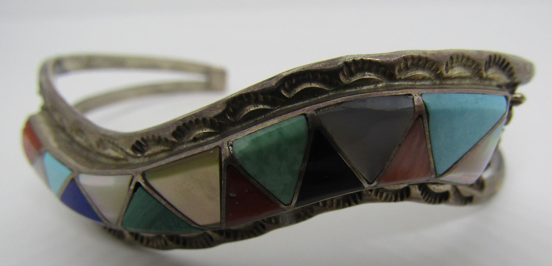 HALLMARKED "ECS STERLING" ELDRICK CHARLOTTE OLD PAWN NATIVE AMERICAN SOUTHWEST NAVAJO INDIAN JEWELRY. TOP 15MM WIDE WITH TURQUOISE, LAPIS, MALACHITE, CORAL, ONYX, MOP. MEASURES 6.5" INSIDE INC 1" GAP.TESTED STERLING SILVER, WEIGHS 14.1 GRAMS. VINTAGE ESTATE EXCELLENT USED CONDITION. USA SHIPPING $5.