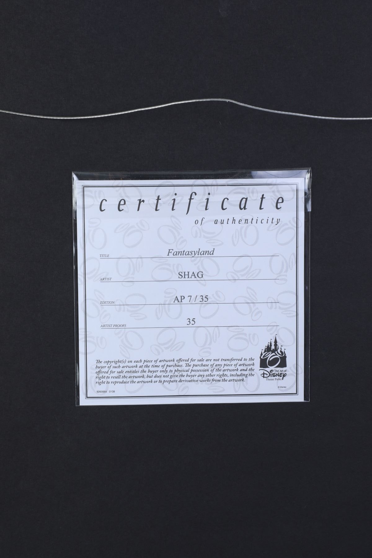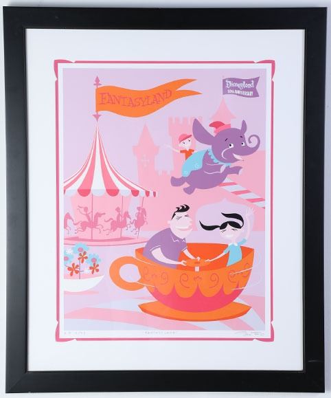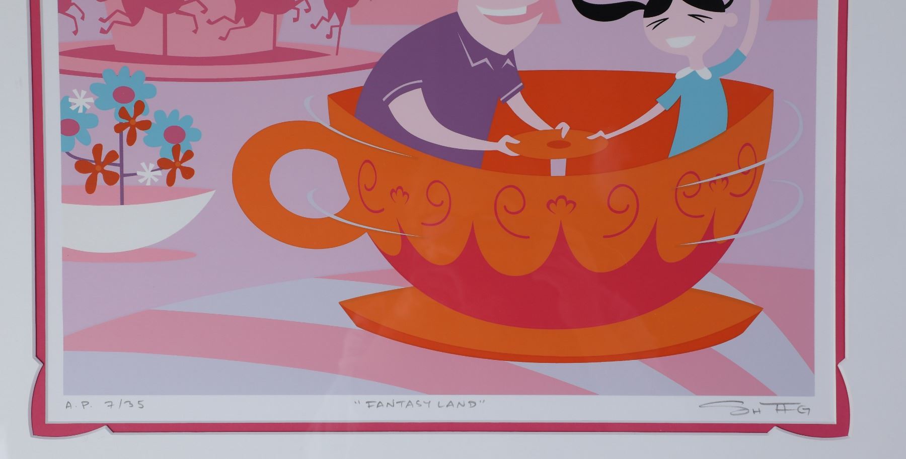 (Disneyland, c. 2015). “Fantasyland” by Shag, for Disneyland’s 50th Anniversary. This rare limited edition 7 of 35 Artist Proof lithograph captures the spirit of Fantasyland with the original opening day star attraction of the "Tea Cups." The item measures approximately 32.5" x 27.5" and is in very good condition with normal wear from age and minimal handling. Item comes with a Grand Circle Tour Auctions COA.