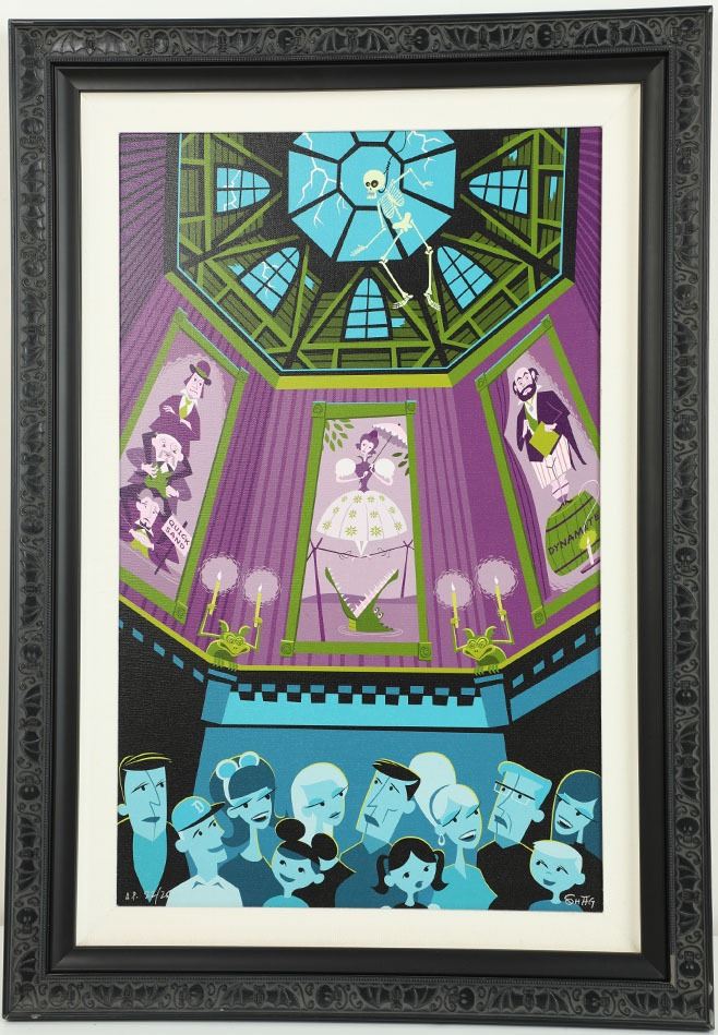 (Disneyland, c. 2009). Referred to as "the most sought-after giclee from the Shag Haunted Mansion collection", a 40th Anniversary The Haunted Mansion limited edition 22 of 25 Artist Proof of SHAG's "A Dismaying Observation" Giclee on Canvas. Created by artist Josh Agle, it's a beautiful capture of perhaps the most favorite queue experience among guests of the park - the stretching room and its eerie paintings and ceiling. The item comes with an official Disneyland SHAG Certificate of Authenticity and displayed in its original Haunted Mansion stylized frame of alternating skulls and bats. These were custom framed by Shag's Studio.