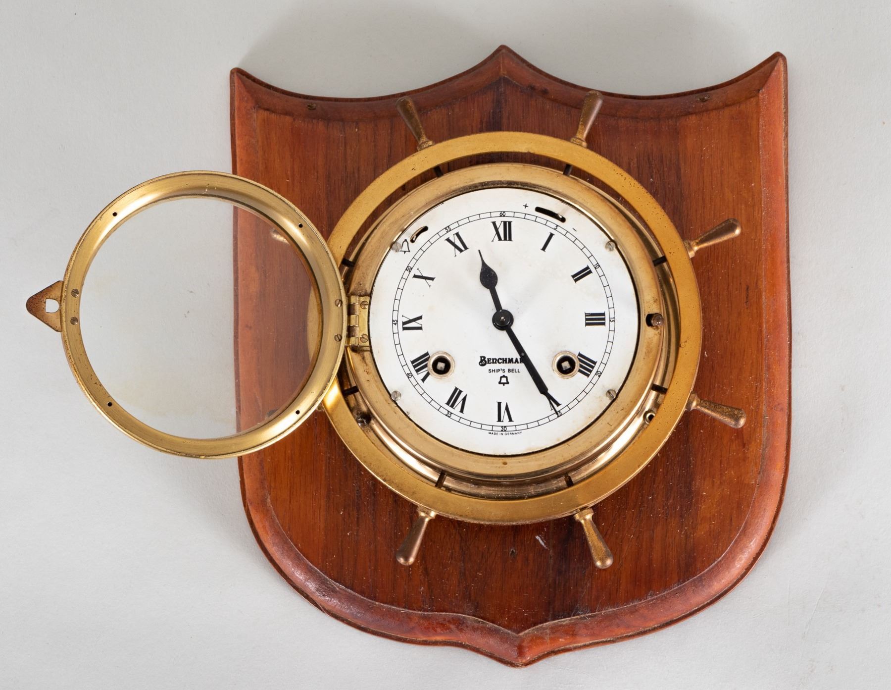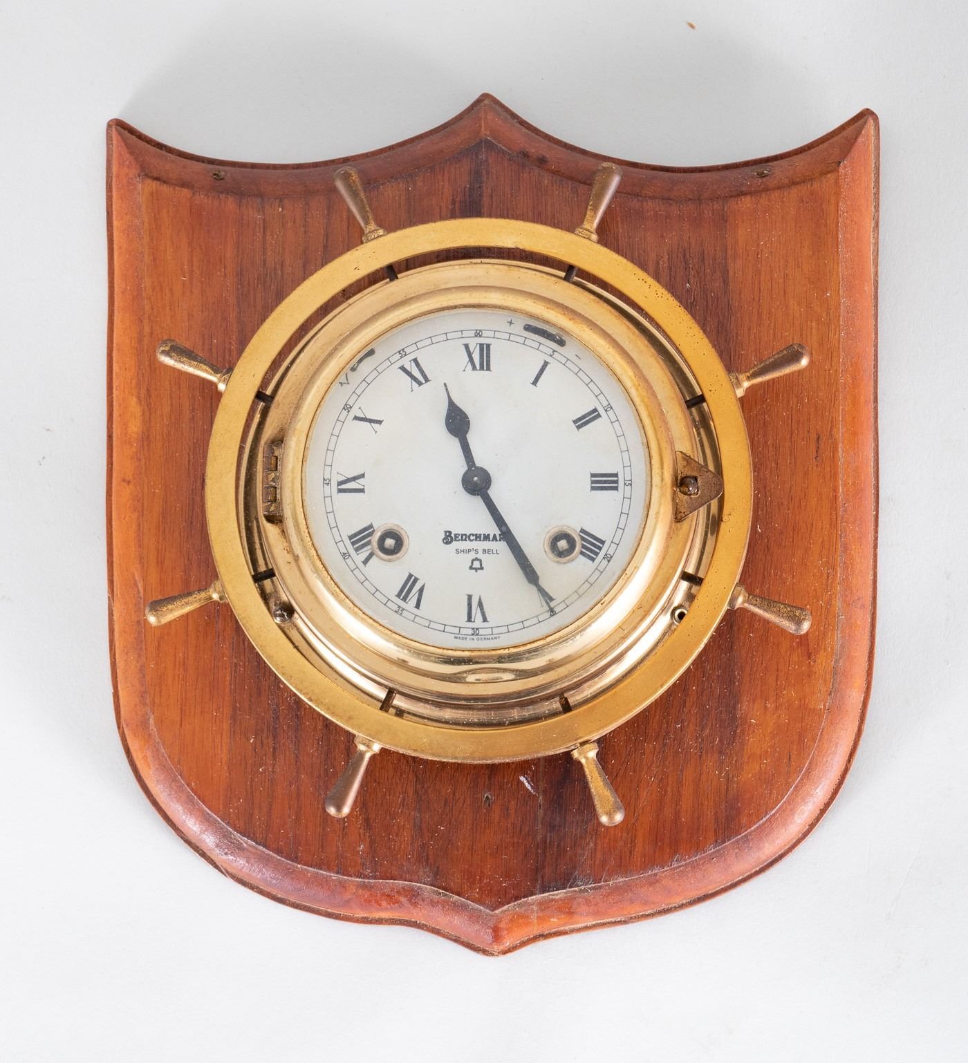 Ship clock made by 'Benchmark - Made in Germany'. Mounted to wooden plaque. With key. Approx. 11.5 x 9 inches. Minor dent on metal around clock face. Not tested.