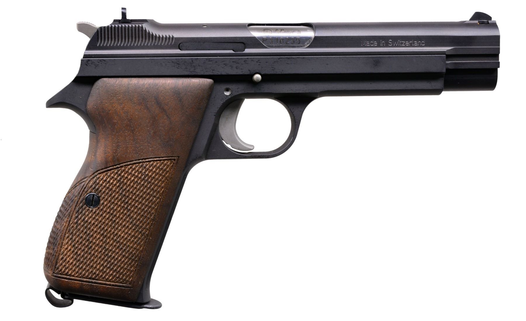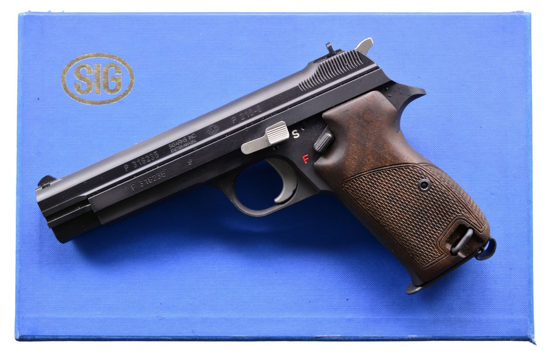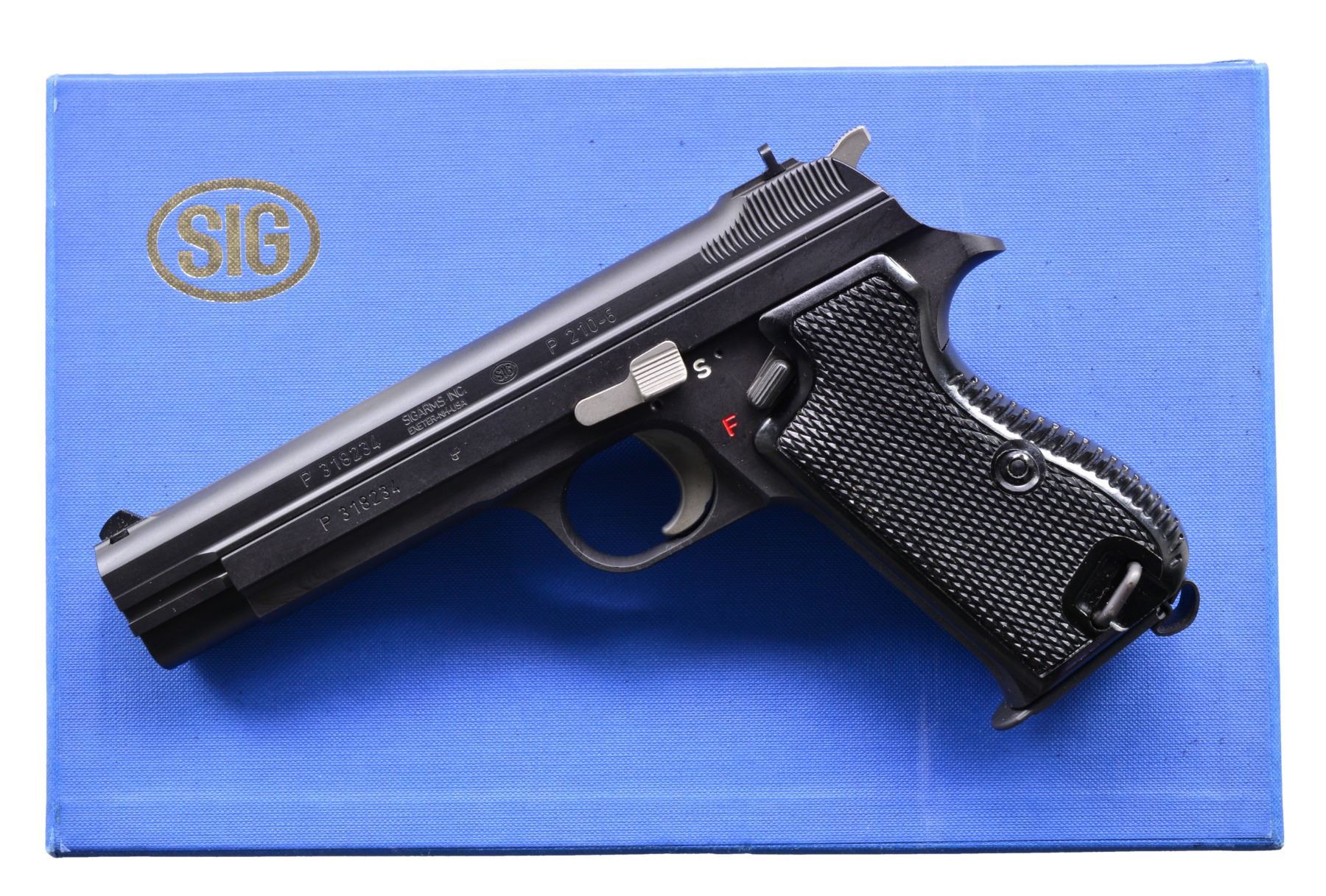 PISTOLS. BOTH: cal. 9mm Luger. Bbls. 120mm. Dovetail mounted serrated ramp front sights w/ U notch rear sights. Matte blue finish. Right side of slides marked "Made in Switzerland". Left side of slides have importer markings "SIG ARMS INC / EXETER-NH-USA". Bottom mounted mag. releases. The P210 was originally mfg. in 1947 & became the standard military pistol of the Swiss Army in 1949. MAGS: 2 detachable 8 rd., 1 for each pistol. 1) S# P318235. 2 Piece checkered walnut oil finished grips. UNATTACHED ACCESSORIES: 1 piece blue box w/ matching S#. Box contains 2 piece checkered plastic grips, instruction manual, mag. loader & test target. CONDITION: near excellent retaining over 99% finish. bright near excellent bore. (20-195/DS). 2) S# P318234. 2 Piece black plastic checkered grips. UNATTACHED ACCESSORIES: 1 piece blue box w/ matching S#. Box contains instruction manual, mag. loader & test target. CONDITION: near excellent retaining over 99% finish. Bright near excellent bore. (20-196/DS). BOTH MODERN. $4,000-6,000.