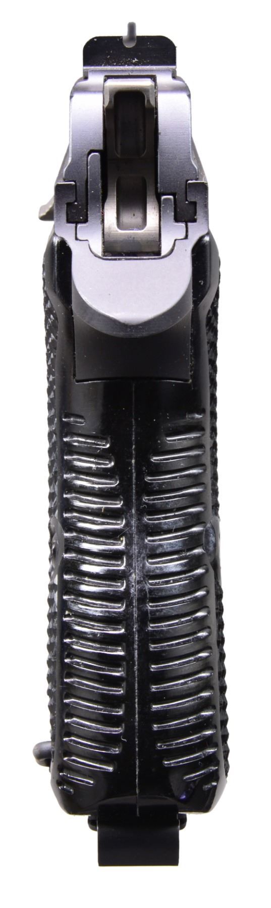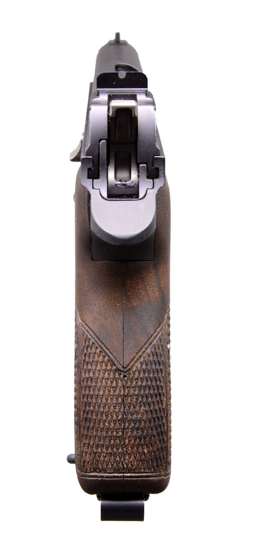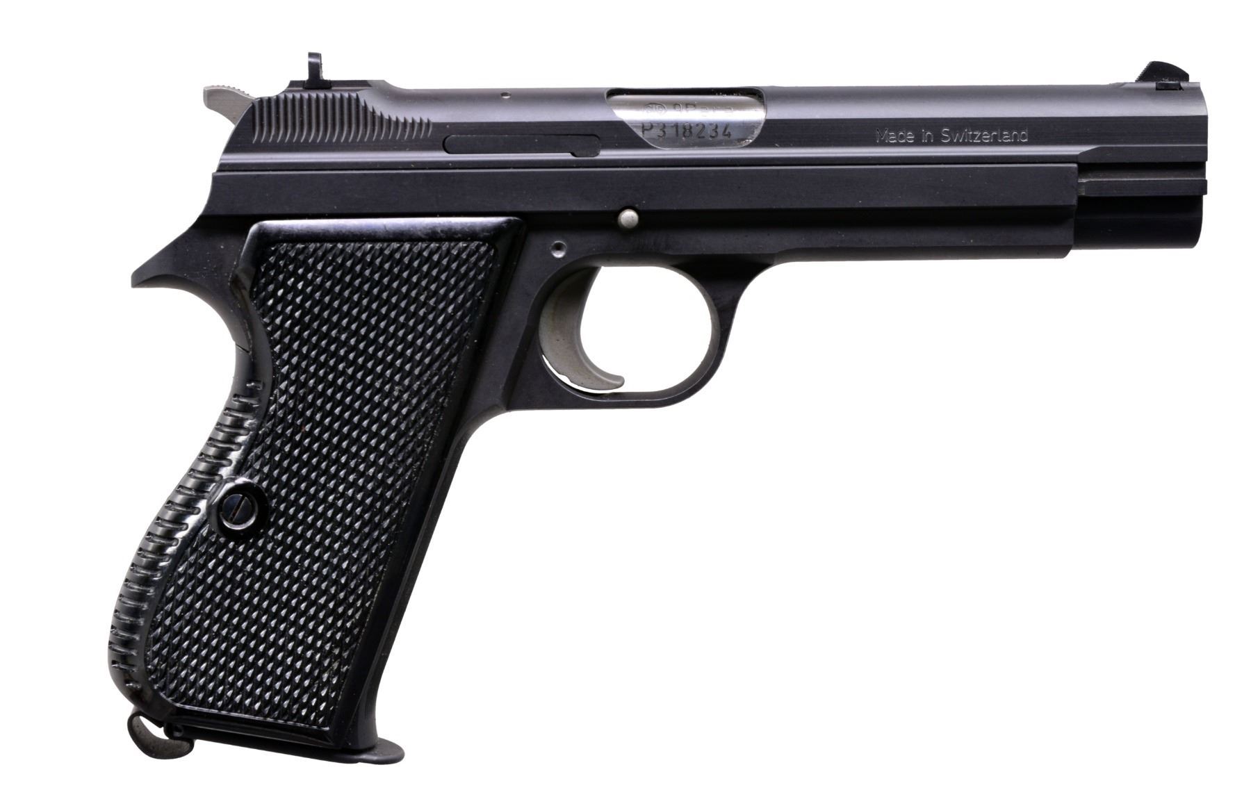 PISTOLS. BOTH: cal. 9mm Luger. Bbls. 120mm. Dovetail mounted serrated ramp front sights w/ U notch rear sights. Matte blue finish. Right side of slides marked "Made in Switzerland". Left side of slides have importer markings "SIG ARMS INC / EXETER-NH-USA". Bottom mounted mag. releases. The P210 was originally mfg. in 1947 & became the standard military pistol of the Swiss Army in 1949. MAGS: 2 detachable 8 rd., 1 for each pistol. 1) S# P318235. 2 Piece checkered walnut oil finished grips. UNATTACHED ACCESSORIES: 1 piece blue box w/ matching S#. Box contains 2 piece checkered plastic grips, instruction manual, mag. loader & test target. CONDITION: near excellent retaining over 99% finish. bright near excellent bore. (20-195/DS). 2) S# P318234. 2 Piece black plastic checkered grips. UNATTACHED ACCESSORIES: 1 piece blue box w/ matching S#. Box contains instruction manual, mag. loader & test target. CONDITION: near excellent retaining over 99% finish. Bright near excellent bore. (20-196/DS). BOTH MODERN. $4,000-6,000.