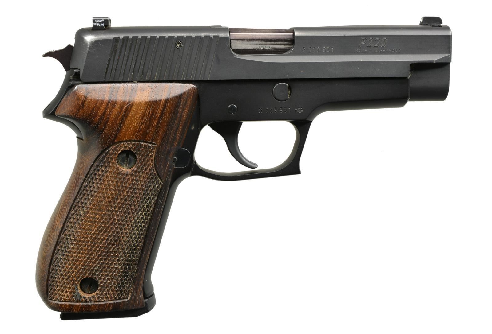 Cal. 45 ACP. S# G209901. Bbl. 4.4". Mfg. 1976-2019. Alloy frame & matte steel slide w/ Trijicon 3 dot fixed night sights. Dark checkered European walnut grips. MAGS: 1 stainless factory 8 rd. CONDITION: near excellent frame, grips & bore. Very good slide w/ high point thinning. Finish wear on bbl. exterior at port. (20-1526/NW). MODERN. $600-800.