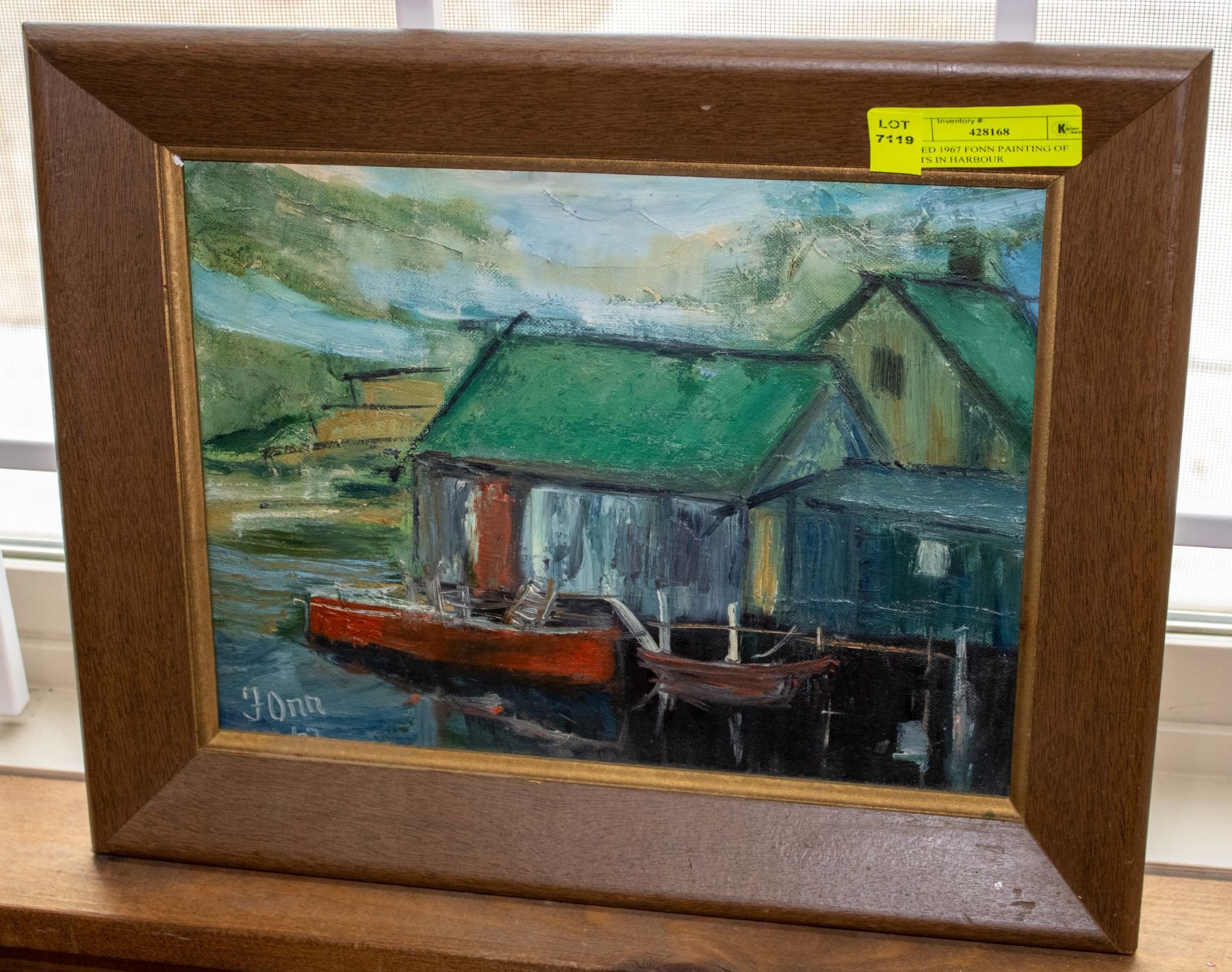 SIGNED 1967 FONN PAINTING OF BOATS IN HARBOUR
