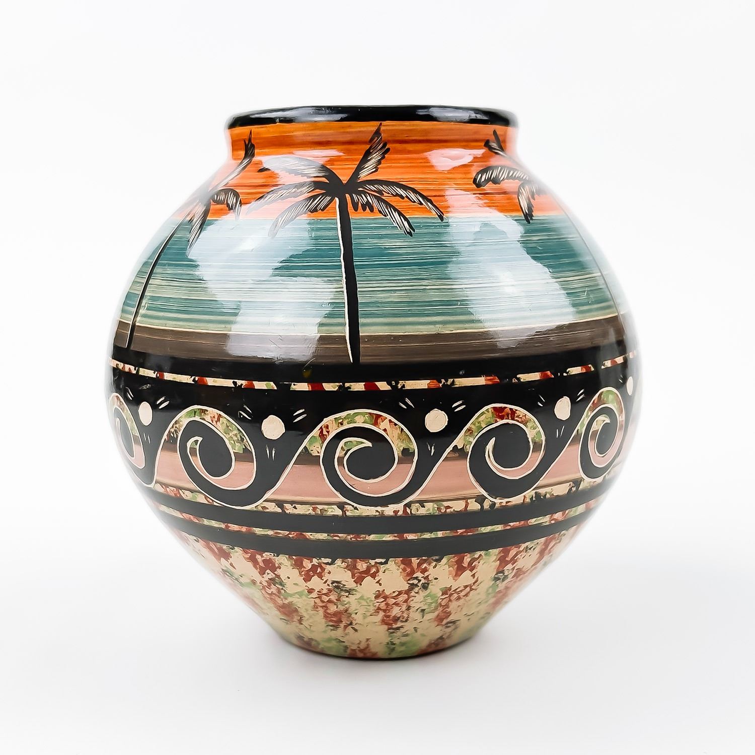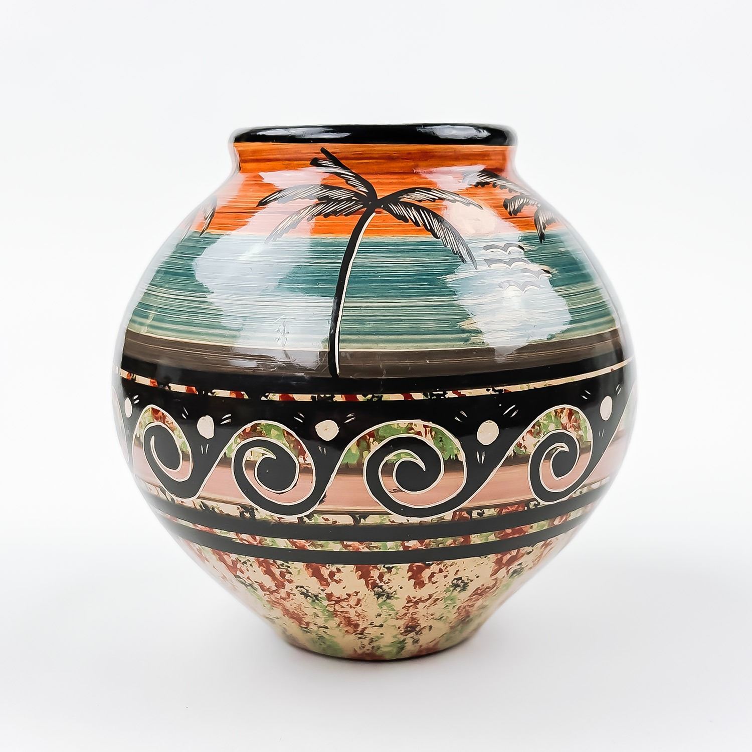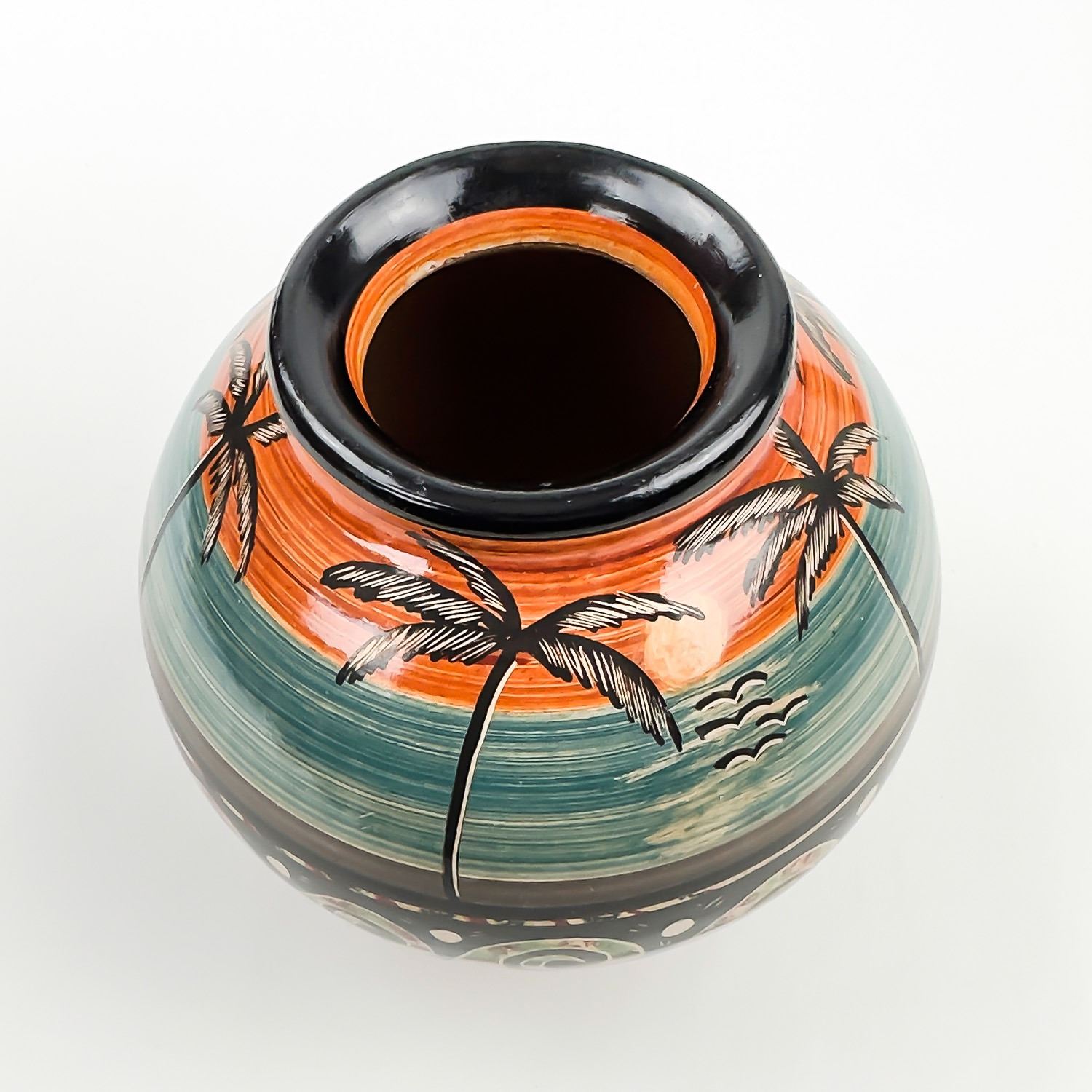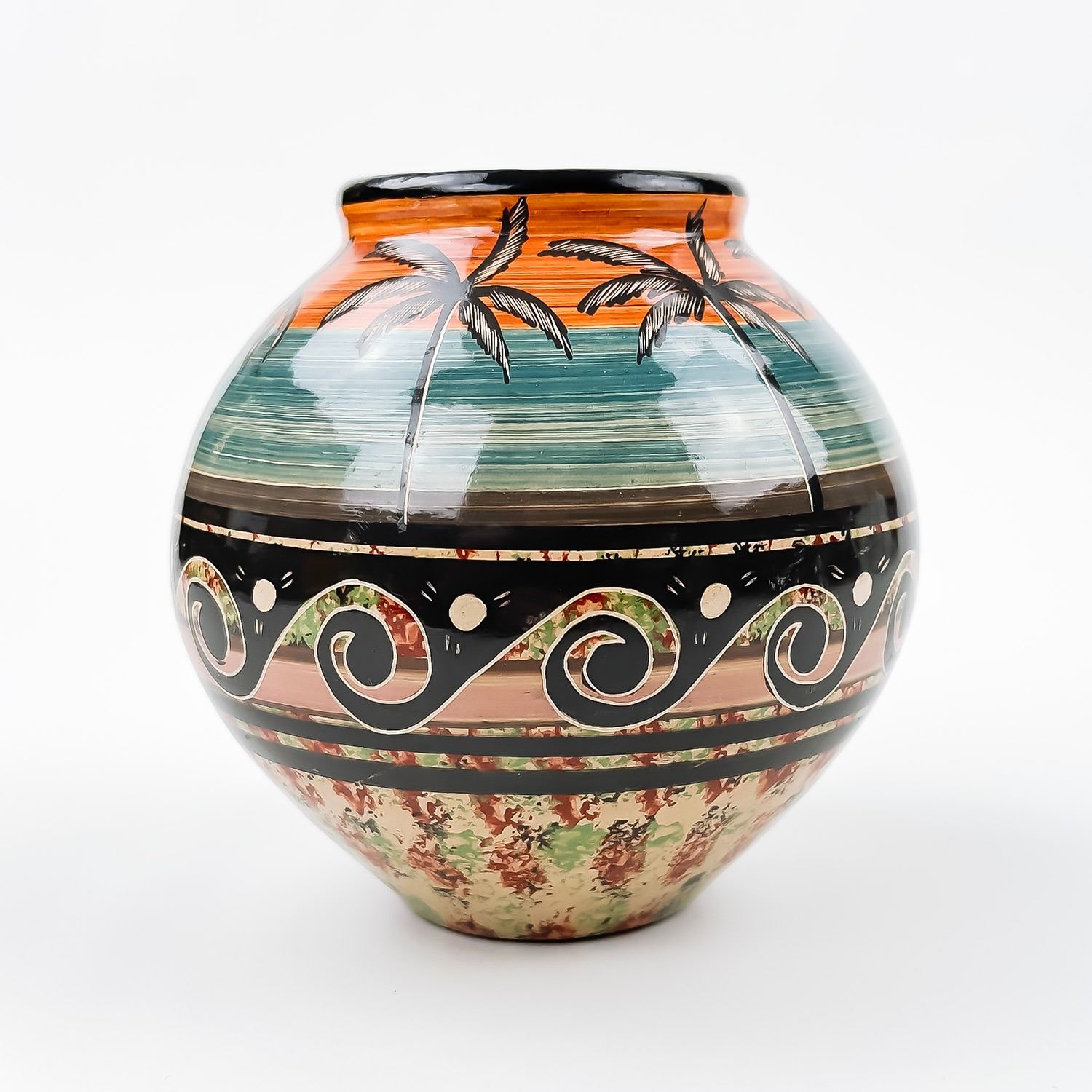 #9457 - HAND CRAFTED & PAINTED VASE OR PLANTER FROM COSTA RICA. VASE APPEARS TO BE MADE FROM A TERRACOTTA TYPE OF MATERIAL. PALM TREES, OCEAN WAVES, BIRDS BY THE SEA THEME. MEASURES 4.75” (12 CM) WIDEST DIAMETER AND SITS 4.75” (12 CM) HIGH