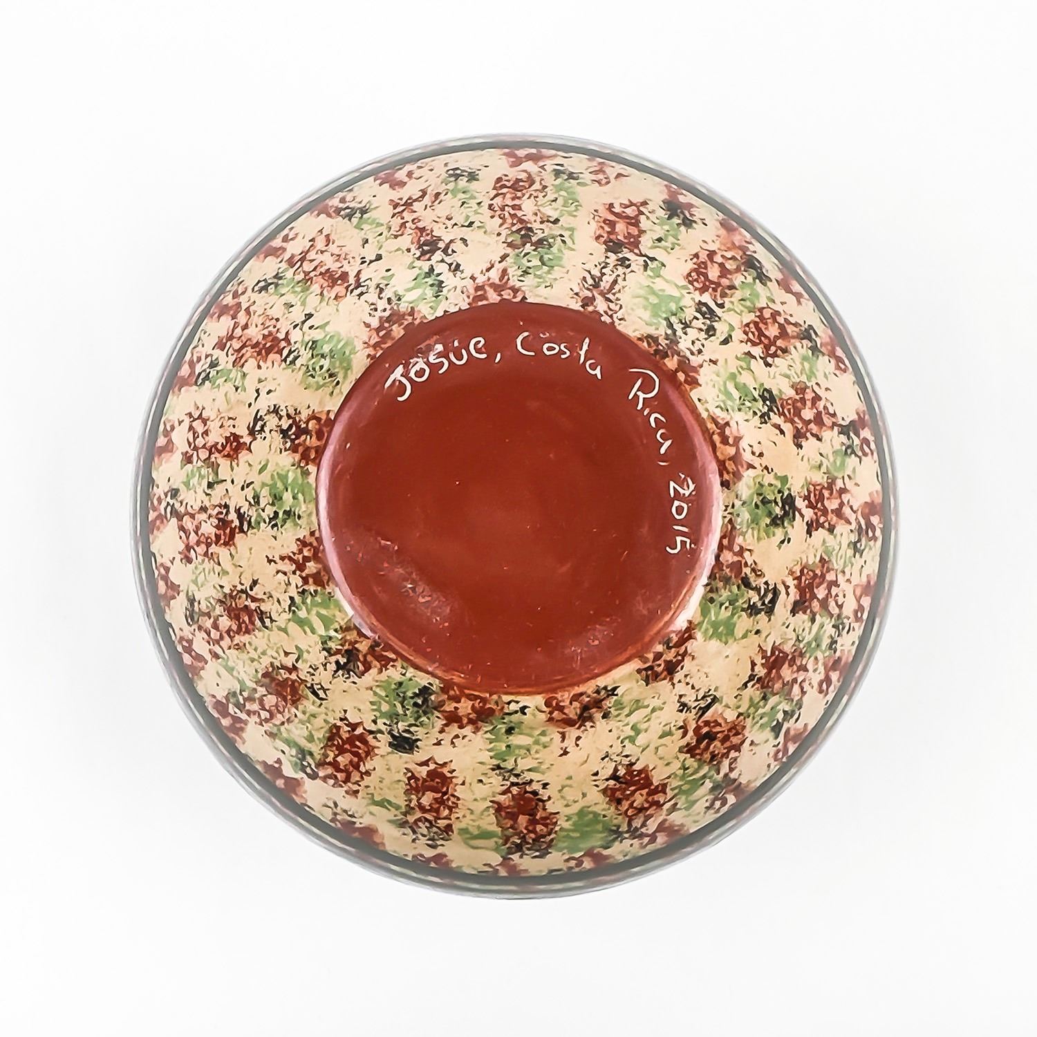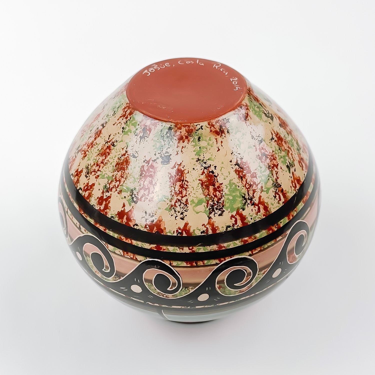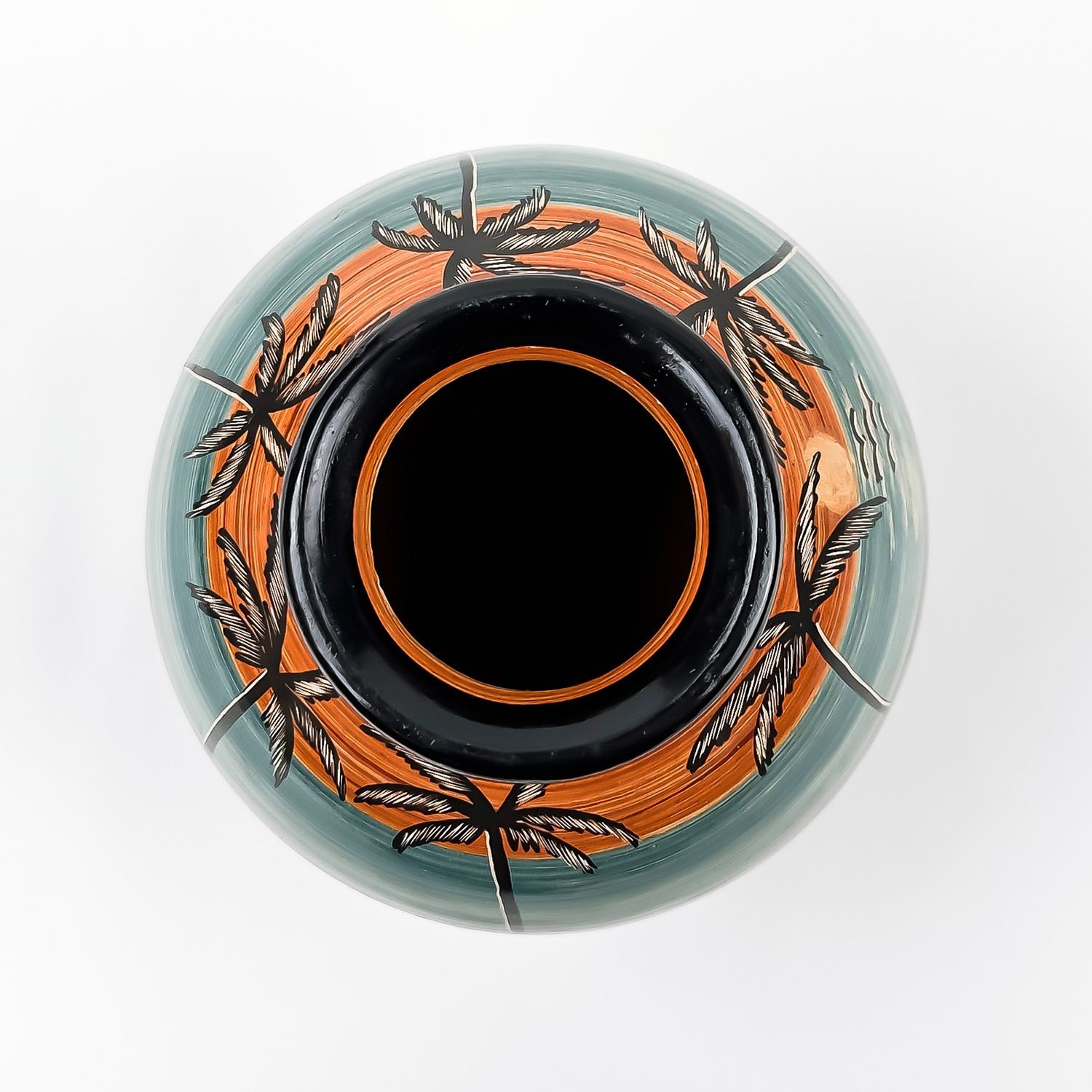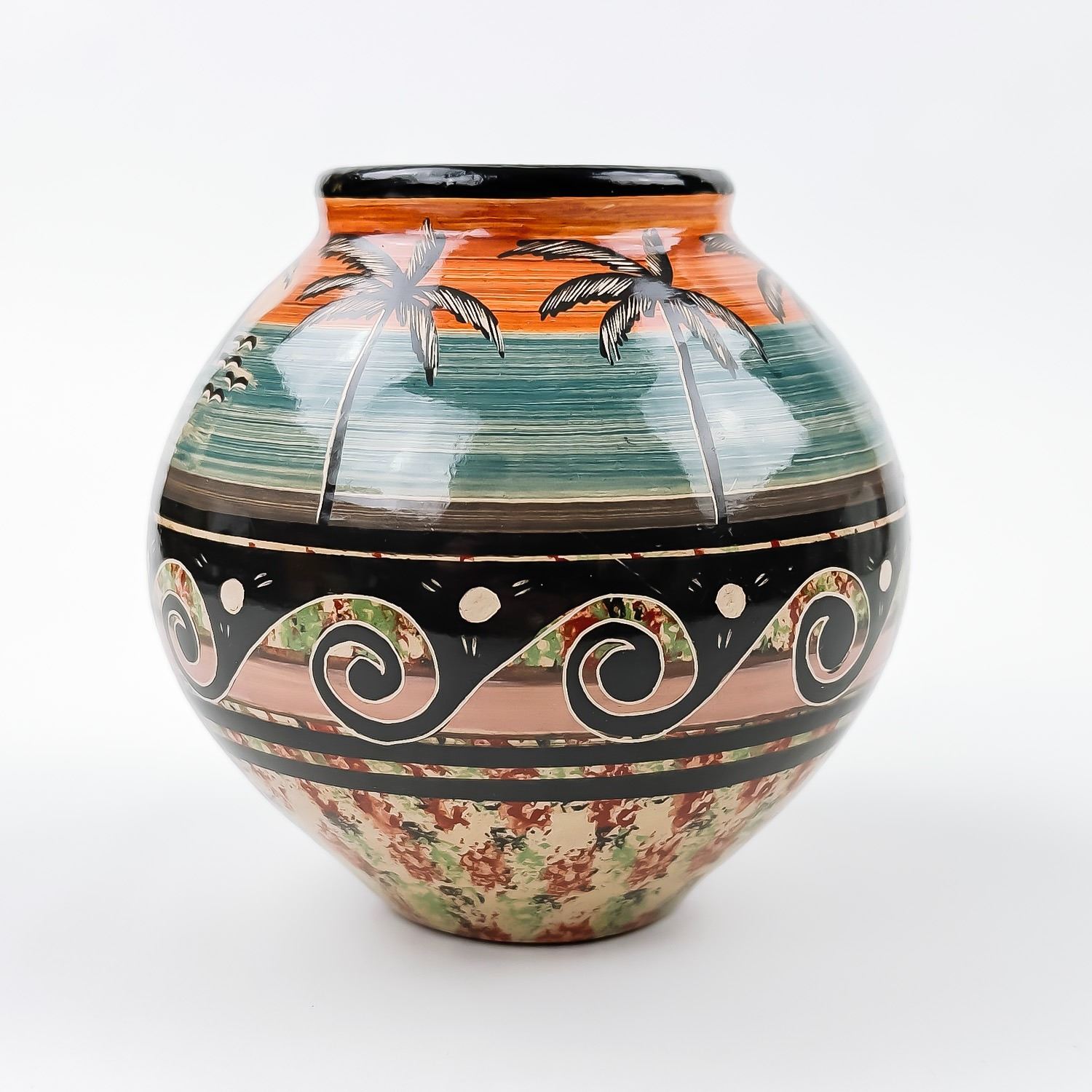 #9457 - HAND CRAFTED & PAINTED VASE OR PLANTER FROM COSTA RICA. VASE APPEARS TO BE MADE FROM A TERRACOTTA TYPE OF MATERIAL. PALM TREES, OCEAN WAVES, BIRDS BY THE SEA THEME. MEASURES 4.75” (12 CM) WIDEST DIAMETER AND SITS 4.75” (12 CM) HIGH