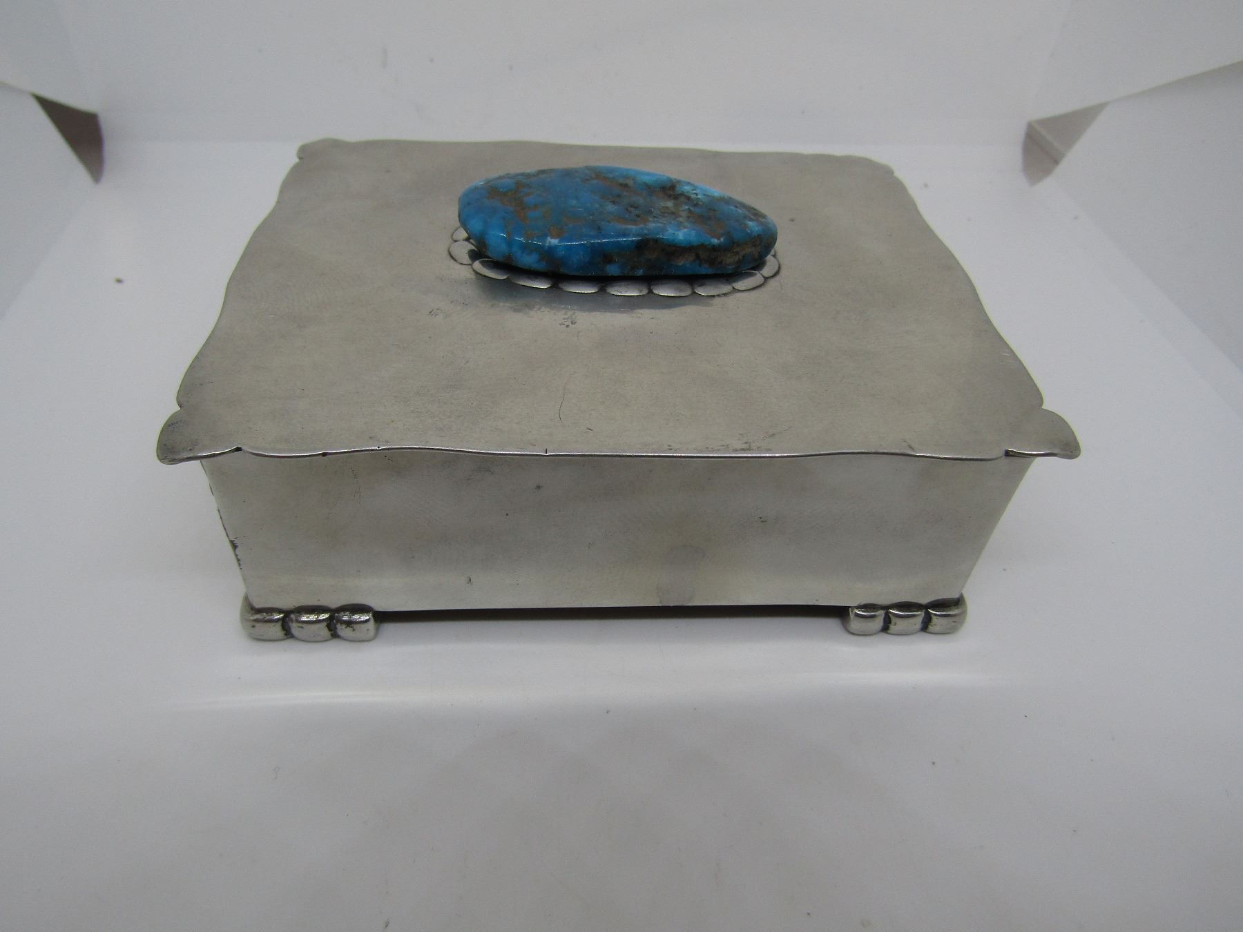 SILVER PLATED BOX 4 INCH BY 3 INCH 1 1/2 INCH TALL. HAS 1 1/2 INCH NATURAL TURQUOISE SPECIMEN NUGGET ON TOP, BOX HAS WOOD LINER. US SHIPPING $10