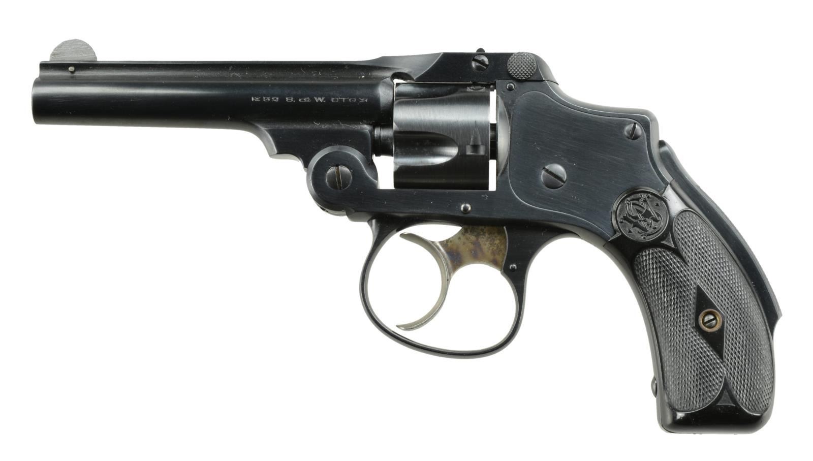 REVOLVER. Cal. 32 SW. S# 116037 (1902-1909). Bbl. 3 1/2" w/ rib & replacement pinned half moon front sight. Blue finish. Matching numbered bbl., 5 shot fluted cyl. & 2 piece checkered hard rubber grips w/ S&W monogram. CONDITION: very good reblued w/ pinprick oxidation & faint cyl. turn line. Very good grips w/ light marks. Good bore w/ light pitting. (22-1668/MD). CURIO. $300-400.