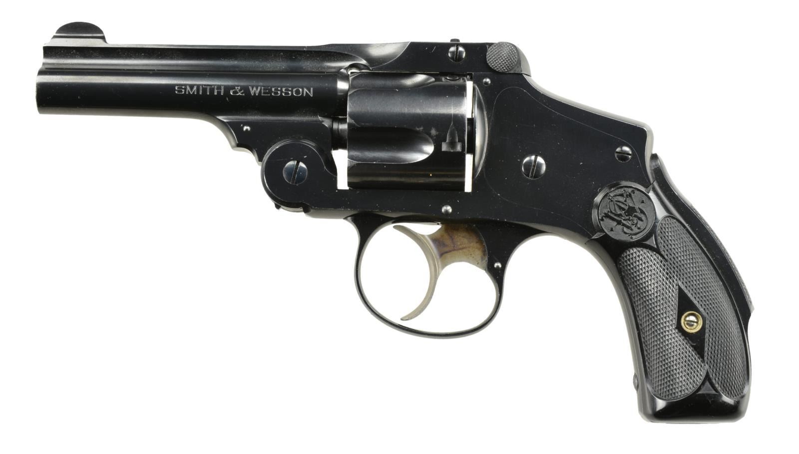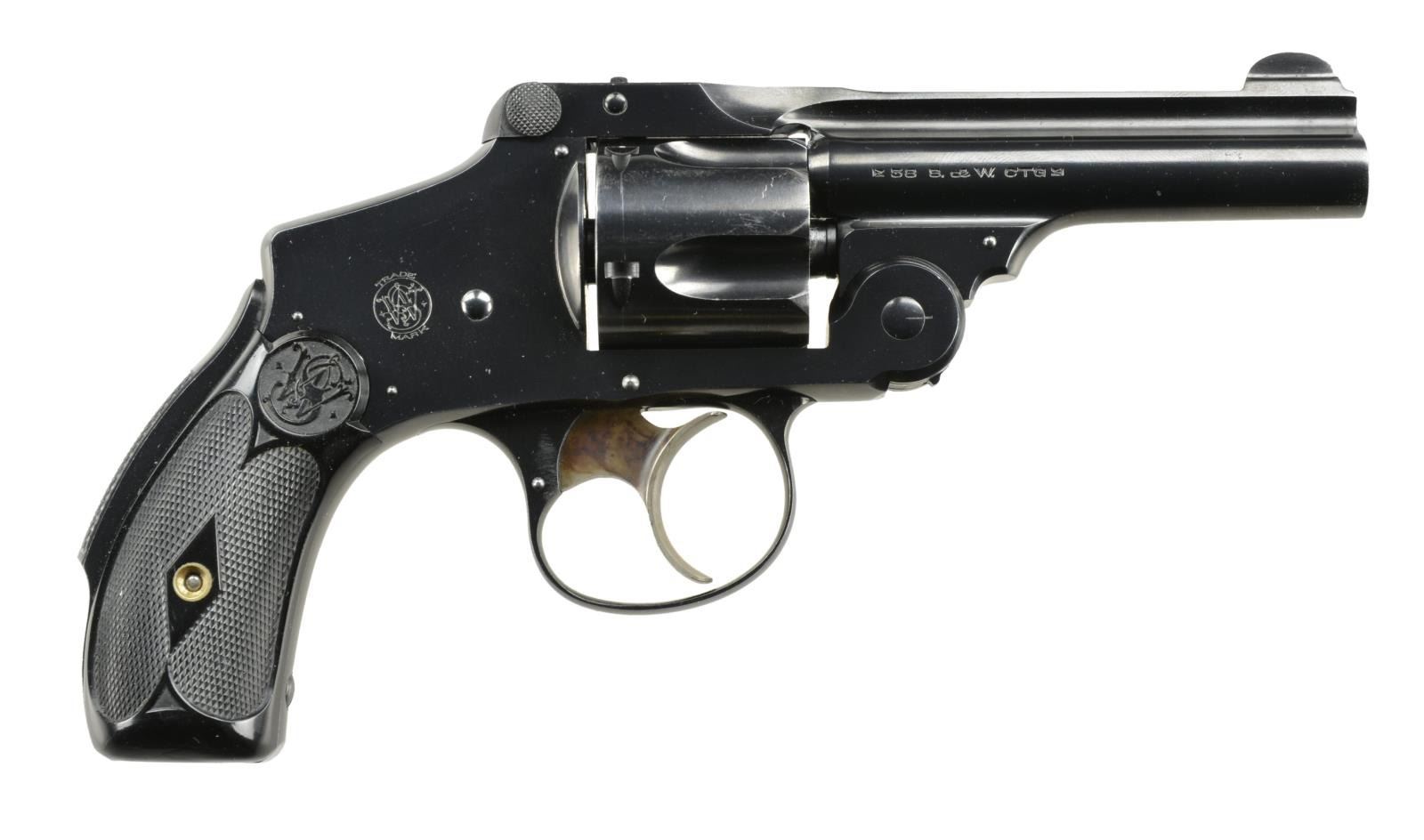REVOLVER. Cal. 38 S&W. S# 245223. Bbl. 4" w/ pinned bladed front sight. Blue finish. Unusual markings in that the cal. marking is on he right side of bbl. & "SMITH & WESSON" marking on left side of bbl. Matching numbered latch, 5 shot fluted cyl & 2 piece checkered walnut grips. CONDITION: very good blue w/ marks throughout & cyl. turn line. Very good grips. Very good bore. Grip screw appears replacement. (22-1667/MD). CURIO. $400-600.