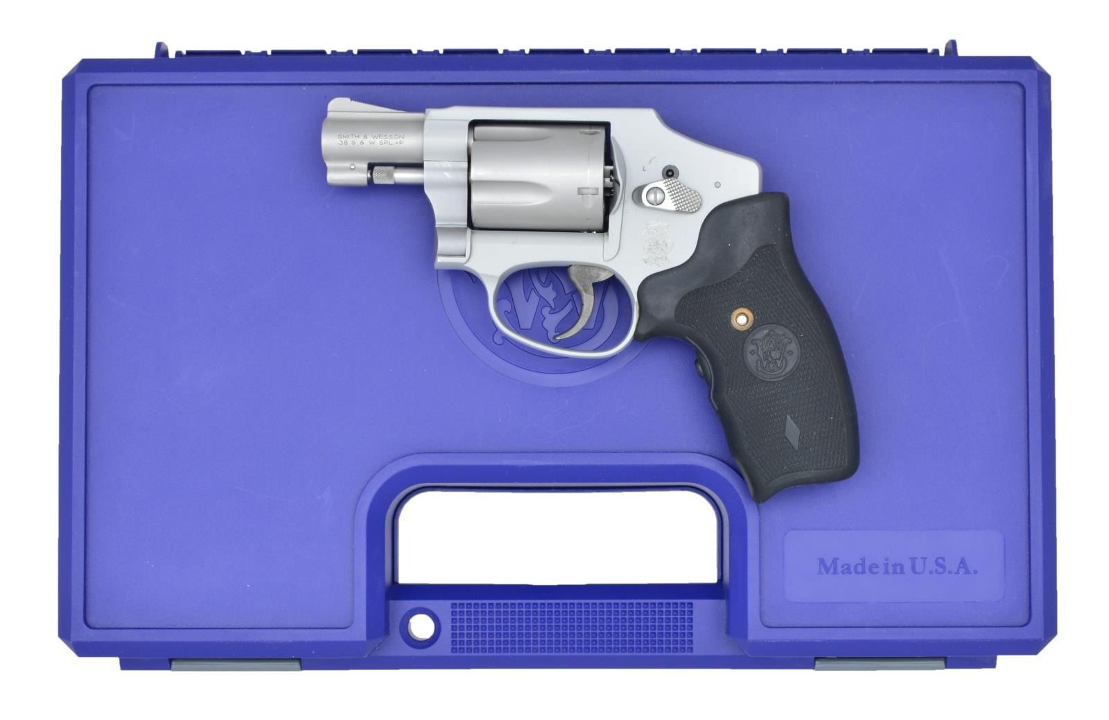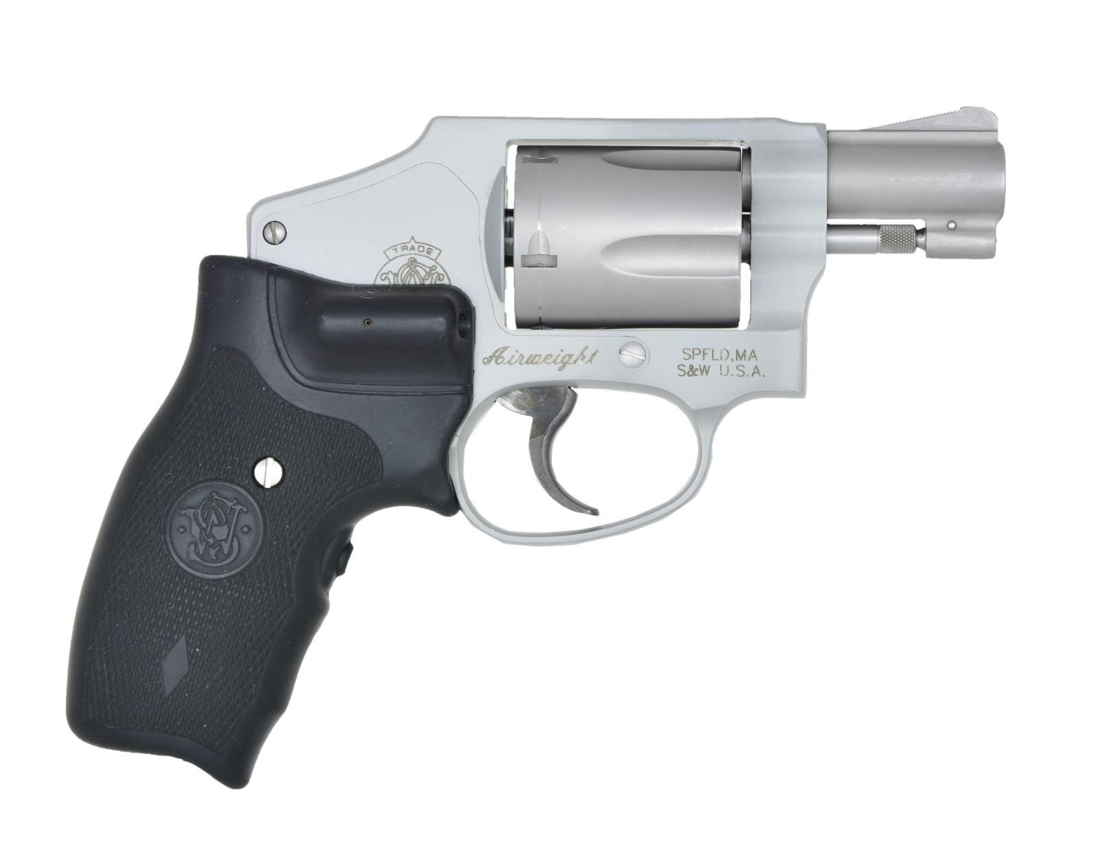 REVOLVER WITH CRIMSON TRACE GRIP. Cal. 38 Spl. (+P). S# CJJ2205 (2005). Stainless finished rnd. butt, J magnum frame w/ 2" bbl., fixed sights, 5 shot swing out cyl., hammer lock & Crimson Trace laser grip w/ S&W logo. UNATTACHED ACCESSORIES: blue plastic factory box w/ matching label containing Crimson Trace cloth, paperwork, locks & fired case. CONDITION: near excellent overall appearance w/ light handling marks & cyl. turn line. Near excellent bore. (22-1773/MD). MODERN. $350-550.