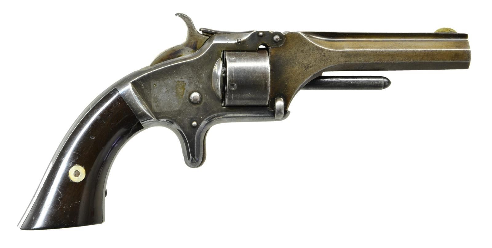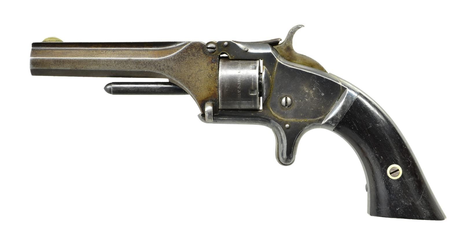 Cal. 22 Short. S# 73504. Blued frame. Standard production. 7 Shot cyl. 3 3/16" Oct. bbl. w/ makers name & address on top rib. Cyl. w/ patent dates, the latest being 1860. CONDITION: very good to fine. Bbl. retaining traces of original blue is mostly flaked to gray & brown. Action retains most of its original blue thinning on sides & silvering on sharp edges. Rosewood grips retain most of their original varnish. Fine shiny bore w/ a few scattered pits. Mechanically good. (01-20921/MGM). ANTIQUE. $350-550.