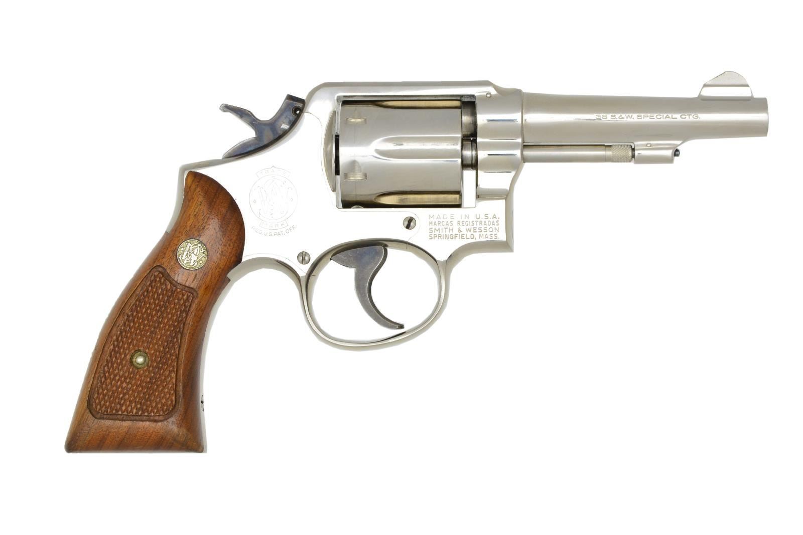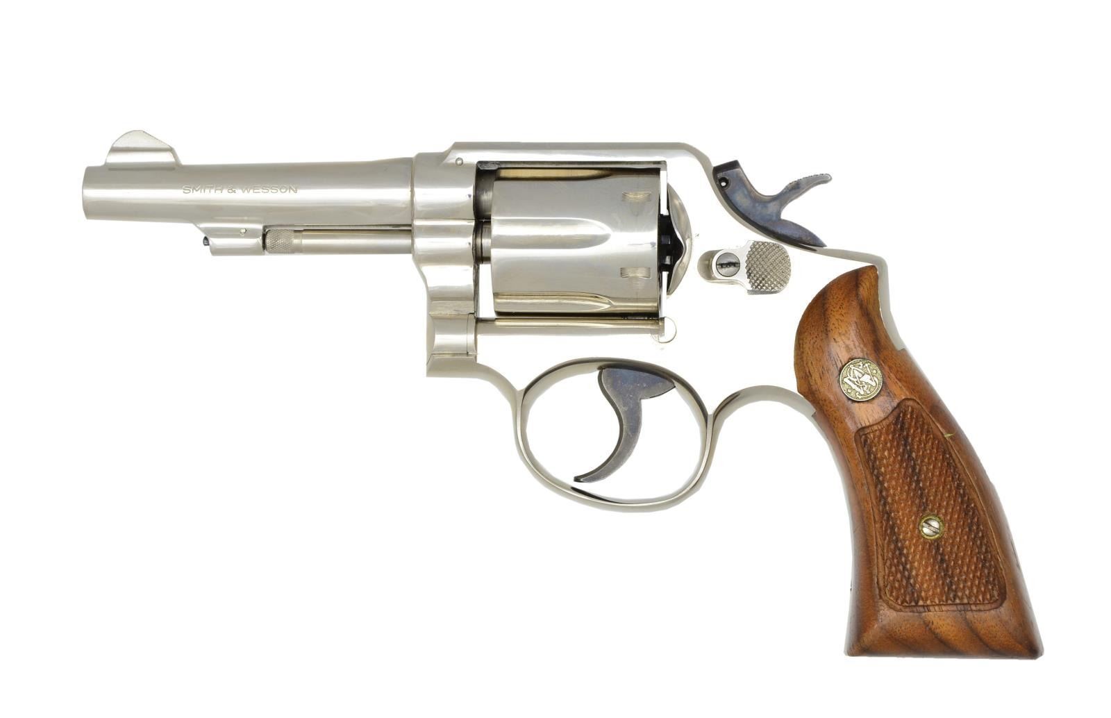 Cal. 38 Spl. S# D529671 (1973-1974). Nickel finished K frame w/ 4" bbl., fixed sights, 6 shot fluted swing out cyl. & 2 piece border checkered walnut Magna grips w/ S&W medallions. Case colored combat hammer & grooved trigger. CONDITION: near excellent overall appearance w/ light handling marks throughout & cyl. turn line. Near excellent bore. (22-1661/MD). MODERN. $300-500.