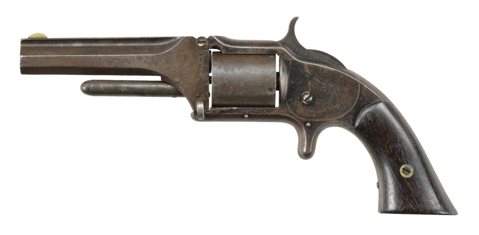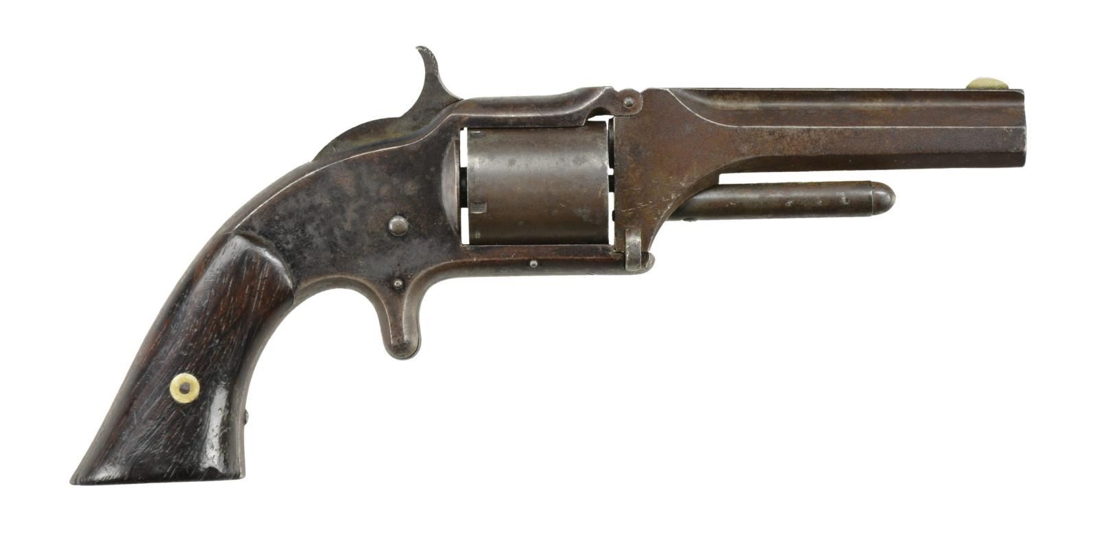 Cal. 32 RF. S# 14895. Bbl. 3 1/2" w/ half moon front sight on rib. Tip up action w/ 5 Shot cyl. 2 Piece rosewood grips. CONDITION: Fair metal brown patina w/ oxidation, marks & pitting. Good varnish on grips w/ light gouges. Good bore w/ pitting. PROVENANCE: from the estate collections of Charles P. Obremski. (01-20847/MD). ANTIQUE. $300-500.