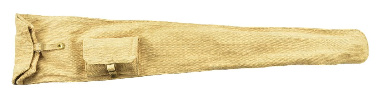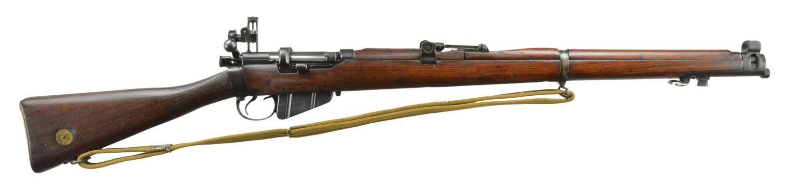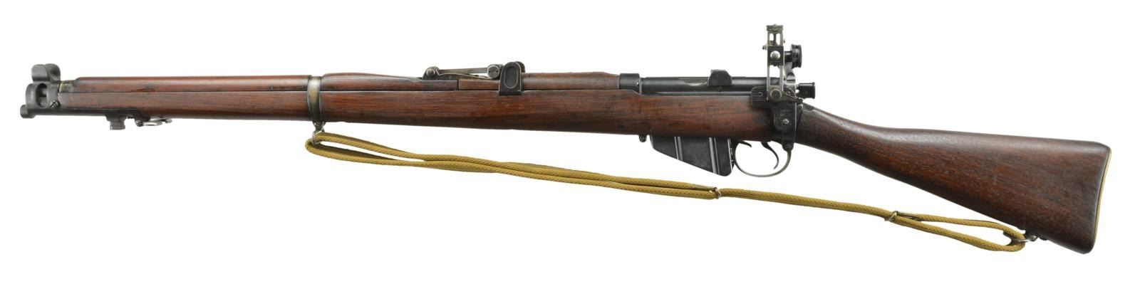 APERTURE SIGHT AND BAG. Standard issue w/ 25" bbl. is marked w/ royal crown over "GR", BSA CO.", 1914", "SMLE" & "III" on right side of stock socket. A Centoral receiver sight is affixed to left side. This sight was made in Australia & examples are fairly scarce. Base uses existing holes for mounting. Buttstock has brass disc marked "O.TC", "FTS", "145". UNATTACHED ACCESSORIES: green painted tin box for sight contains original safety retainer and short screw for trigger guard. Canvas carrying case marked "J. & A.H. 1944". CONDITION: very good as refinished. Metal parts retaining nearly all of a reblue. Stocks with light overall refinishing have some subsequent marks. Fine bore with some slight throat erosion. Mechanically good. Sight is very fine, base appears to be retemper blued. Box has new green paint over original red lacquer. PROVENANCE: from the estate collections of Charles P. Obremski. (22-1351/MGM). CURIO. $500-800.