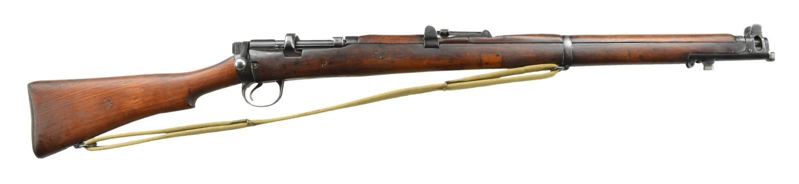 Cal. 410 Ga. S# V14207. Standard issue configuration w/ BSA markings on right butt socket. Left side marked ".410" "RFI" "1947". The cartridge was the .303 w/ straight case, & modern .410 shot shells will not chamber. These guns were issued to Indian police. Replacement buttstock w/ cast brass buttplate is stamped "TDE" on right side. A web sling is installed. UNATTACHED ACCESSORIES: gun comes with an unmarked canvas carrying case. CONDITION: good as refurbished. Metal parts retaining most of their blue & are smooth. Front section of wood shows repairs. Newer butt w/ most of its original finish. PROVENANCE: from the estate collections of Charles P. Obremski. (22-1350/MGM). CURIO. $200-400.