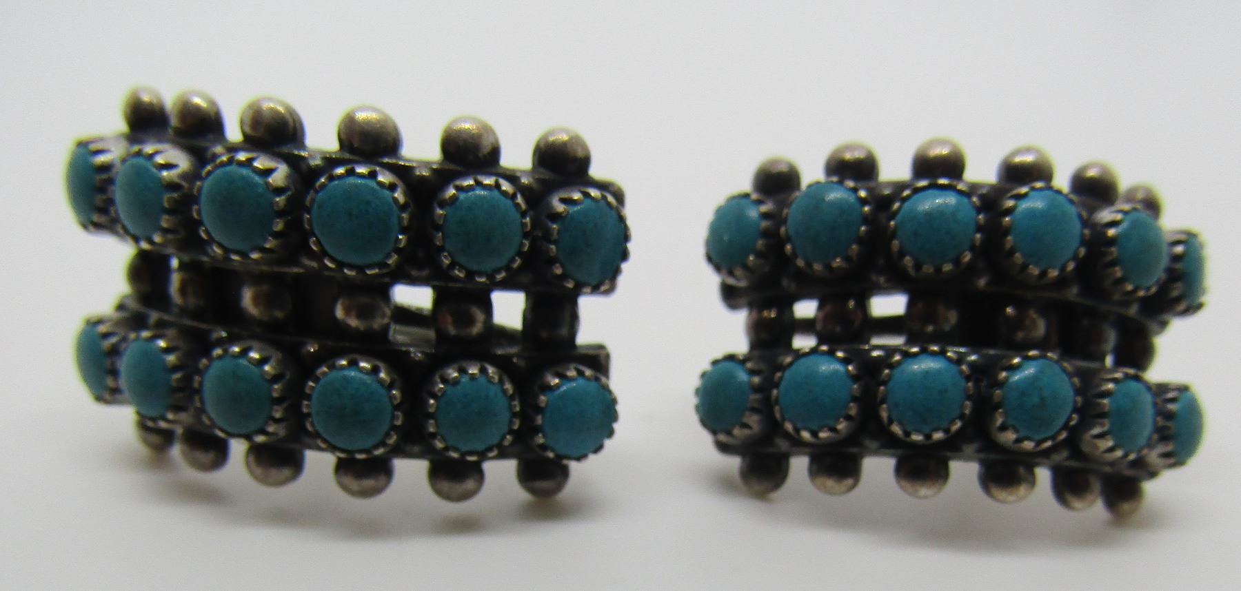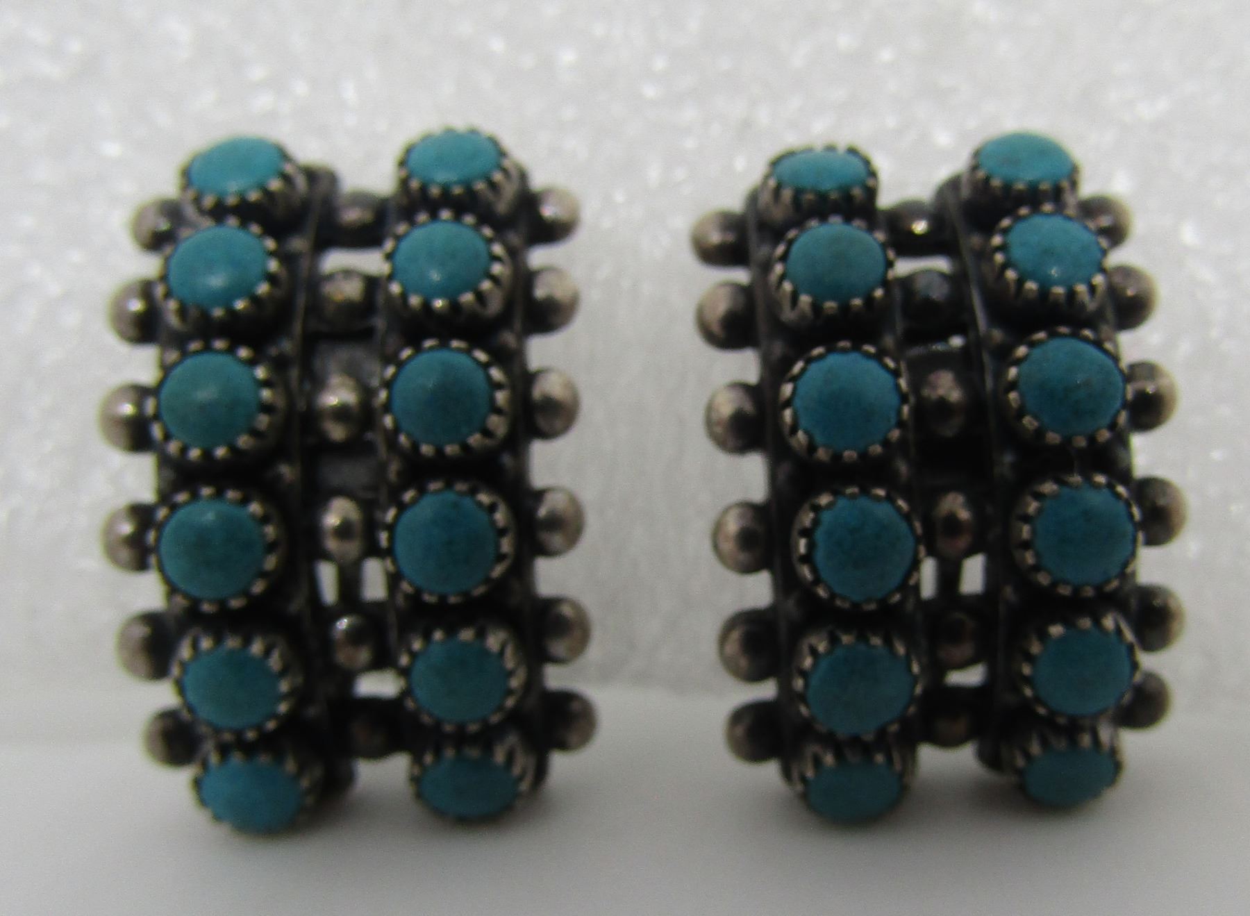 FRED HARVEY ERA VINTAGE ESTATE NATIVE AMERICAN SOUTHWEST INDIAN JEWELRY. BEZEL MOUNTED WITH 24 TURQUOISE STONES. SCREW BACK, MEASURE 14MM WIDE BY 20MM LONG. MARKED "STERLING" WEIGH 8.7 GRAMS. USASHIPPING $5.