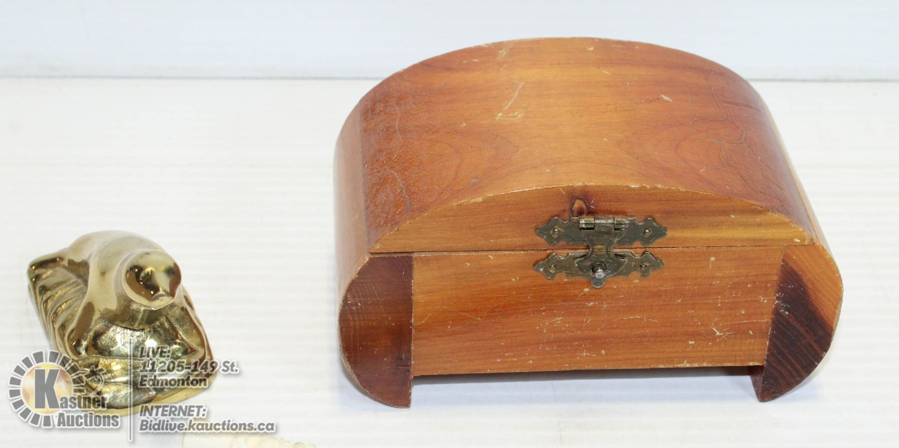 SOLID BRASS SEAL, WOODEN TRINKET BOX & ANTIQUE